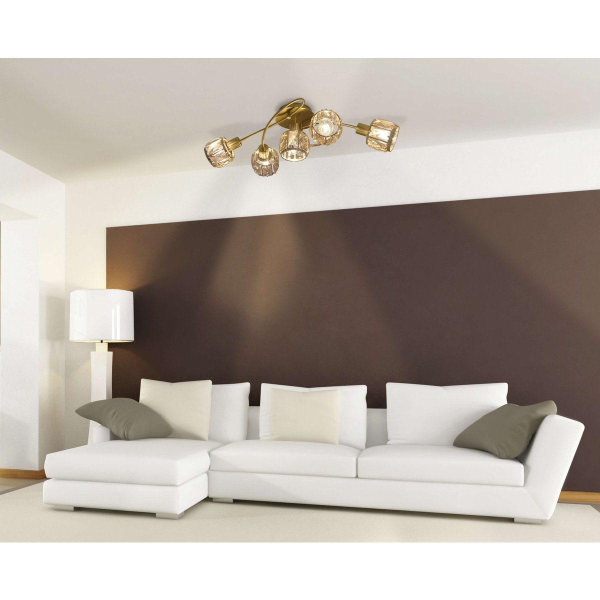 De Josefa plafondlamp met 5 lichtpunten is een stijlvolle combinatie van retro chic en klassieke elegantie. Dankzij het verfijnde ontwerp met gefacetteerd glas en een koperen frame straalt deze lamp direct warmte en karakter uit. De zachte tinten van het glas zorgen samen met het warme licht voor een sfeervolle uitstraling die perfect tot zijn recht komt in de woonkamer, eetkamer of hal.