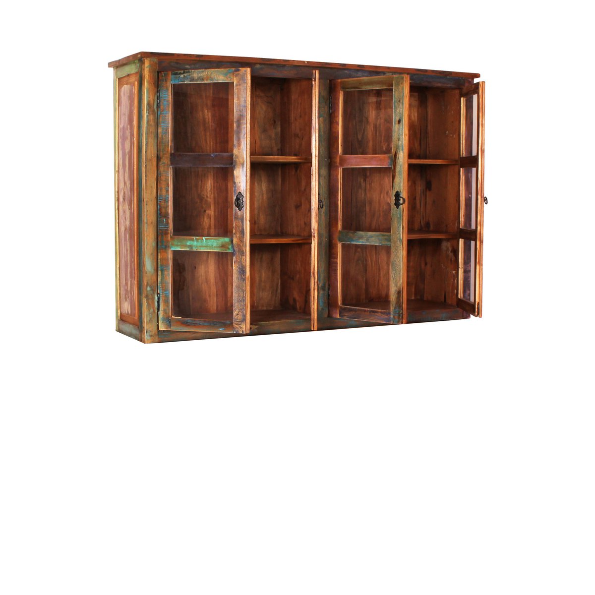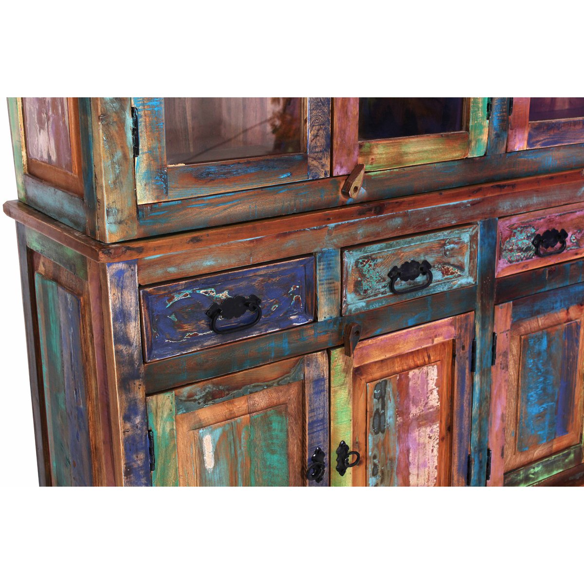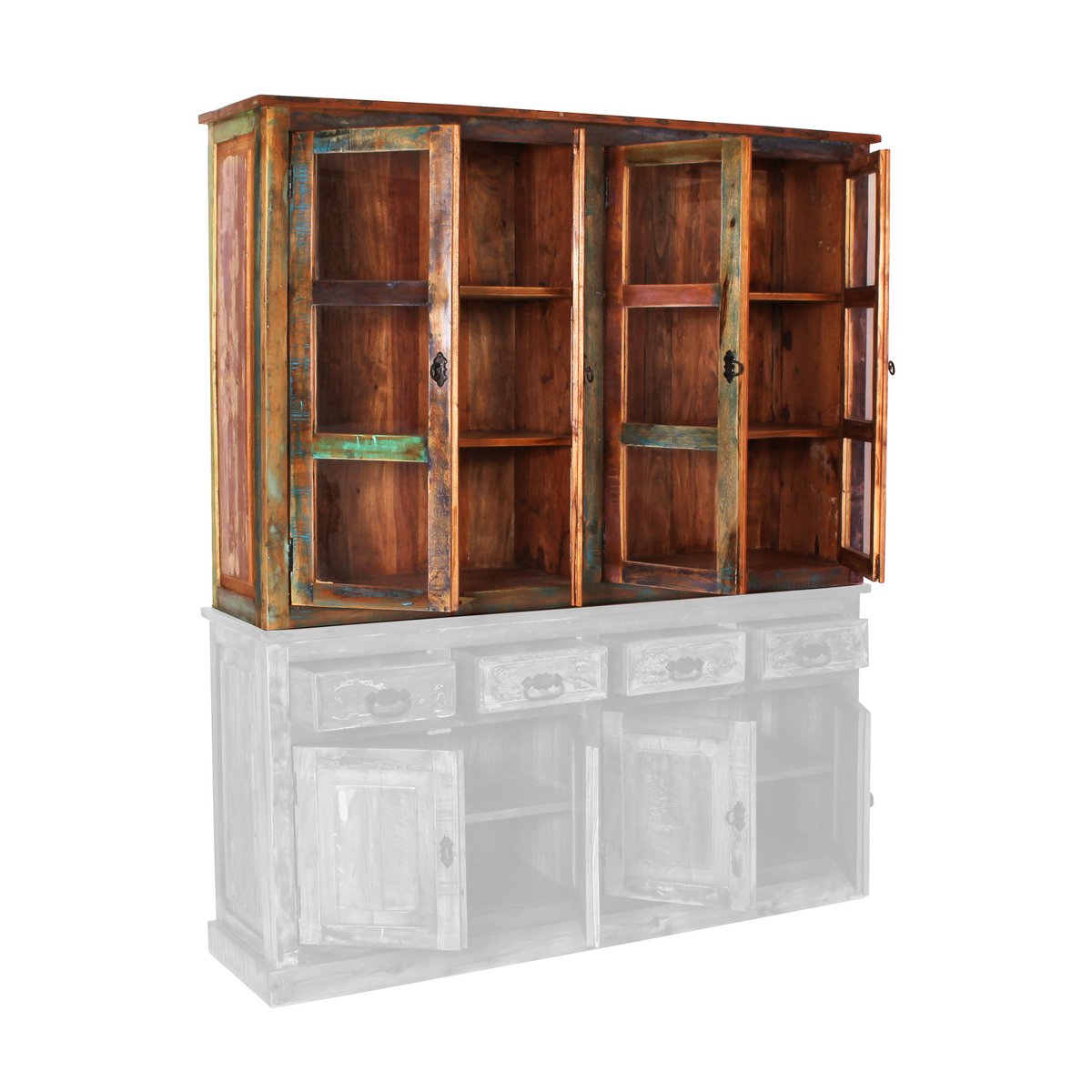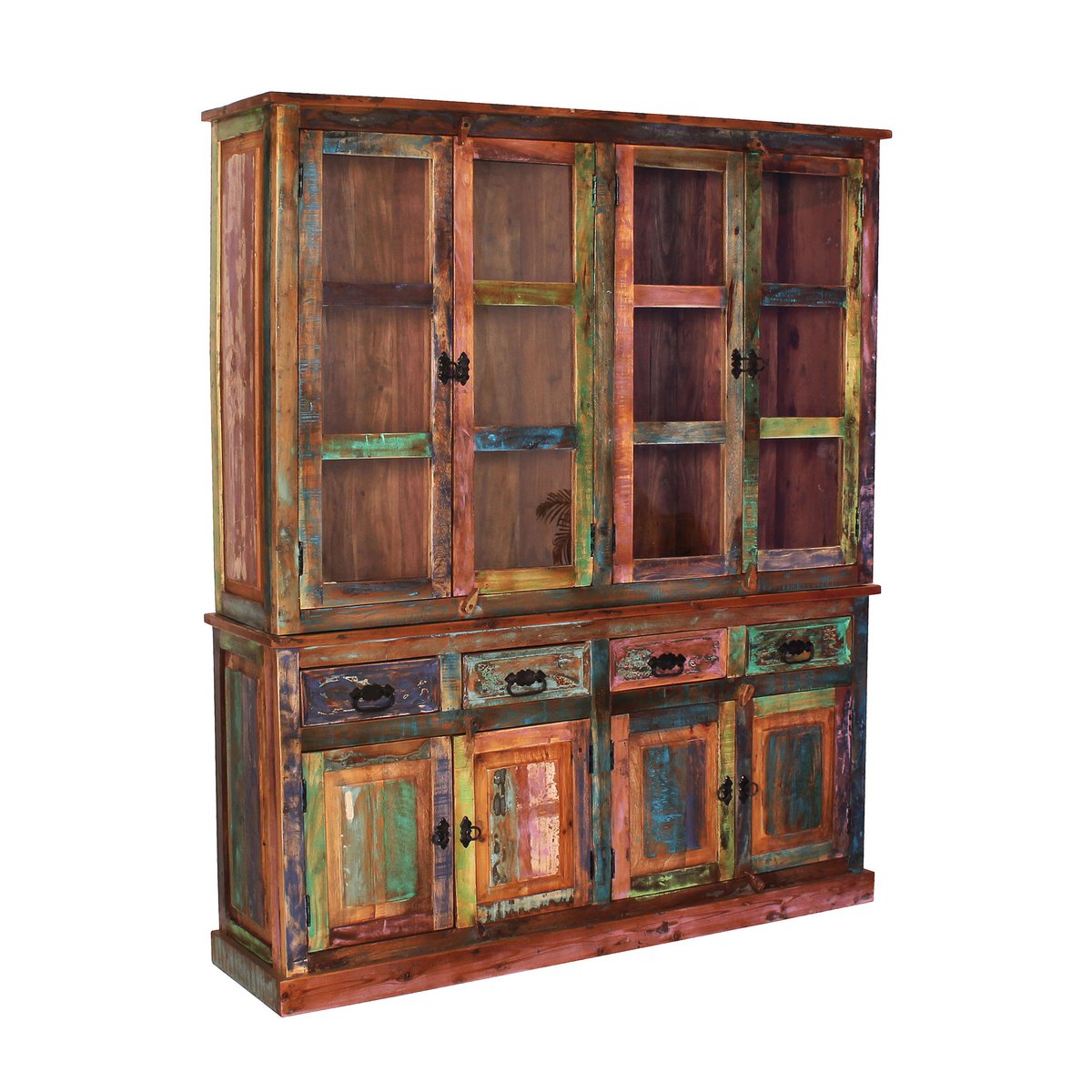 Dit kastopzetstuk van kleurrijk oud hout in shabby chic maakt van uw dressoir in een handomdraai een groot buffet met veel opbergruimte achter 4 deuren met sfeervolle tralieramen. Het is een echte eyecatcher en veelzijdig inzetbaar dankzij de mogelijkheid om het te combineren met bestaand meubilair. Gemaakt van FSC-gecertificeerd hout. Geschikt voor dressoir 09113-98, 2 vaste planken, afmeting bovenste vak 76×34,5×36 cm, midden en onderkant 76×34,5×31,5 cm