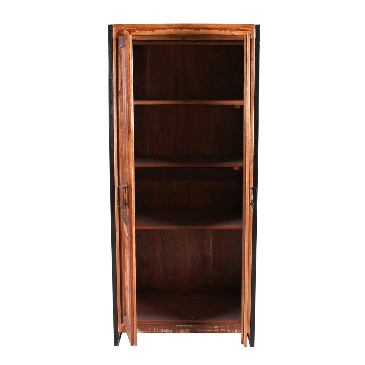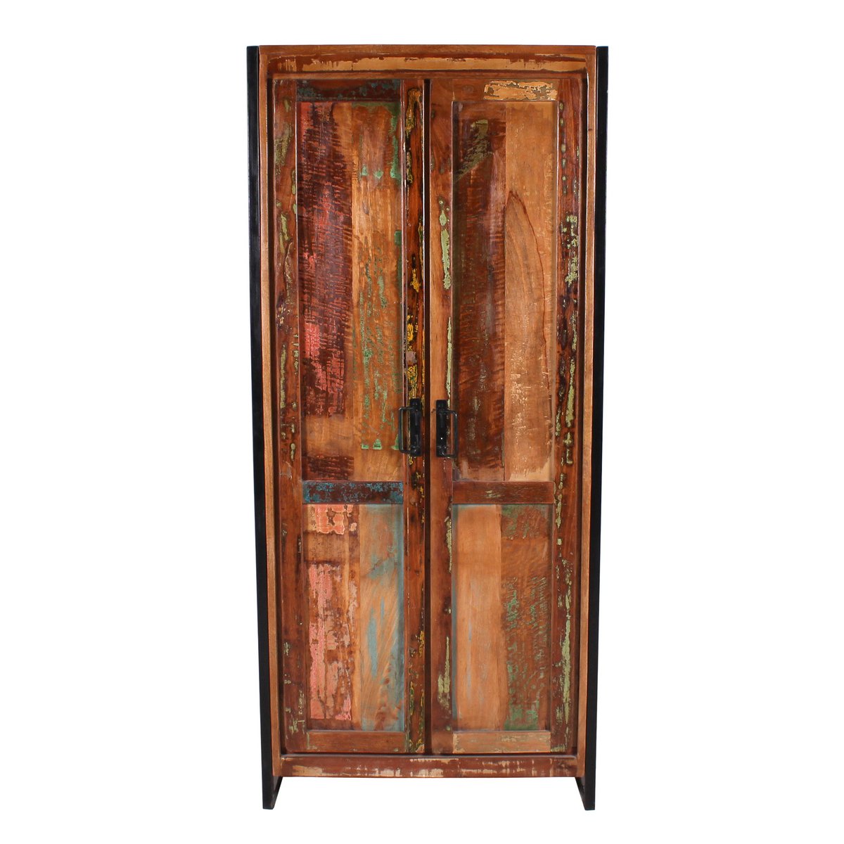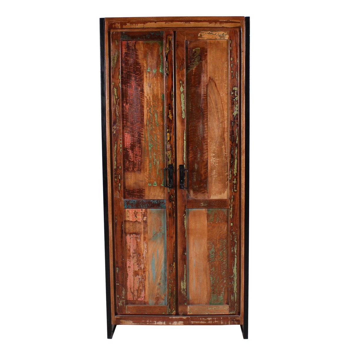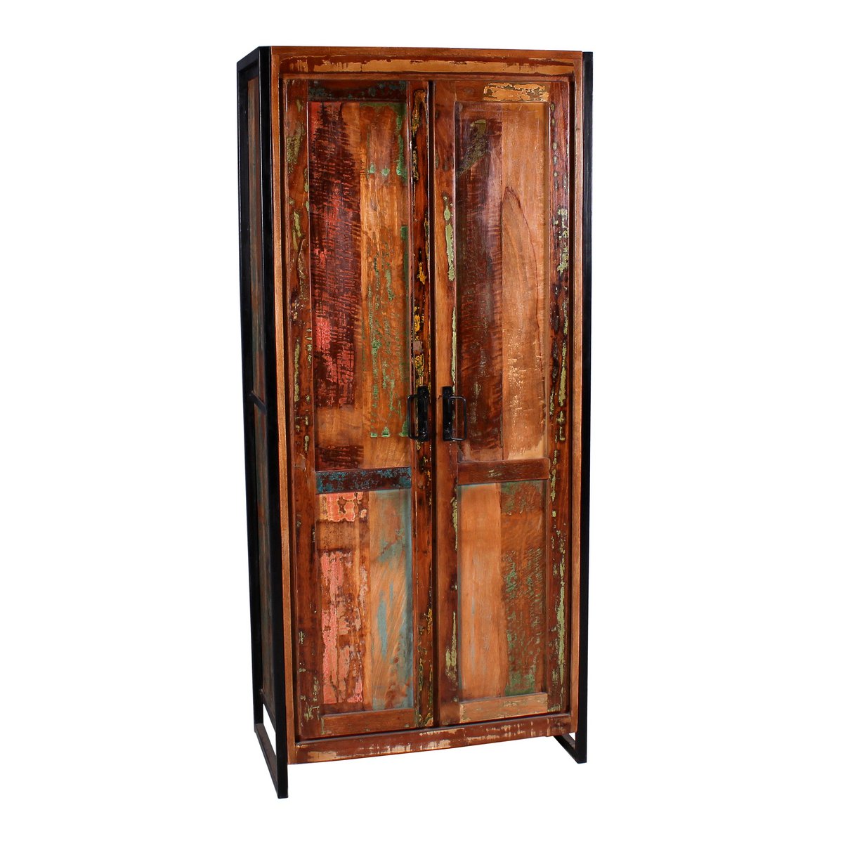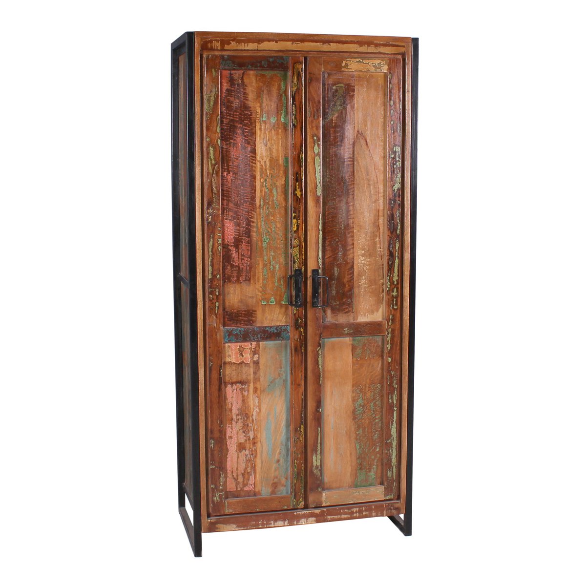 Haal een vleugje vakantie direct in huis met deze kledingkast. De kast biedt achter 2 ondoorzichtige draaideuren op 3 planken voldoende opbergruimte voor veel spullen. Voor boekenverzamelaars die van lezen houden, is het meubel ook ideaal als boekenkast. Zelfs dossiermappen zouden hier een plaats hebben als dit meubel als kantoorkast of archiefkast zou dienen. De toepassingsmogelijkheden van dit prachtige meubelstuk zijn vrijwel onbeperkt, zowel privé, in praktijken als in advocatenkantoren. Gemaakt van oud, massief hout van vissersboten, waardoor het de populaire vintage look krijgt, omlijst door een zwart metalen frame, dat opzettelijk is bijgesneden om er oud uit te zien om ook hier het trendy fabrieksontwerp te kunnen creëren. De afdekplaat is geschikt voor diverse decoratiemogelijkheden en laat de schoonheid van de kast goed tot zijn recht komen. Binnenkant 3 planken, 1 kledingroede Afmetingen binnenkast: 155 x 68 cm