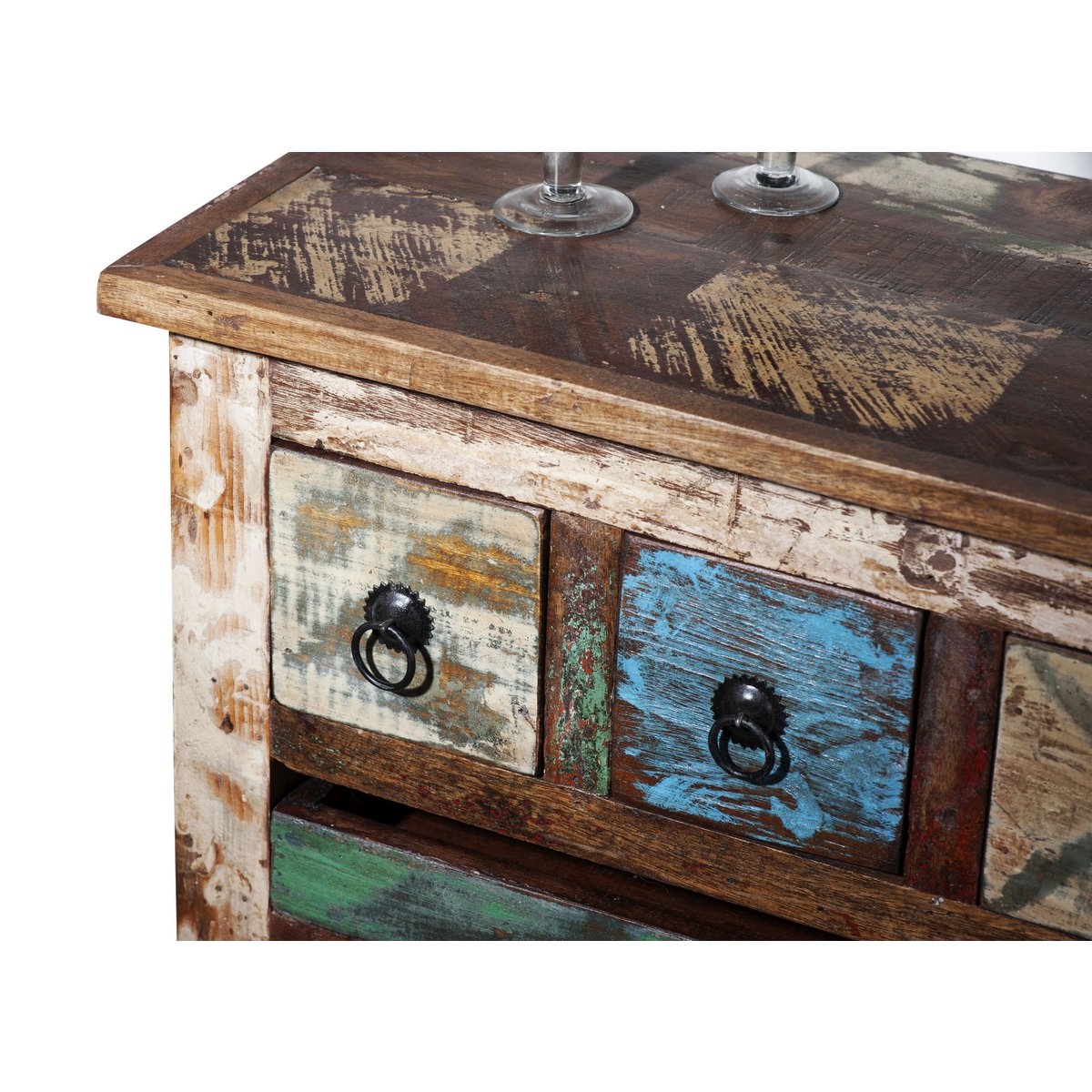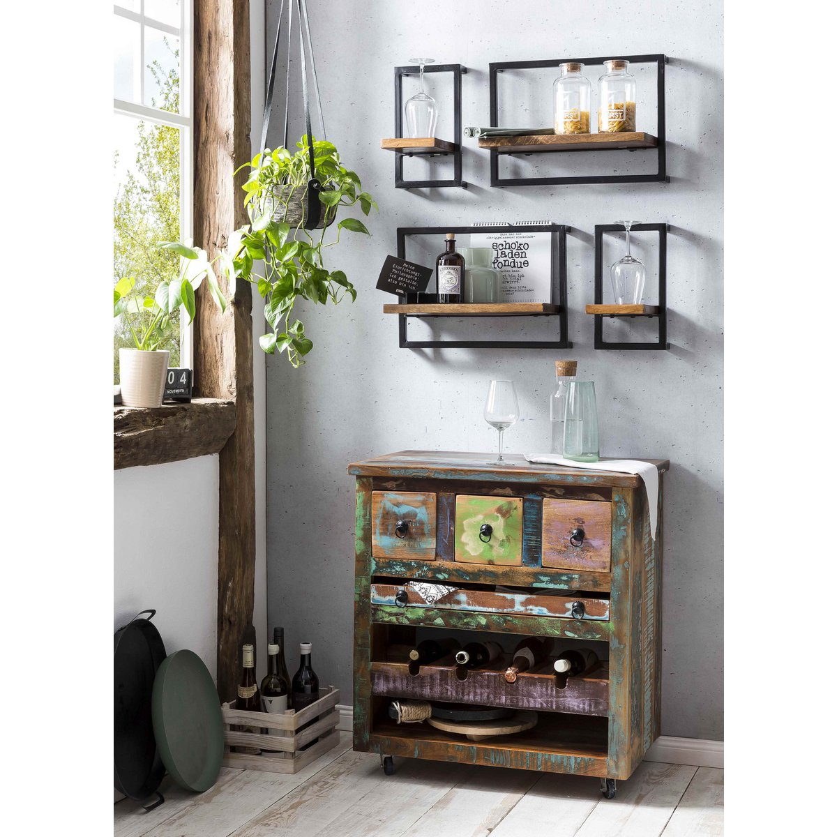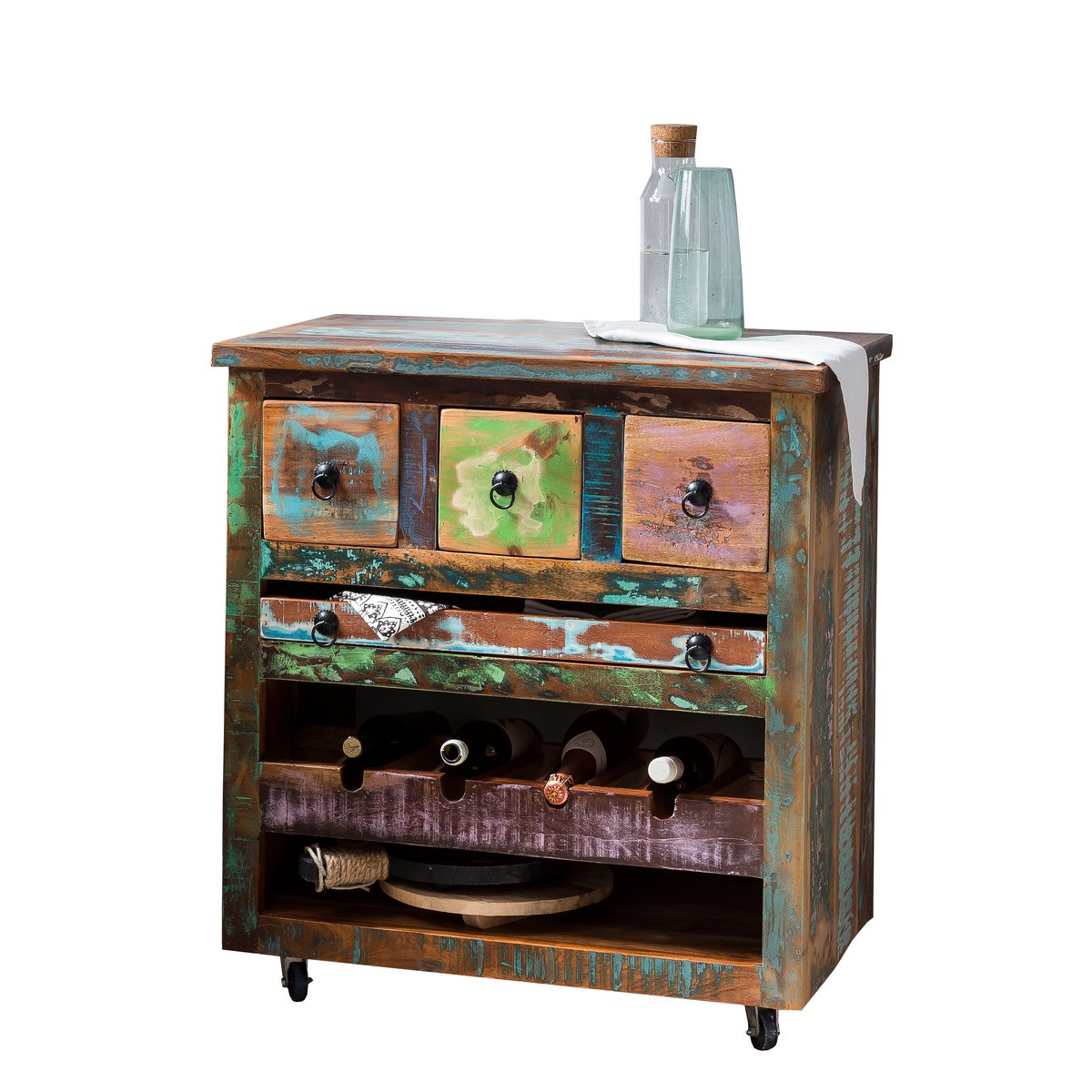 Compact en slim – De combinatie van geverfd oud hout en zwart metalen beslag geeft de keukenwagen zijn rustieke charme. Met een flessenrek voor vier flessen, een open plank, een uitneembaar dienblad en drie lades is de kar een praktische hulp in de keuken of eetkamer. De trolley kan worden gebruikt als rustieke thuisbar of zorgt er dankzij de wielen voor dat flessen, glazen en accessoires gemakkelijk van de keuken naar de eetkamer kunnen worden vervoerd tijdens gezellige bijeenkomsten aan de eettafel. De keukentrolley is gemaakt van kleurrijk geverfd hergebruikt hout. Verschillende kleurgradaties en structuren maken elke auto uniek. Of het nu gaat om een blikvanger in een eenvoudige sfeer of als onderdeel van een moderne inrichting in fabrieksdesign: de keukentrolley is een chique aanvulling op vele woonstijlen. De moderne materiaalmix combineert een shabby en industriële look. Lades binnenkant: 9×23,5×11 cm, bakje: 42x25x4 cm, dikte van de afdekplaat 2 cm, draagvermogen 40 kg