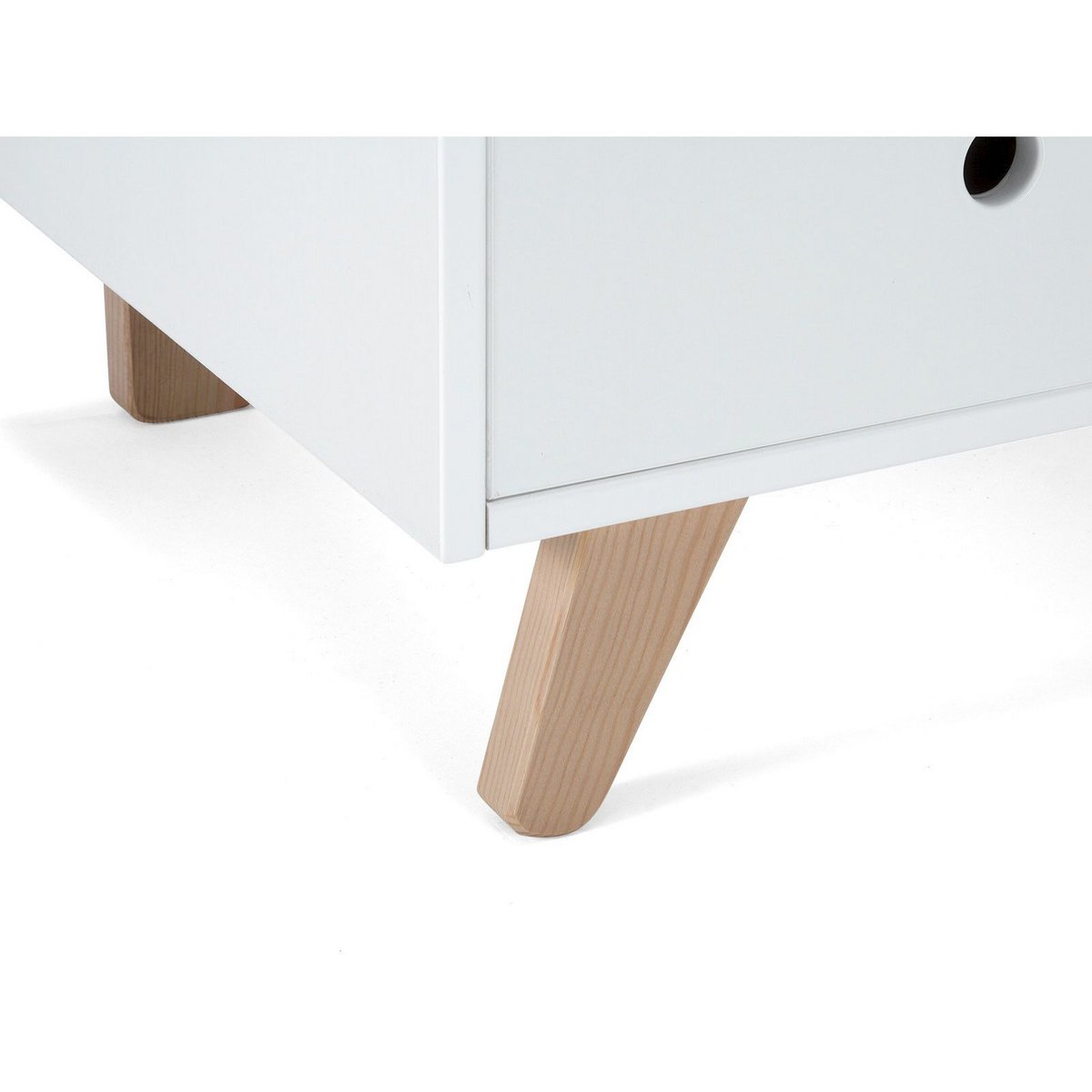Deze kledingkast in klassiek Scandinavisch design zorgt op speelse en stijlvolle wijze voor orde in de kinderkamer. De Scandinavisch-moderne kleurencombinatie van de witgeverfde romp en natuurlijk hout maken de kledingkast tot een blikvanger. In de kast zorgen een kledingroede en een plank ervoor dat de kleding van je kind optimaal kan worden opgeborgen. De lade biedt extra opbergruimte. De moderne uitstraling van de kledingkast wordt nog eens benadrukt door de greeploze uitstraling; In plaats van opvallende handgrepen zijn in de deuren en lades eenvoudige vingergaten gebruikt. Schuine grenenhouten poten geven de kast een bijzonder eigentijdse uitstraling. De resulterende verhoging maakt niet alleen het schoonmaken gemakkelijker, maar geeft de kledingkast ook een luchtige uitstraling, zodat hij zelfs in kleine ruimtes niet te massief overkomt. De kledingkast in Scandinavische stijl zorgt voor veel ruimte en een bijzondere sfeer die zorgt voor een aangenaam binnenklimaat in de kinderkamer.