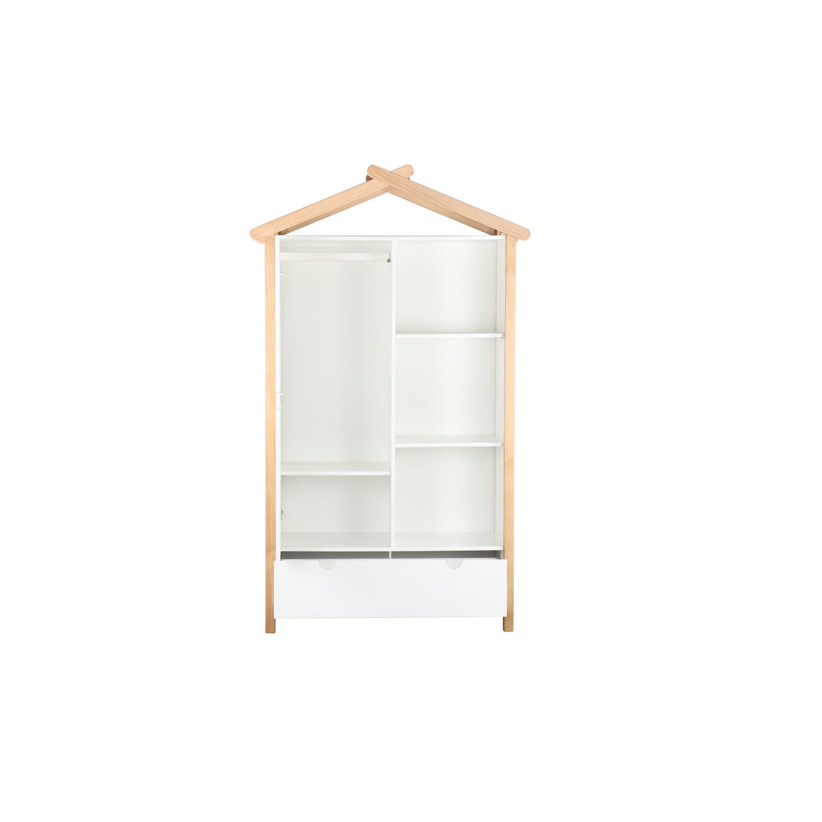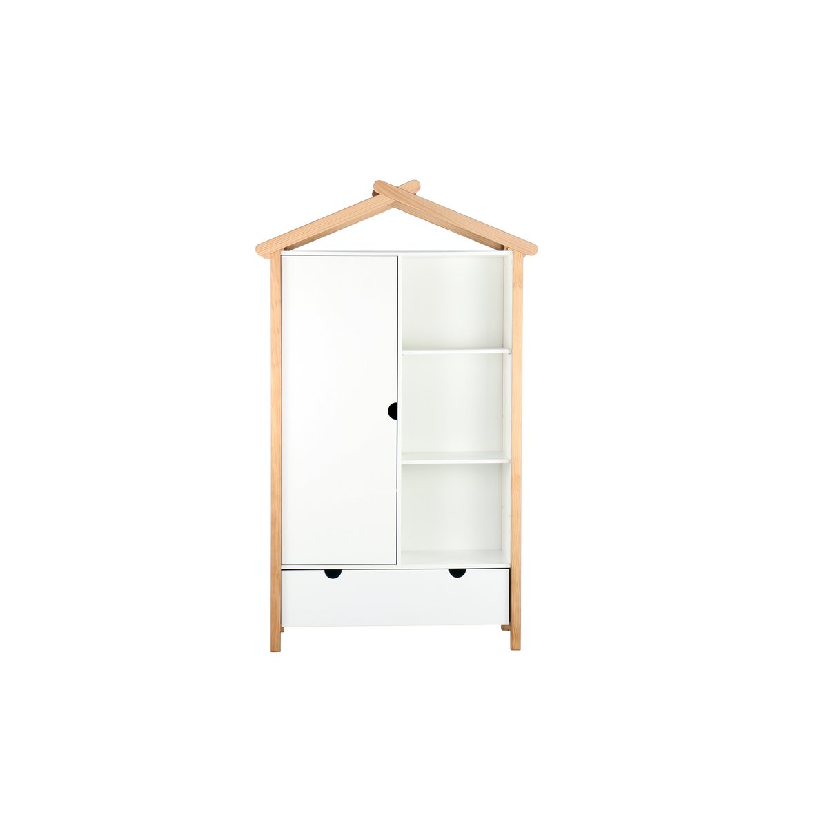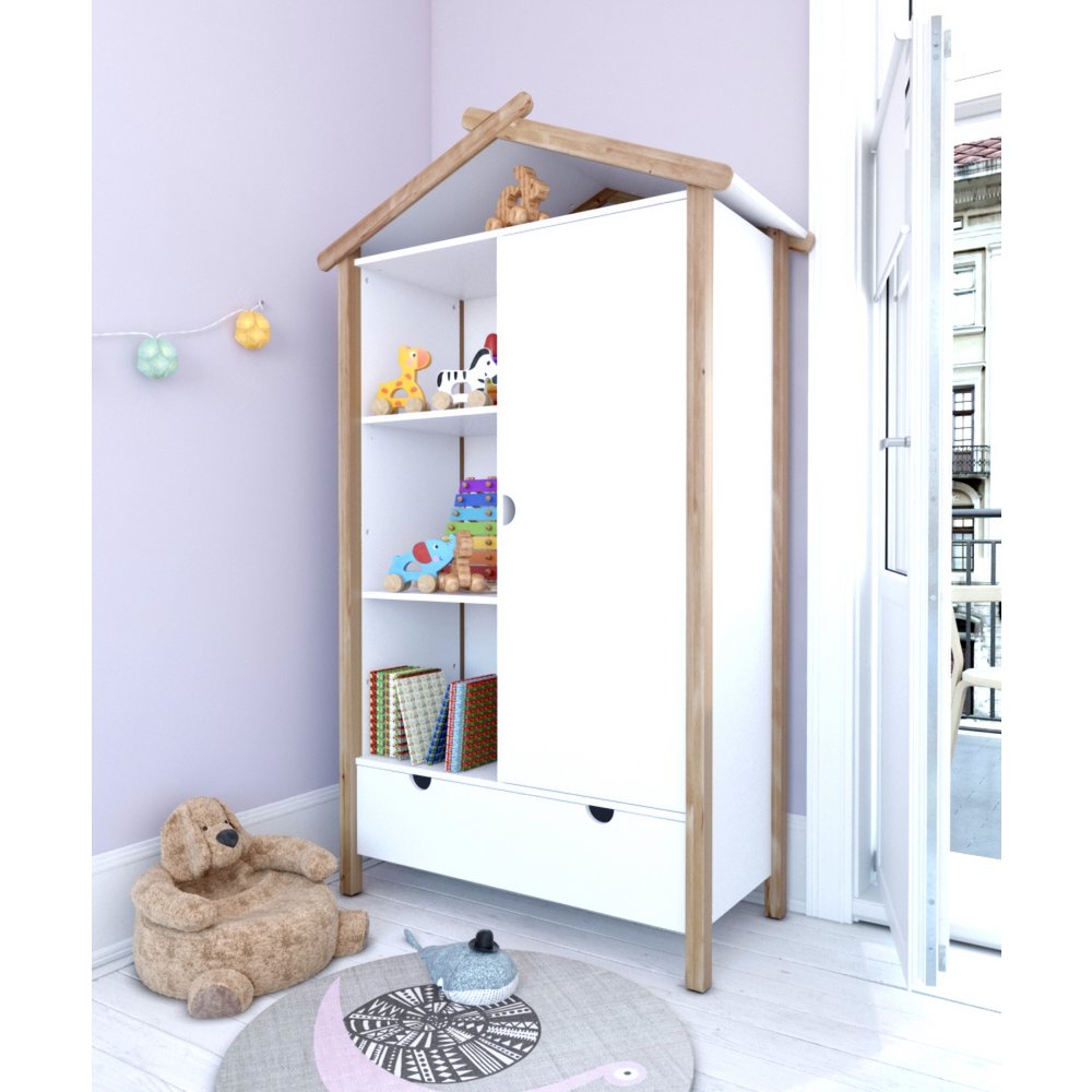 Deze kledingkast in huisvormig design laat zien dat het ook bij de inrichting van de kinderkamer bijzonder kan zijn. Deels open en deels gesloten opbergruimte biedt voldoende ruimte om de kinderkamer netjes te houden. Achter de linkerdeur bevindt zich een kledingroede en nog een plank. De kast is gemaakt van robuust grenenhout en biedt met zijn Scandinavische eenvoudige elegantie een moderne uniseks oplossing voor een breed scala aan kinderkamerinrichtingen en leeftijden.