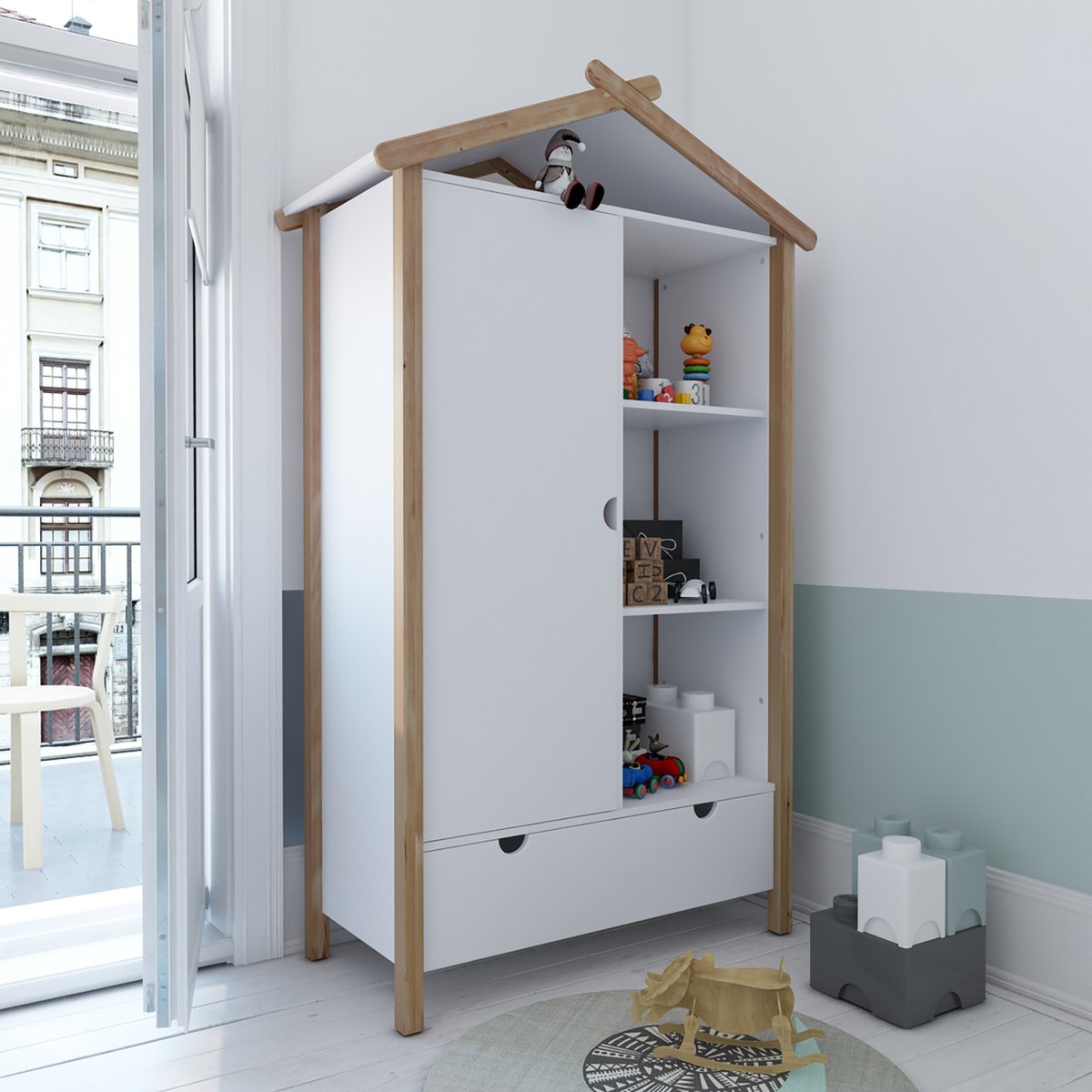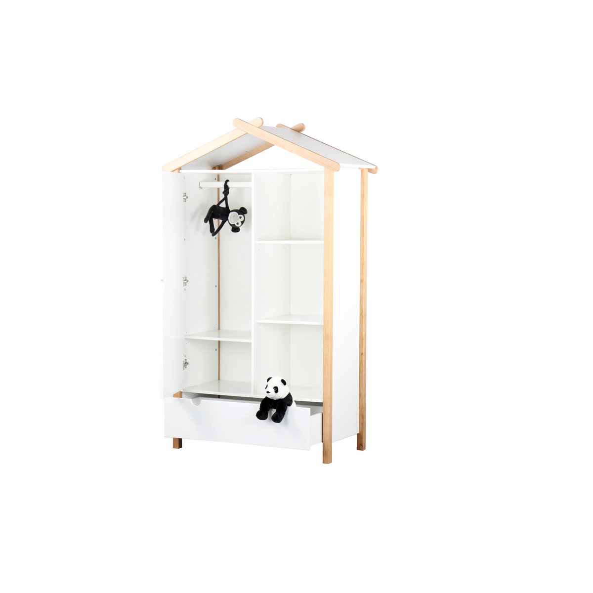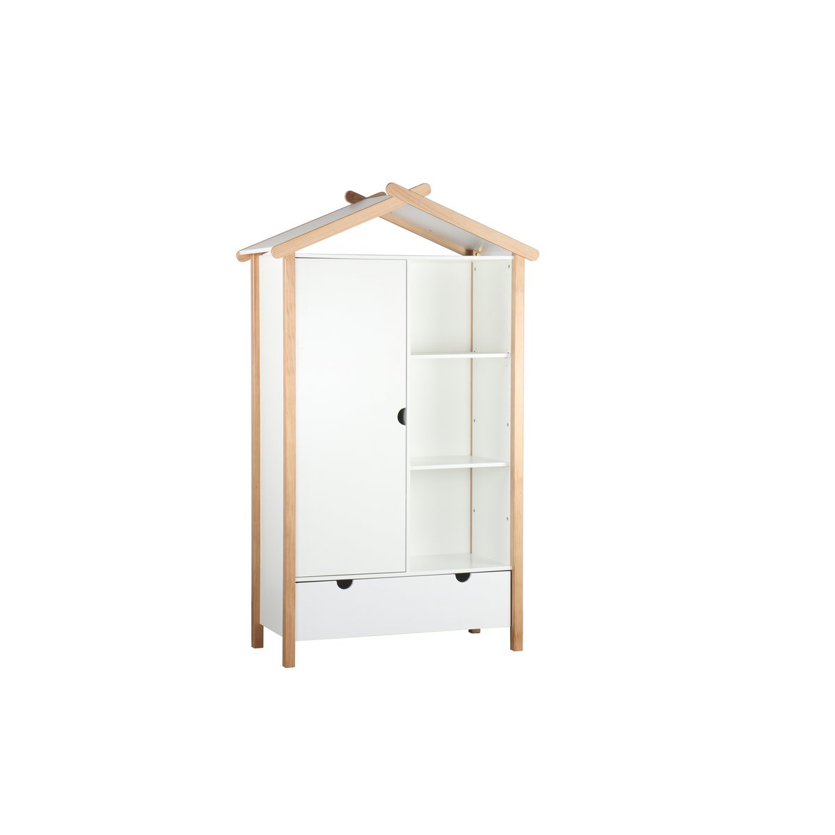 Deze kledingkast in huisvormig design laat zien dat het ook bij de inrichting van de kinderkamer bijzonder kan zijn. Deels open en deels gesloten opbergruimte biedt voldoende ruimte om de kinderkamer netjes te houden. Achter de linkerdeur bevindt zich een kledingroede en nog een plank. De kast is gemaakt van robuust grenenhout en biedt met zijn Scandinavische eenvoudige elegantie een moderne uniseks oplossing voor een breed scala aan kinderkamerinrichtingen en leeftijden.