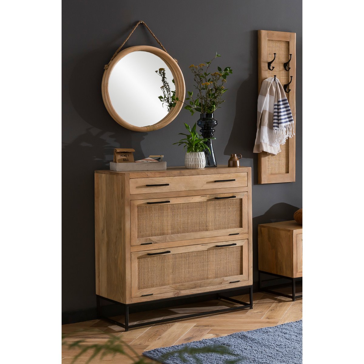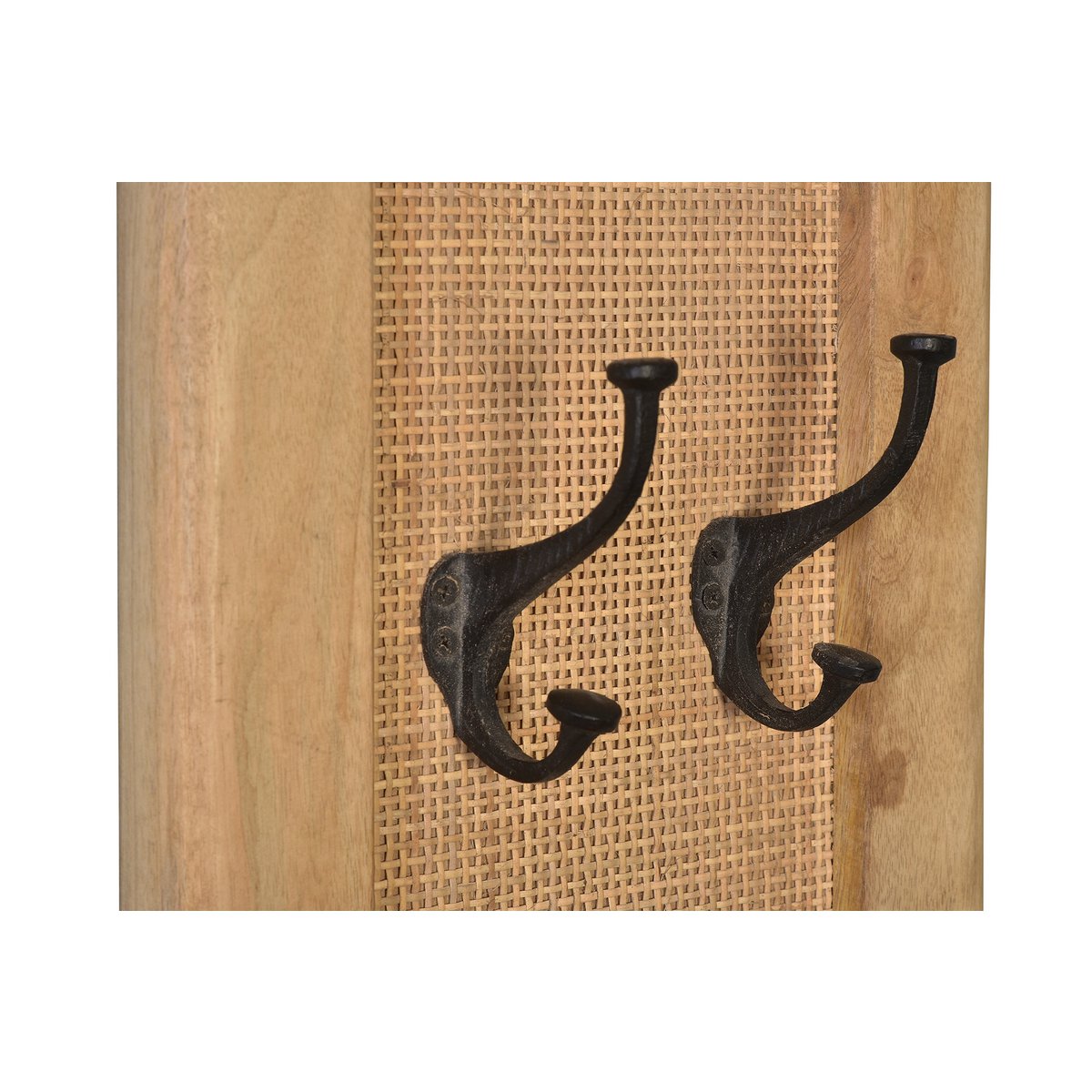 Verfraai uw gang met dit kledingkastpaneel van natuurlijk gekleurd mangohout met luchtig rotan. Het kledingkastpaneel is veelzijdig inzetbaar dankzij de mogelijkheid om het te combineren met bestaand meubilair, waardoor het perfect past bij de trendy industriële look, maar ook prima te combineren is met landelijke meubelen of Scandinavisch design. Hij biedt ruimte voor jassen, jassen of tassen aan 4 dubbele haken, terwijl de uitstraling en moderne materiaalmix zorgen voor een huiselijke sfeer in je gang. Houten frame met rotan inzetstuk.