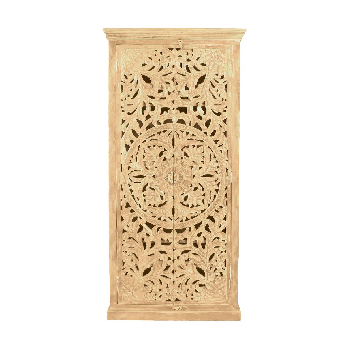 Deze moderne kledingkast van mangohout is een echte blikvanger in de hal, slaapkamer of entree. Het warme hout en het verfijnde houtsnijwerk op de deuren geven de kast een bijzondere oosterse uitstraling. Daardoor is dit meubel niet alleen praktisch, maar ook een decoratief statement in uw interieur.