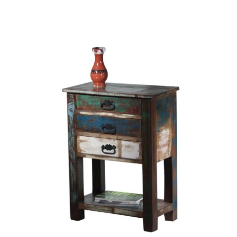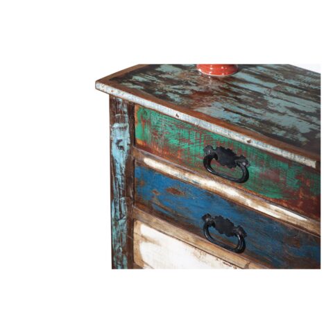 Deze bijzondere ladekast van kleurrijk oud hout brengt direct sfeer en karakter in huis. De shabby chic uitstraling en het gebruik van gerecycled hout van vissersboten maken dit meubel tot een echte blikvanger. Dankzij het unieke kleurenspel en de doorleefde afwerking is geen enkel exemplaar hetzelfde. Hierdoor voegt deze kast een warme, authentieke uitstraling toe aan zowel moderne als landelijke interieurs.
