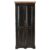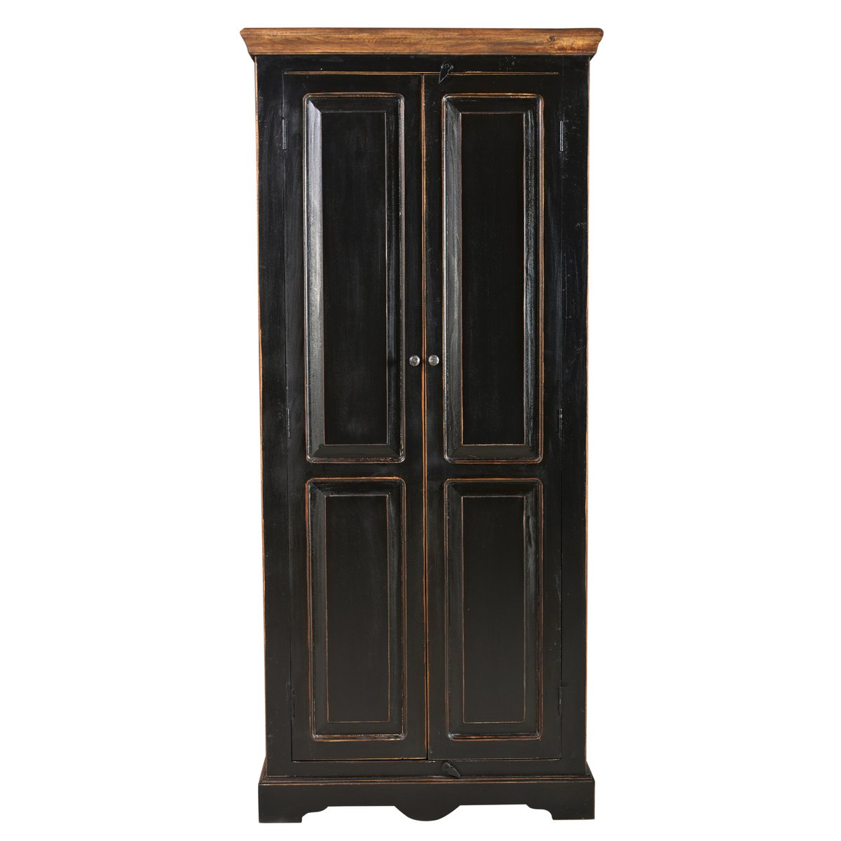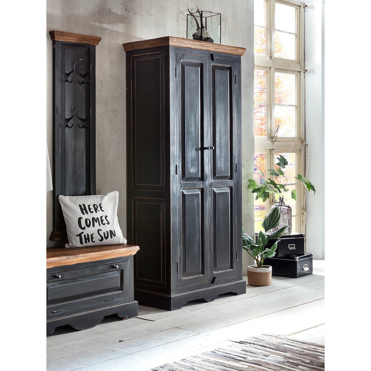 Het donkere hout met bewust aangebrachte gebruikssporen geeft de kast een authentieke uitstraling, terwijl het honingkleurige bovenblad zorgt voor een warm contrast. Dankzij de combinatie van legplanken en een losse kledingroede is dit meubel zowel decoratief als functioneel.