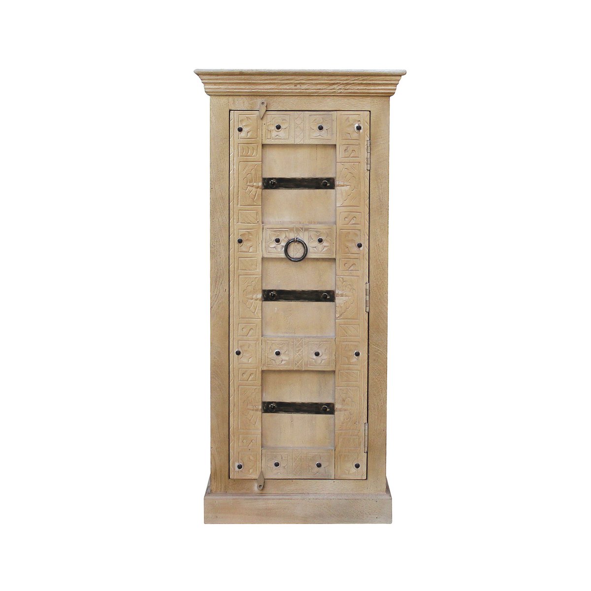 Deze hoge kast van mangohout straalt de charme uit van Indiaas koloniaal design. Het gedetailleerde snijwerk en de metalen accenten op de voorkant geven het meubel een authentieke en decoratieve uitstraling. Dankzij het donkere hout en de bewust aangebrachte gebruikssporen is deze kast een echte blikvanger in huis.