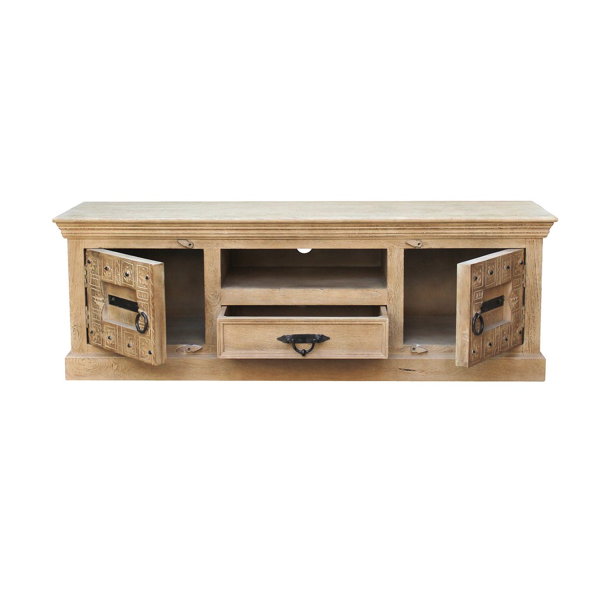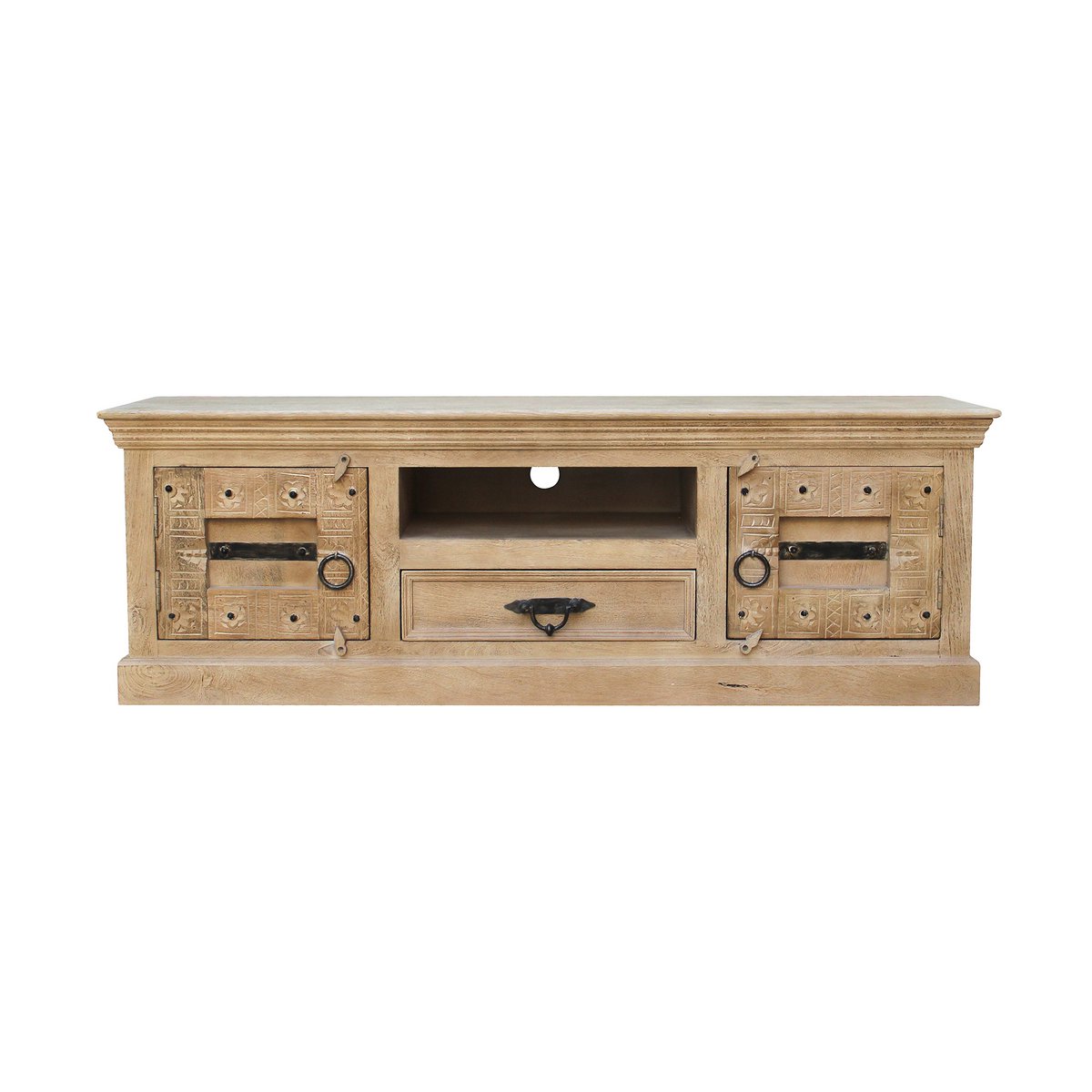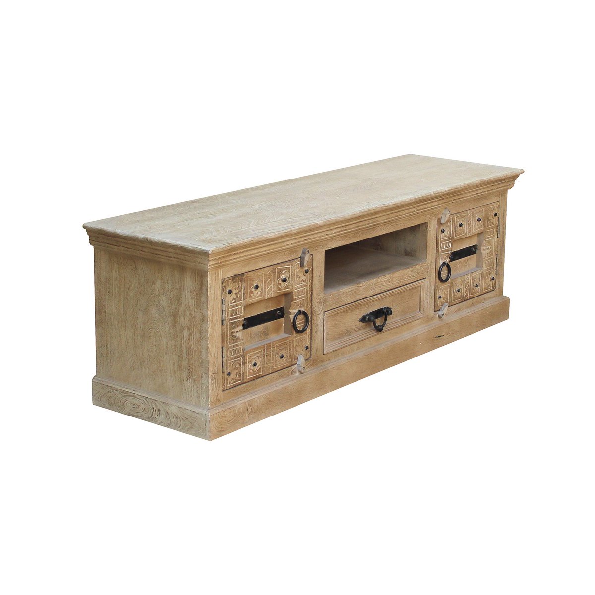 Een lowboard dat je het gevoel geeft op vakantie te zijn in India. Uitgebreid snijwerk op mangohout met metalen applicaties geven de voorkant van het tv-meubel de antieke koloniale uitstraling die typerend is voor India. De handgemaakte kast biedt voldoende opbergruimte achter 2 deuren, 1 open vak en een lade voor dvd-spelers, gameconsoles, ontvangers, versterkers, afstandsbedieningen enz. De tv-ladekast kan met passende accessoires prachtig tentoon worden gesteld en laat de schoonheid van het antieke koloniale De multimedia ladekast komt goed tot zijn recht. Opzettelijke gebruikssporen geven de ladekast een extra uitstraling. De ladekast kan in een woonkamer worden gecombineerd met moderne meubels en woonruimtes en geeft uitdrukking aan zijn charme. Vakmaat 50x40x11 cm, binnenmaat lade 47x33x10 cm, 1 vaste plank achter de deuren, vakmaat BT 42,5×37, hoogte boven 16 cm en onder 13 cm, laderails van hout.