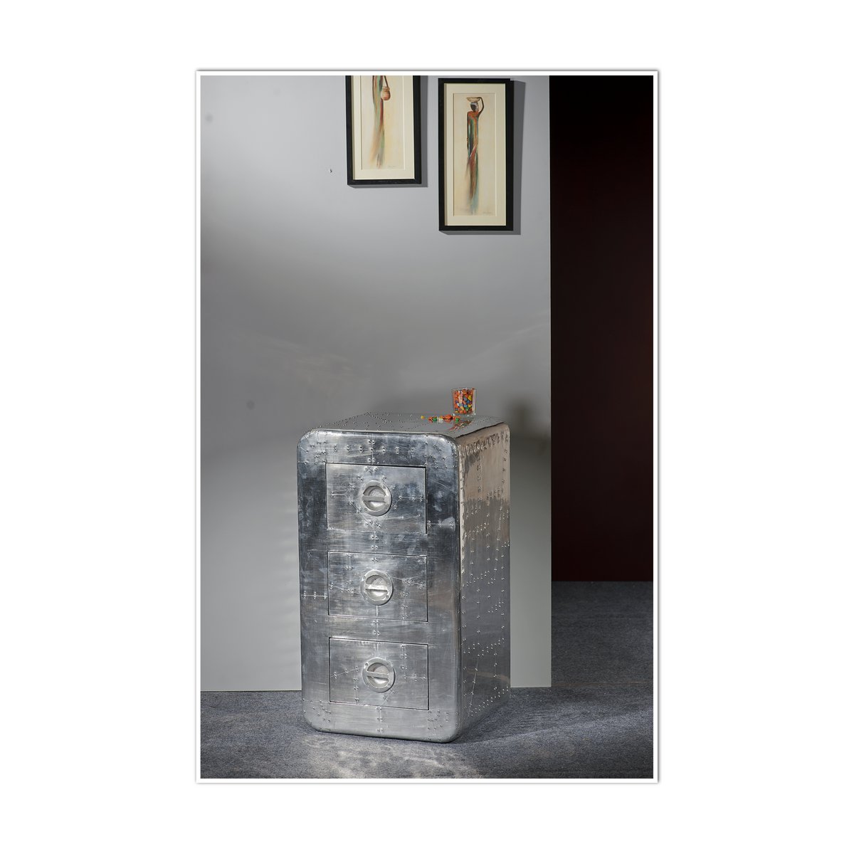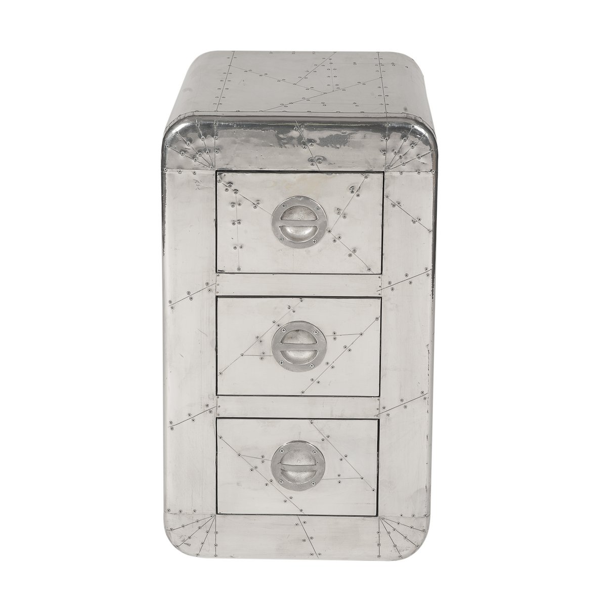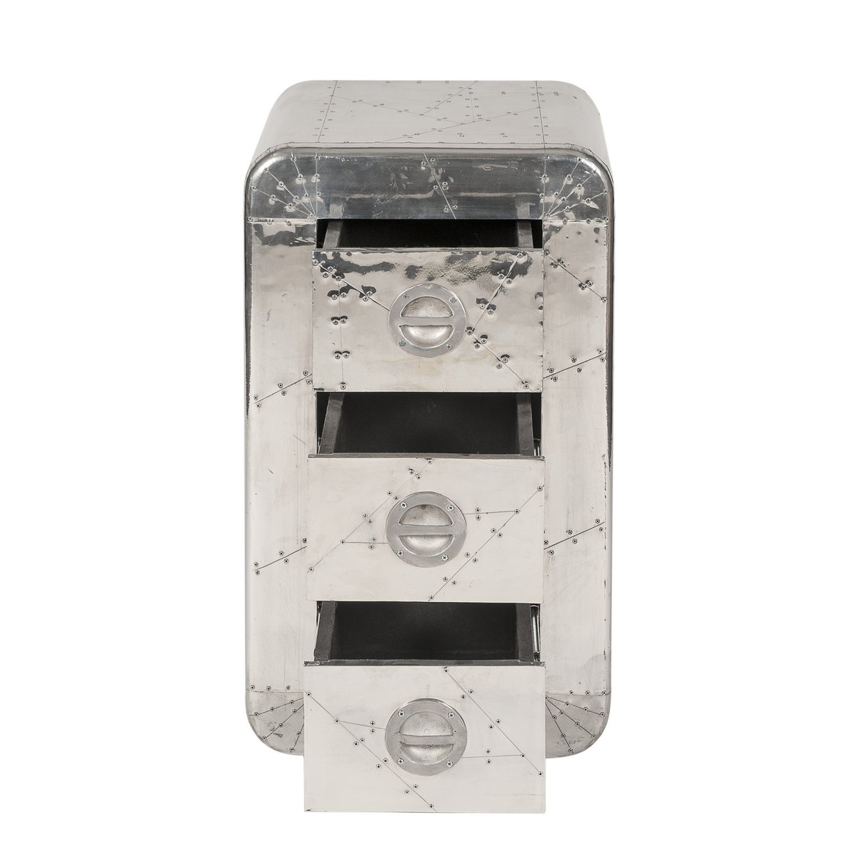 Deze ladekast in bijzondere aluminiumlook is een echte blikvanger voor liefhebbers van industrieel design met een futuristische uitstraling. De opvallende spiegellook, decoratieve schroeven, ronde handgrepen en afgeronde hoeken geven het meubel een uniek karakter dat doet denken aan ruimtevaartdesign en klassieke filmdecors. Hierdoor is deze kast niet alleen functioneel, maar ook een opvallend designelement in de woonkamer, hal of het kantoor.
