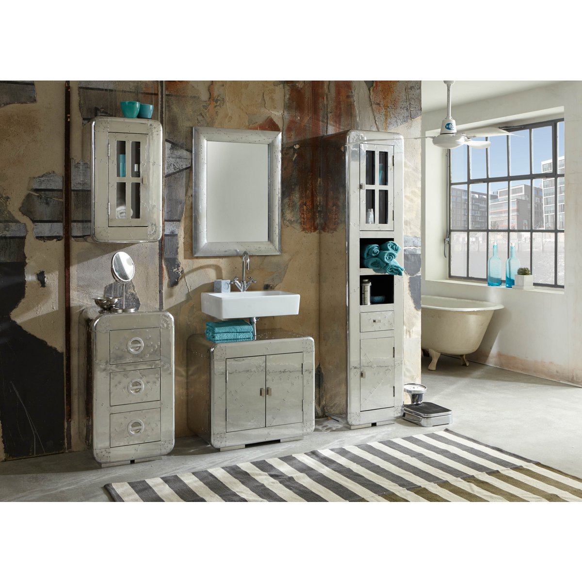 – Industriële ladekast met opvallende aluminiumlook en spiegeldesign