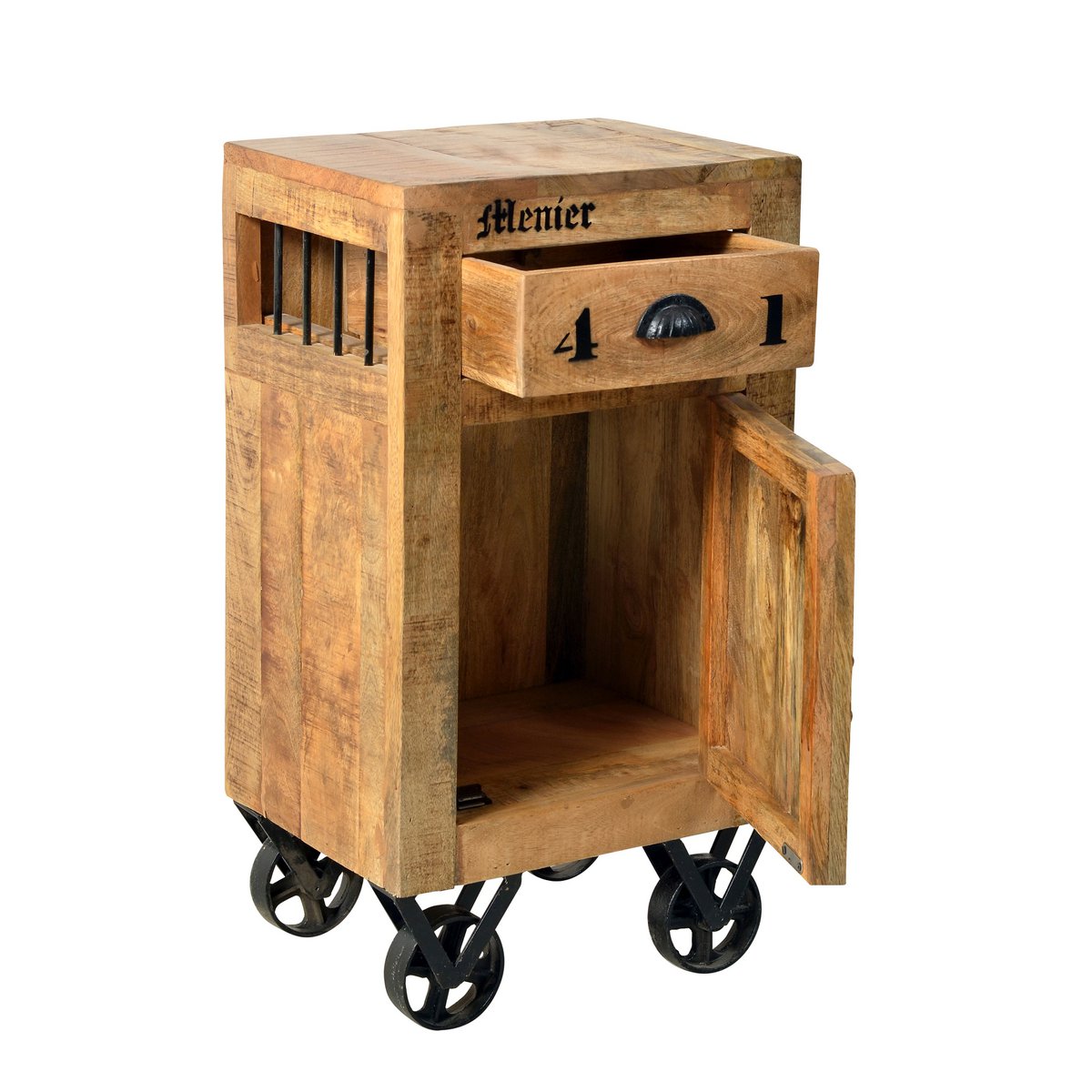 Dankzij de combinatie van een lade en een opbergvak achter de deur biedt deze kast praktische opbergruimte voor allerlei spullen in de woonkamer, slaapkamer, badkamer of het kantoor. De zwarte prints geven het meubel een look die doet denken aan oude transport- en opbergkisten, terwijl de handgesmede wielen en het metalen beslag perfect aansluiten bij de industriële stijl. Door de wielen staat de kast iets verhoogd, wat zorgt voor een luchtiger geheel.