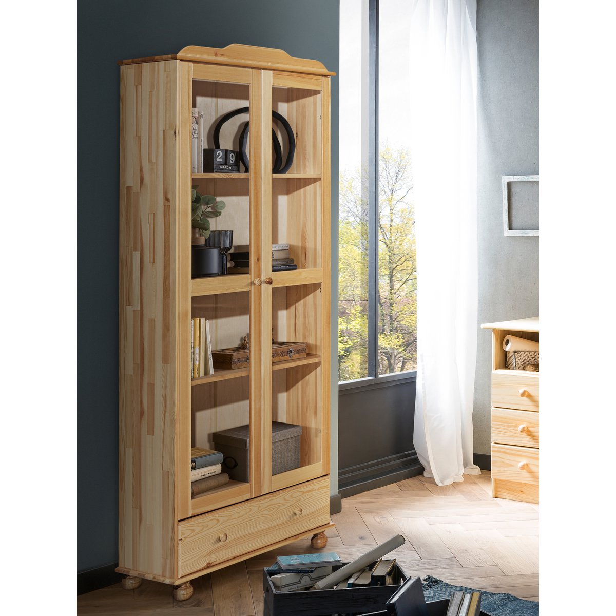 Naast de royale vitrineruimte beschikt deze kast over een praktische lade met metalen geleiders, ideaal voor spullen die u liever uit het zicht bewaart. De combinatie van gesloten en zichtbare opbergruimte maakt deze kast bijzonder veelzijdig. Dankzij het slanke formaat in de diepte is hij bovendien geschikt voor verschillende ruimtes, zoals de woonkamer, eetkamer of hal, zonder te veel plaats in te nemen.