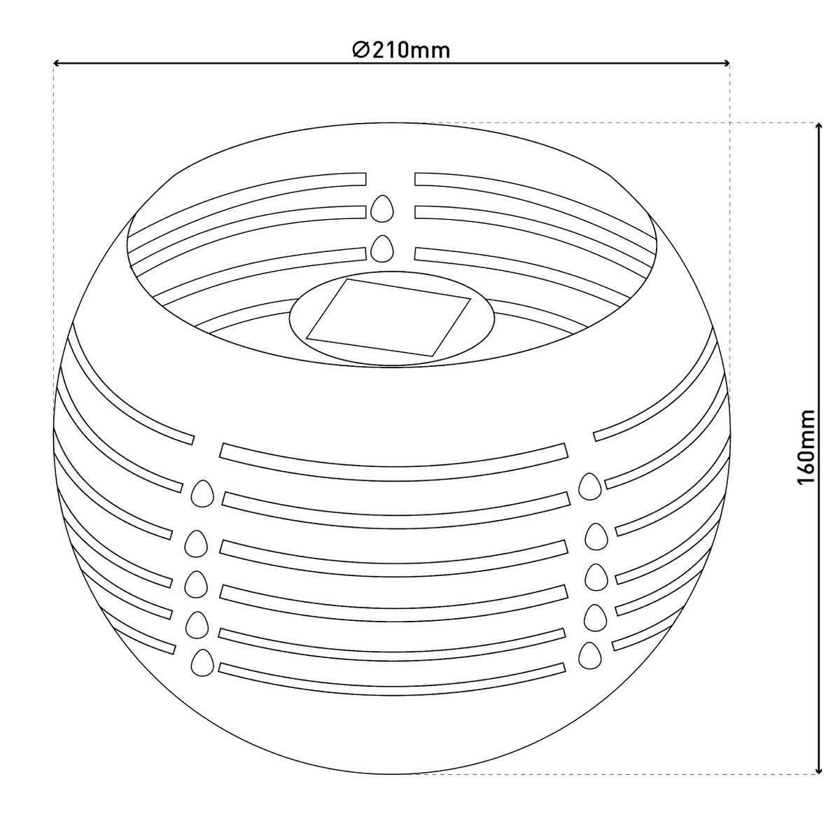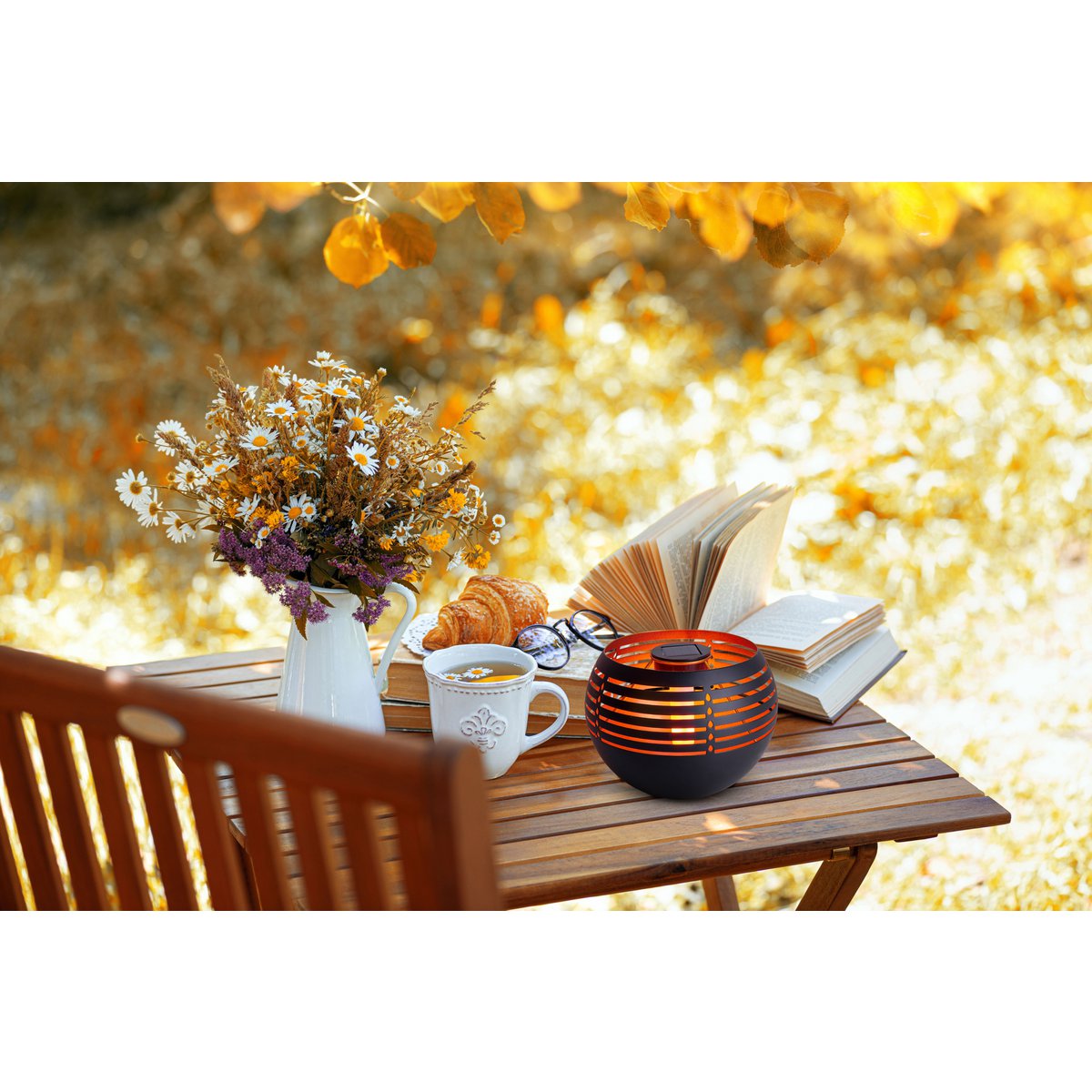 De kleine, fijne zonnetafellamp is zeer verminderd en modern in zijn vorm, maar straalt nog steeds gezelligheid uit vanwege zijn kleurencombinatie. Het warm-witte licht met vlameffect komt tot zijn recht door de gouden binnenkant van de bal en valt mooi naar buiten vanwege het grafische doorbraakpatroon.
