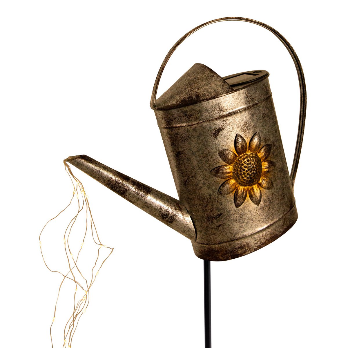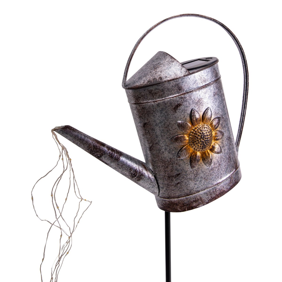 Deze speelse LED solar tuinsteker is een opvallende decoratie voor tuin, terras of bloembak. Het ontwerp in de vorm van een metalen gieter met verlichte waterstraal zorgt in het donker voor een sfeervol en verrassend effect. De decoratieve zonnebloem en de gegalvaniseerde afwerking met subtiel roestaccent geven deze lamp een charmante, landelijke uitstraling.