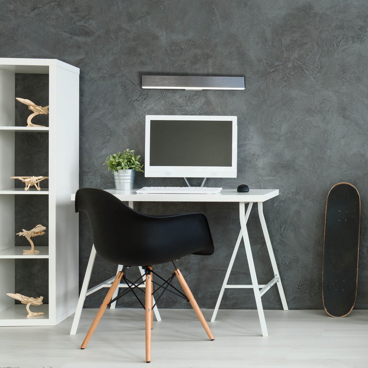 De lamp schijnt aan de rechterkant en links naar de zijkant, een strook verchroomd aluminium is aan de voorkant te zien. Grotere wandoppervlakken kunnen ook worden gestructureerd met behulp van deze lichten.
