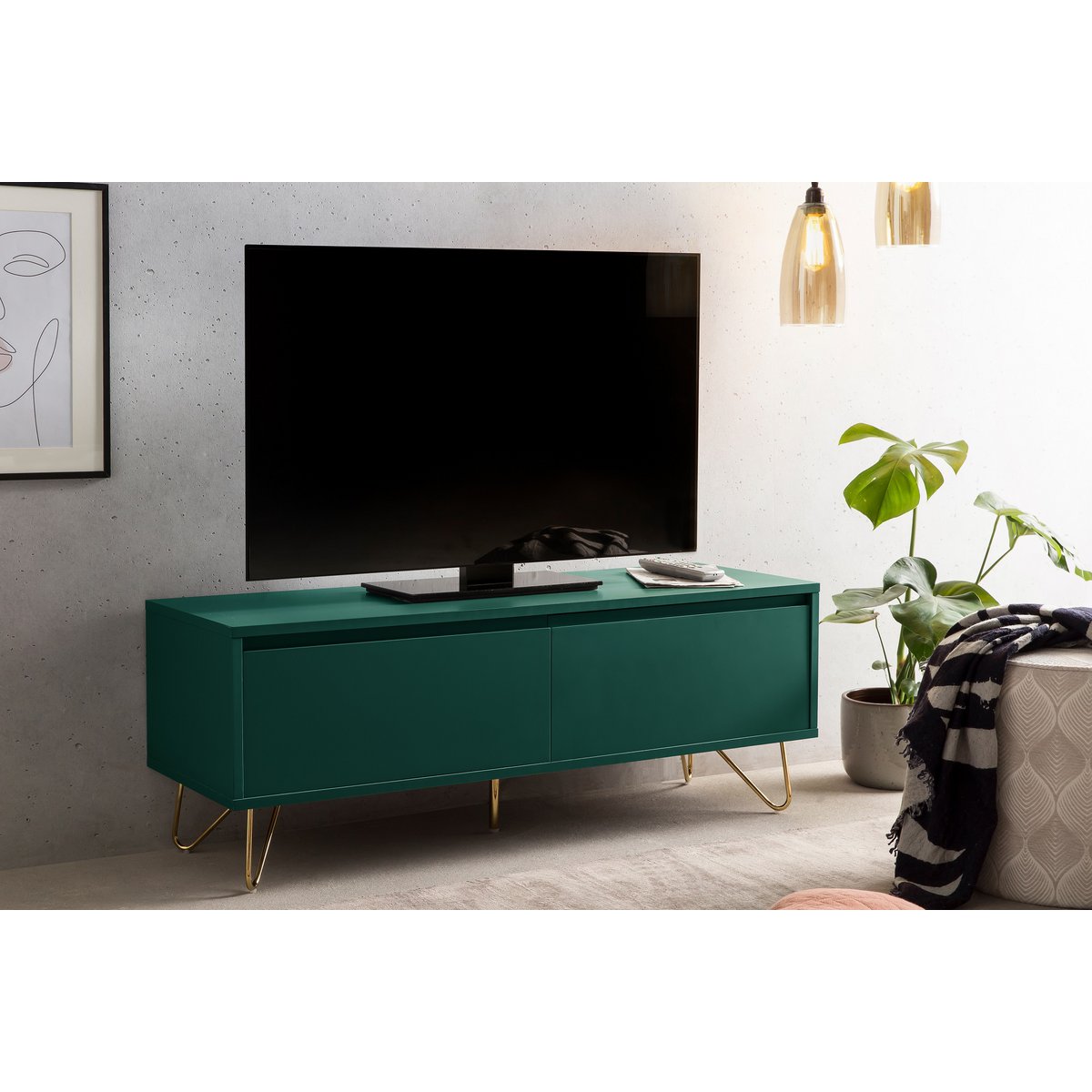 Dit dressoir in Scandinavisch design is een echte eyecatcher in je woonruimte. De combinatie van eenvoudige kleuren en gouden metalen poten maken dit tv-meubel tot iets heel bijzonders. Dankzij de uittrekbare lade en het opvouwbare vak krijg je veel stijlvolle opbergruimte voor alledaagse spullen. Indien nodig kan de plank in het opbergvak worden verwijderd. Het moderne Scandinavische design van dit dressoir is morgen nog steeds eigentijds en prachtig te combineren met je bestaande interieur. Afmetingen opbergruimte links (lade): ca. B57,8 x D33,8 x H23,3 cm, afmetingen opbergruimte rechts (vouwdeur): ca. B57,8 x D36,1 x H26 cm uitneembare plank, uittrekbare lade, frontpaneel met klepdemper, mat gelakt.