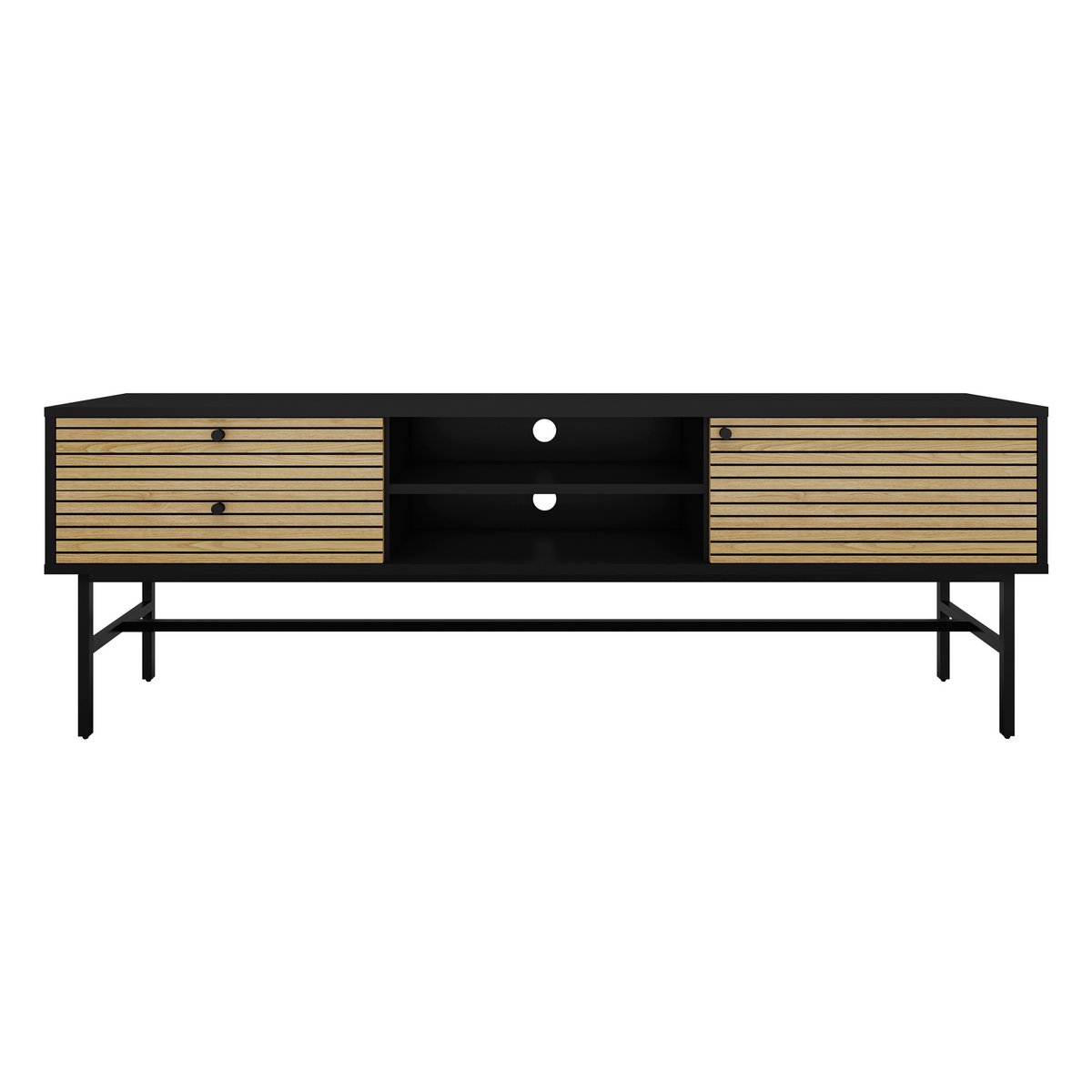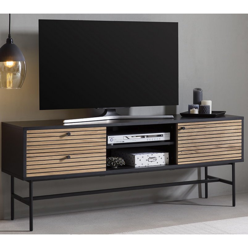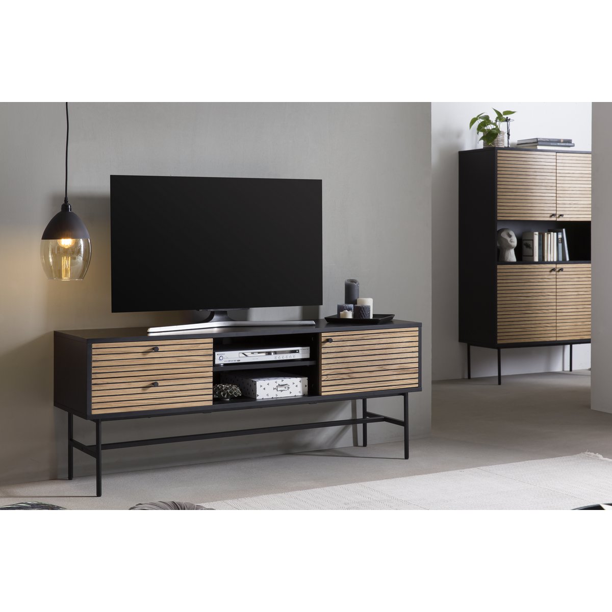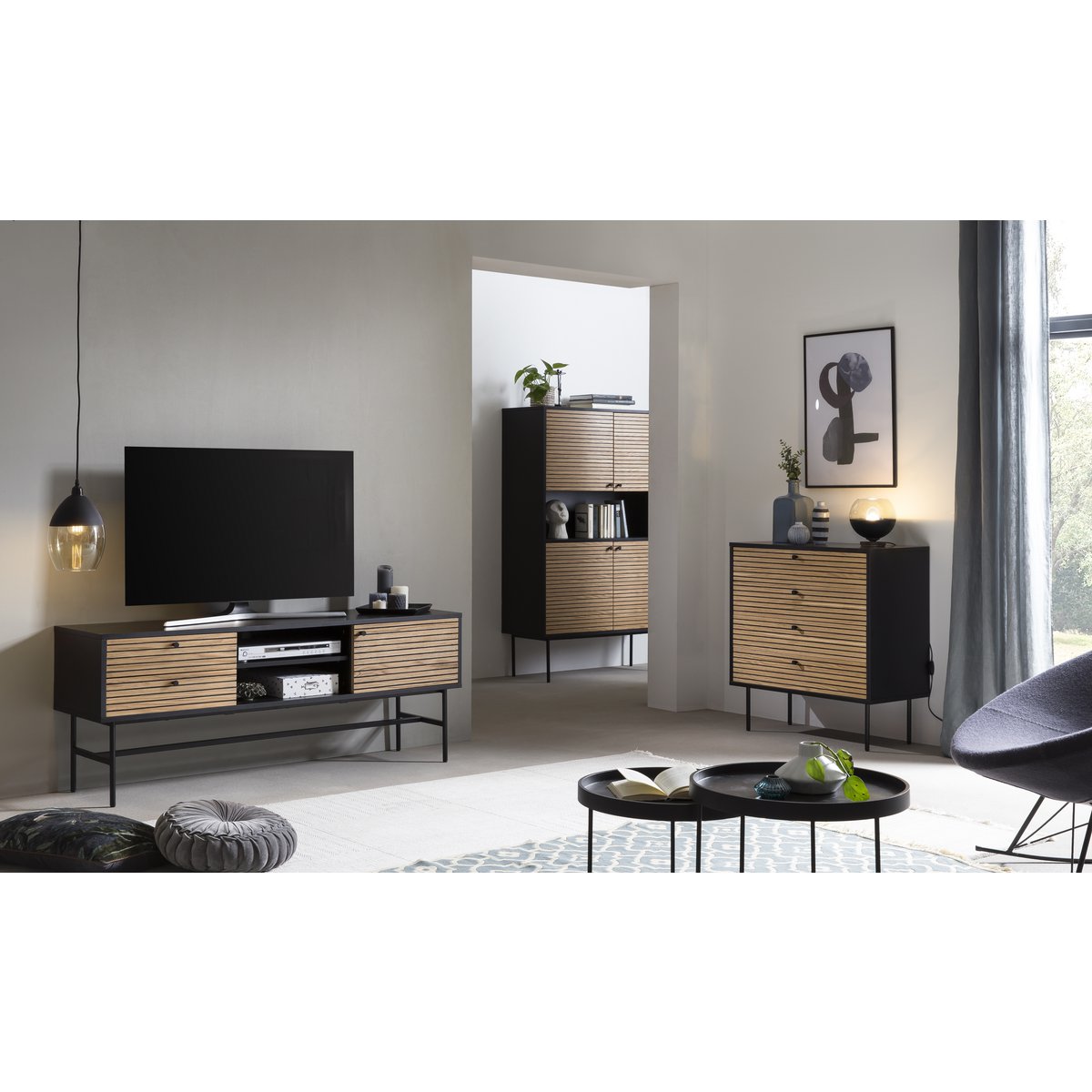 Scandinavische stijl geïnterpreteerd op een moderne manier! Het dressoir biedt je eenvoudige Scandinavische elegantie. De combinatie tussen de zwarte body van MDF-hout en het echte eikenfineer zorgt voor een mooi contrast. Het MDF-houten front is voorzien van echt eikenfineer en is daardoor een echte eyecatcher. Twee lades achter een deur bieden voldoende afgesloten opbergruimte voor je spullen. De twee open vakken in het midden kunnen tevens gebruikt worden als opbergruimte. Tevens zijn er twee kabelgoten geïntegreerd in het meubelstuk, waardoor u uw entertainmentsysteem prachtig kunt combineren met dit meubelstuk. Met dit lowboard staat niets jouw gezellige tv-avond in de weg! Romp MDF met melamine coating, voorkant MDF met eiken echt houtfineer, frame zwart mat gepoedercoat, met 2 kabelgoten Ø50 mm, hoogte van de poten: ca. 30 cm, afmetingen open vak: 2x ca. 48,4 x D35 x H12,9 cm, binnenafmetingen lade: 2x ca. B48,5 x D35 x H12,9 cm.