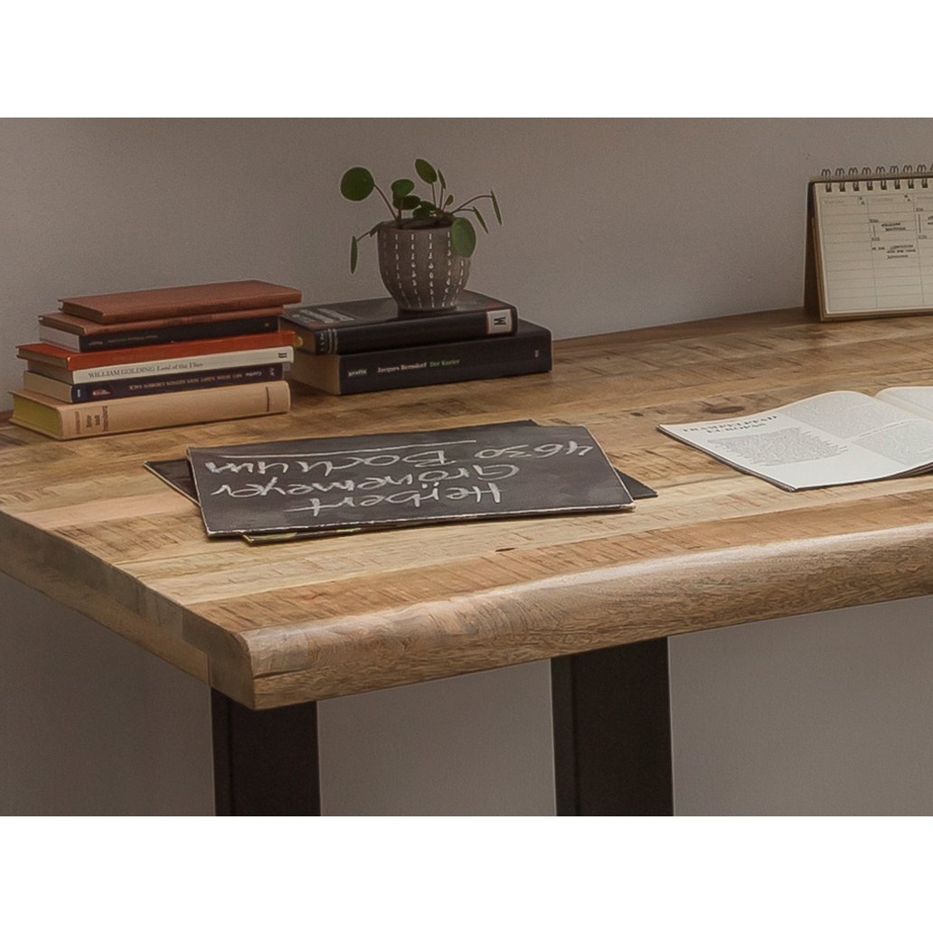 Het trendy sledeframe van metaal in antiek zwart zorgt voor een stijlvol contrast met het mangohouten blad en geeft de tafel een stoere industriële uitstraling. Hierdoor wordt uw eethoek niet alleen een praktische plek voor dagelijkse maaltijden, maar ook een gezellige ontmoetingsplek voor lange avonden met familie en vrienden. Omdat het tafelblad een natuurproduct is, kunnen knoestgaten, groeischeurtjes en kleurafwijkingen voorkomen. Deze natuurlijke kenmerken benadrukken juist de authenticiteit en charme van het hout.