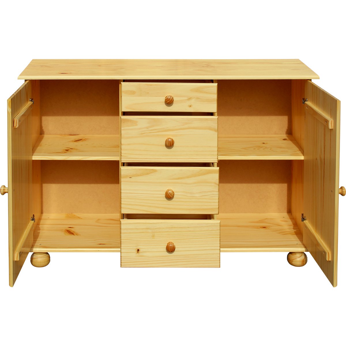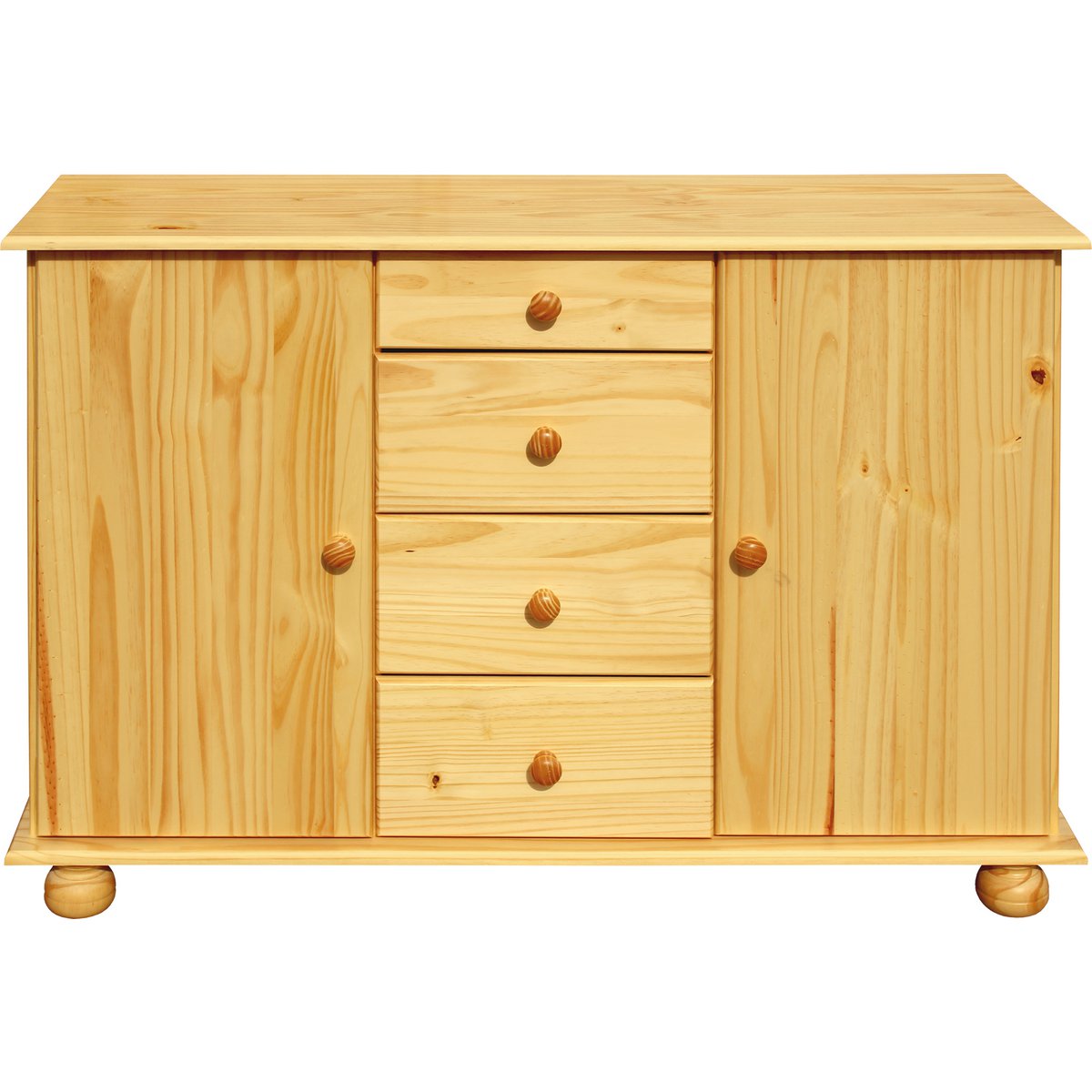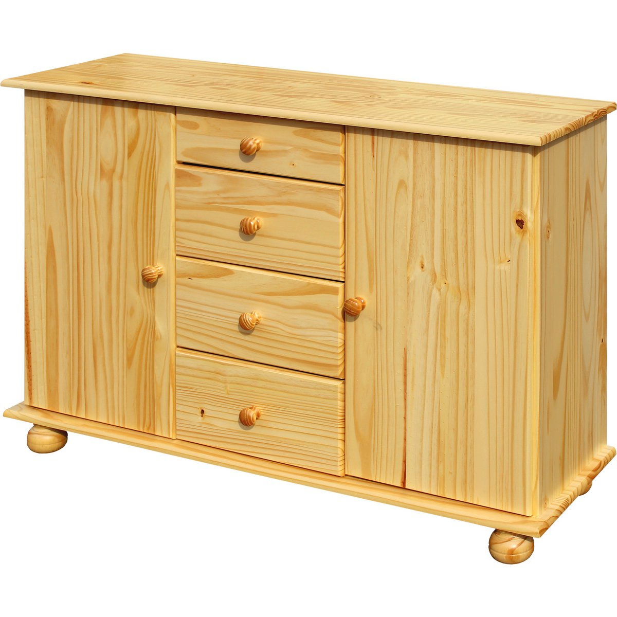 Deze tijdloze ladekast van massief grenenhout combineert praktische opbergruimte met een warme, natuurlijke uitstraling. Dankzij de beschermende gelakte afwerking is het oppervlak onderhoudsvriendelijk en geschikt voor dagelijks gebruik. De kast biedt veel ruimte in vier lades met metalen geleiders en extra opbergruimte achter twee deuren, waardoor dit meubel ideaal is voor de woonkamer, slaapkamer, hal of eetkamer.