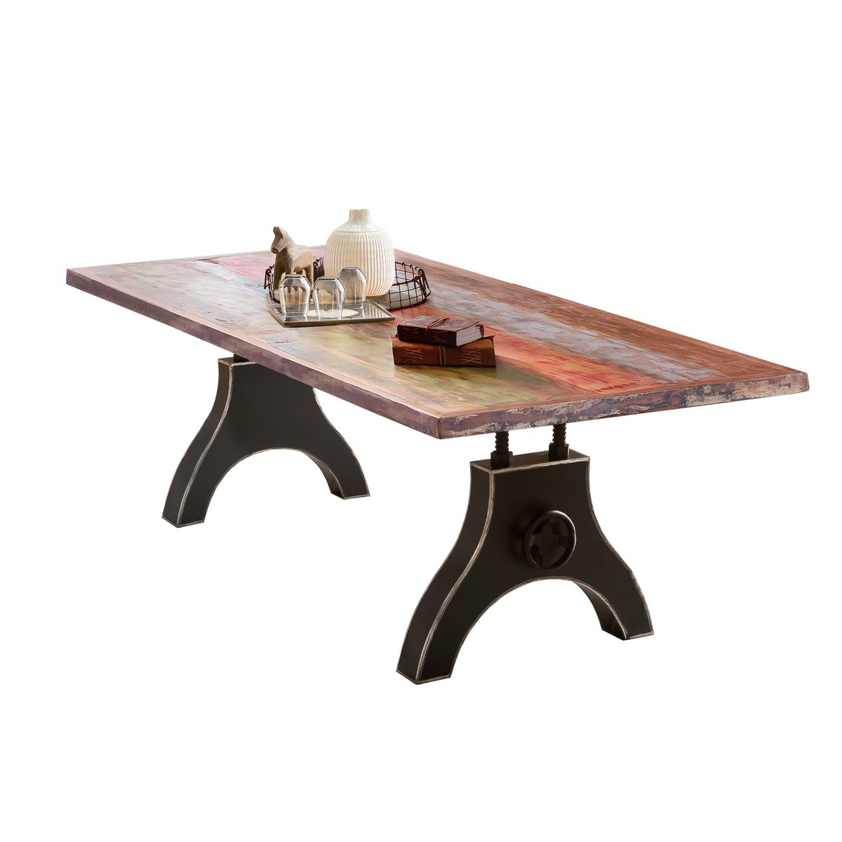 Het zwarte metalen A-frame in used look vormt een stoer contrast met het meerkleurige houten blad en geeft de tafel een uitgesproken industriële uitstraling. Een bijzonder detail is het decoratieve zwengelwiel aan het onderstel, wat zorgt voor extra karakter. Hierdoor is deze eettafel niet alleen praktisch in gebruik, maar ook een stijlvol statement in de eetkamer of woonkeuken.