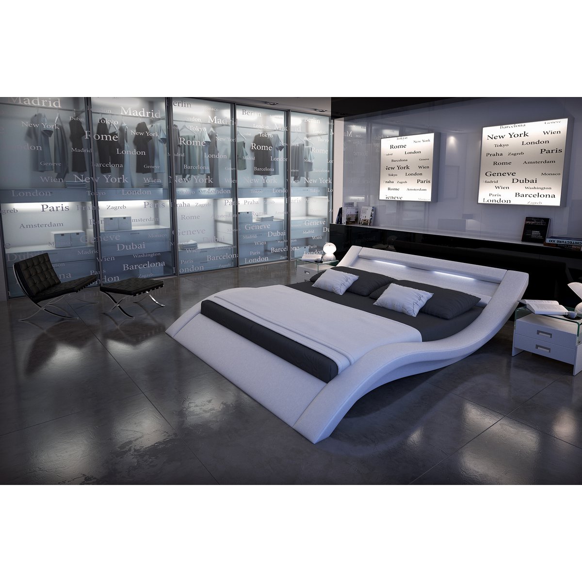 Dit moderne gestoffeerde bed in wit maakt indruk met zijn gebogen lijnen en strakke uitstraling. De onderhoudsvriendelijke kunstleren bekleding geeft het bed een luxe look, terwijl de geïntegreerde LED-lichtstrips in het hoofdbord zorgen voor een warme en sfeervolle verlichting tijdens lezen of tv kijken.