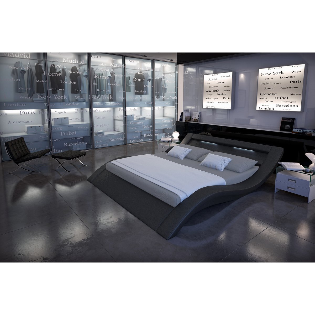 Dit moderne gestoffeerde bed in zwart valt op door zijn gebogen lijnen en strakke uitstraling. De onderhoudsvriendelijke kunstleren bekleding geeft het bed een luxe look, terwijl de geïntegreerde LED-lichtstrips in het hoofdbord zorgen voor een warme en sfeervolle verlichting tijdens lezen of tv kijken.