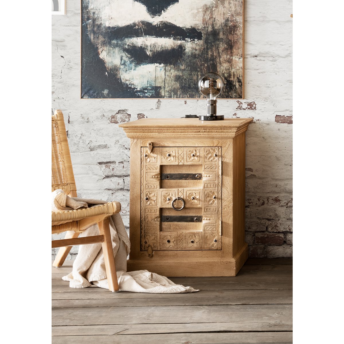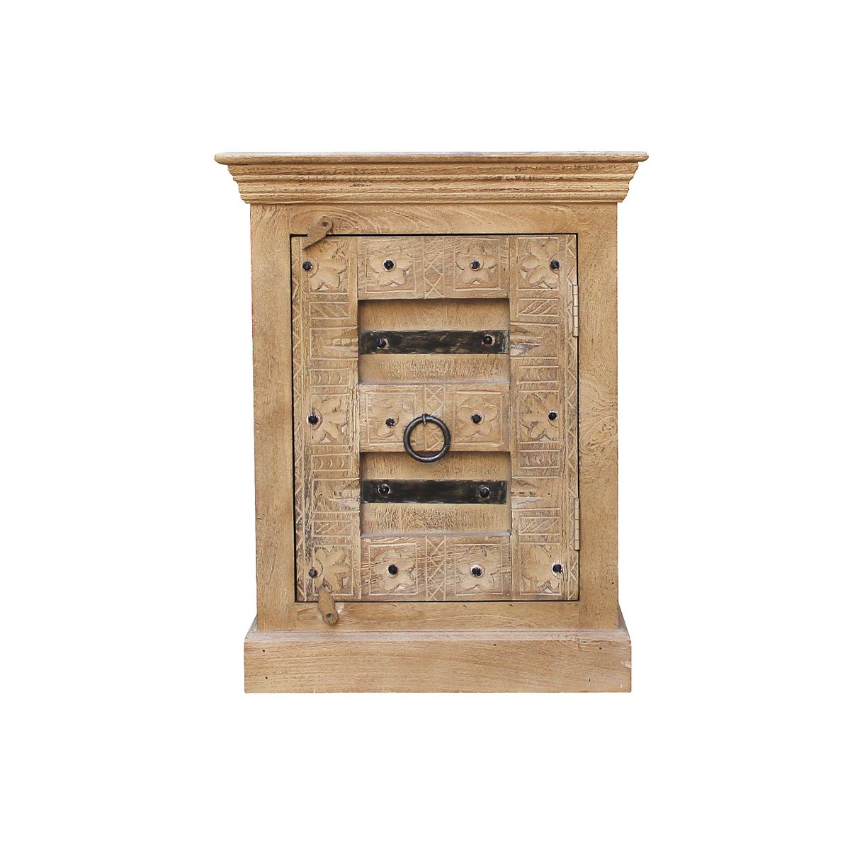 Uitgebreid snijwerk op mangohout met metalen applicaties geven de voorkant van deze nachtconsole de antieke koloniale uitstraling die typerend is voor India. Achter de deur van het nachtkastje is ruimte voor boeken en privéspullen. De afdekplaat biedt voldoende ruimte voor een bedlampje, wekker, boeken, leesbril etc. Het nachtkastje kan ook eenvoudig als één geheel in andere woonkamers worden geplaatst, bijvoorbeeld in een slaapkamer. B. als halkast of kleine ladekast in de hal en kan met zijn charme echt een grote indruk maken. De ladekast kan worden gecombineerd met moderne meubels in slaapkamers. Ook in kleine eenpersoonshuishoudens zou de kast effectief zijn als nichevuller. 1 plank, binnenmaat compartiment 43,5x37x31,5 cm.