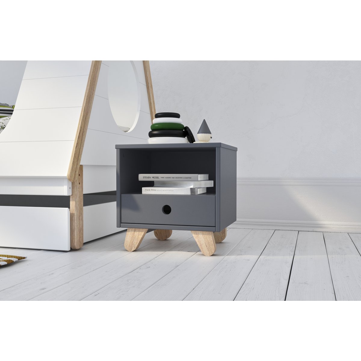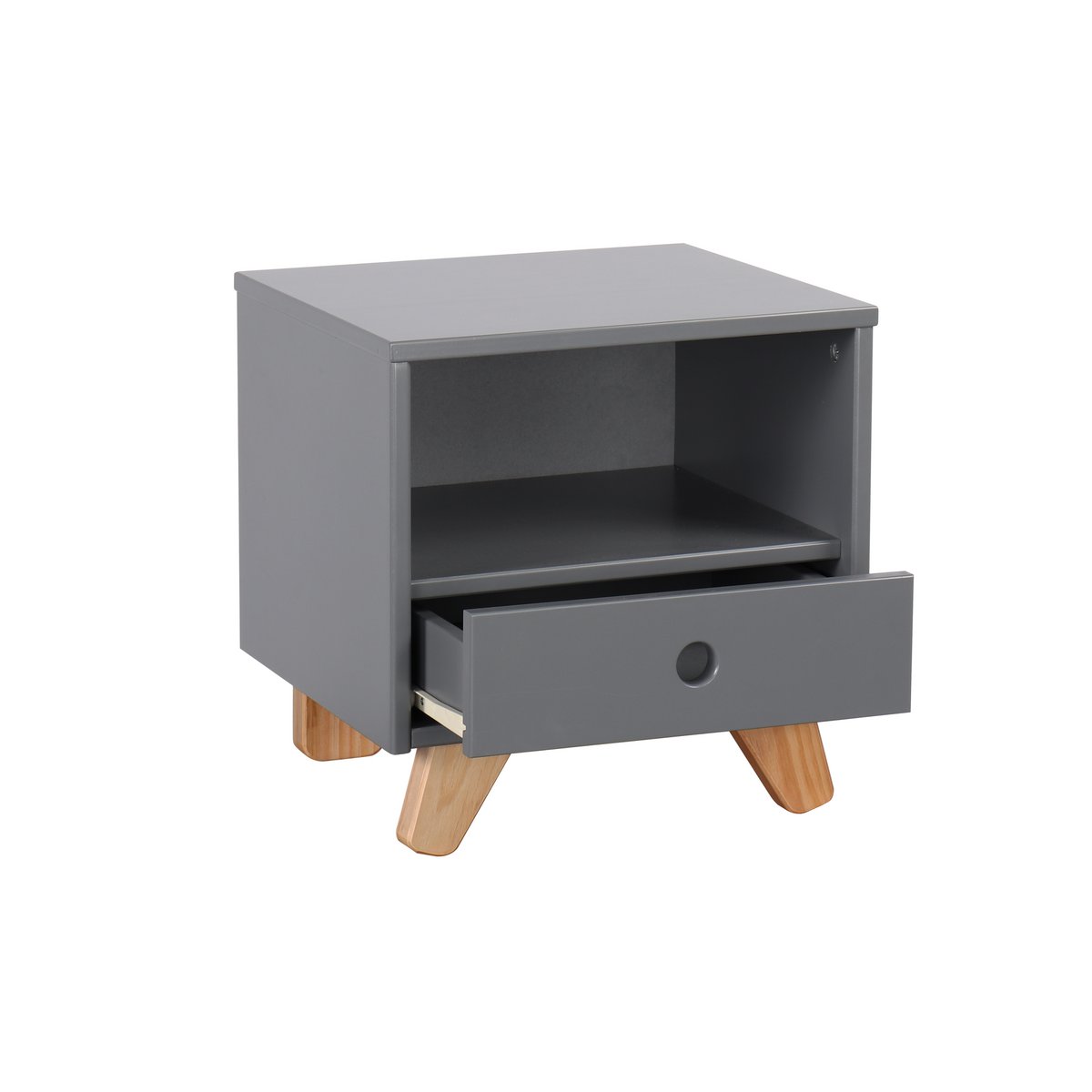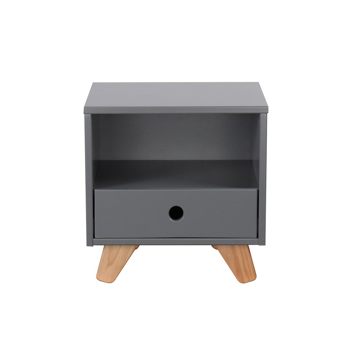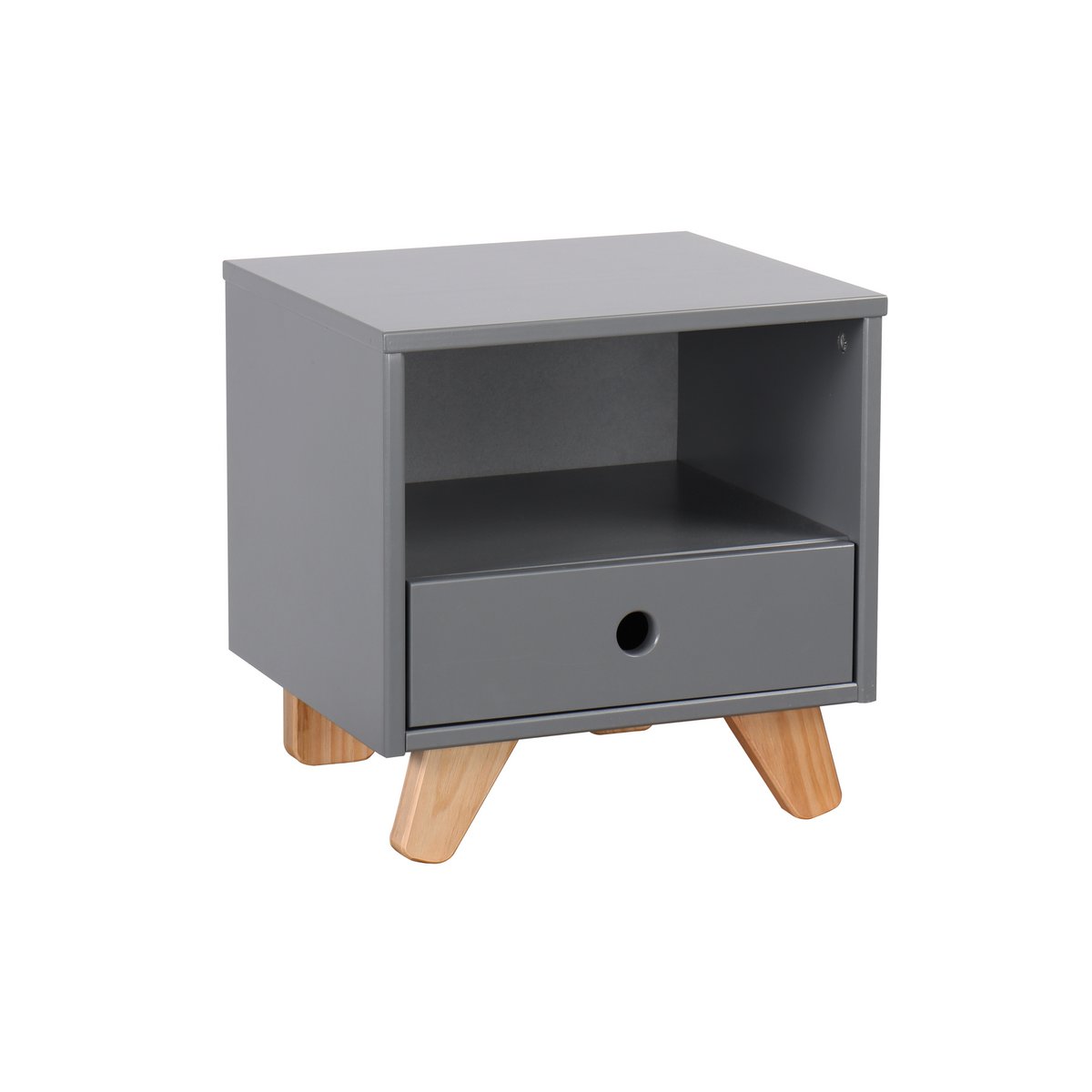 Dit nachtkastje in klassiek Scandinavisch design biedt praktische opbergruimte voor bedlampjes en boeken, nog een open vak voor gemakkelijke toegang en nog een lade voor extra opbergruimte. De Scandinavisch-moderne kleurencombinatie van de grijs gelakte romp en natuurlijk hout maken de nachtkastje tot een blikvanger. De eenvoud wordt nog eens benadrukt door de greeploze uitstraling met vingergaten. Schuine poten van grenenhout geven het nachtkastje een bijzonder eigentijdse uitstraling.