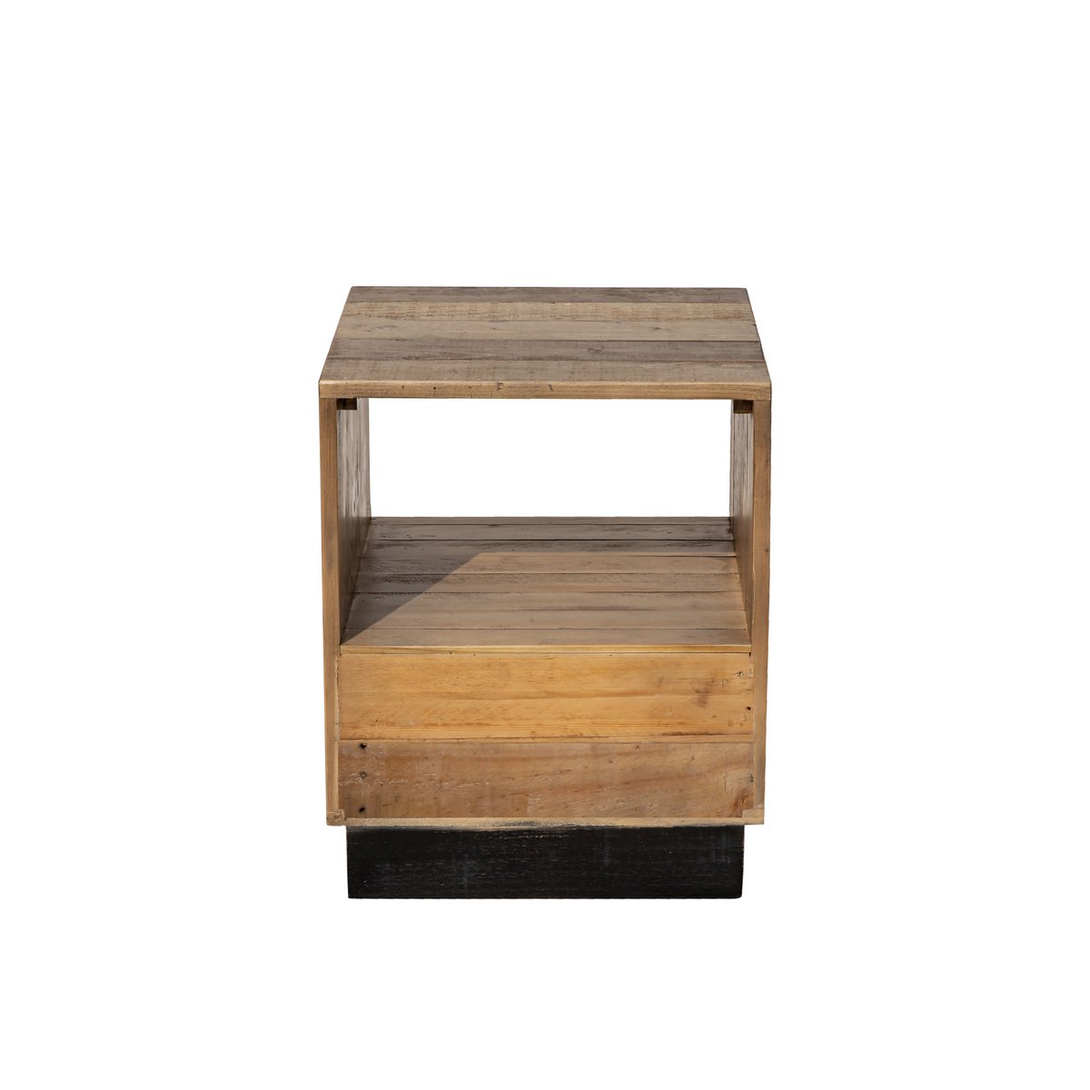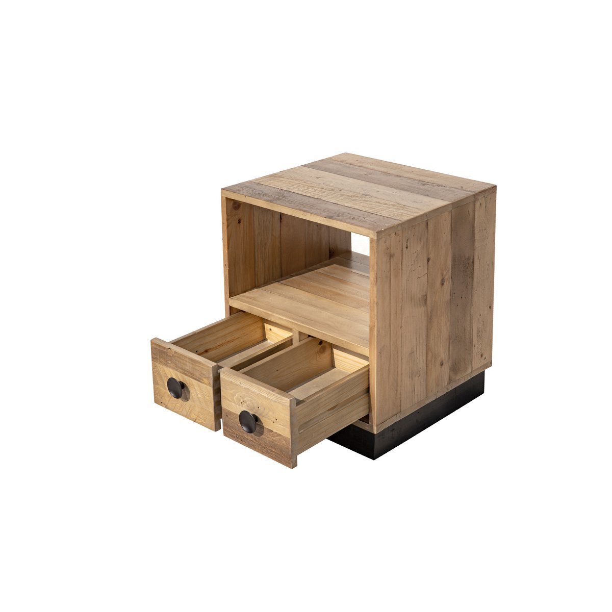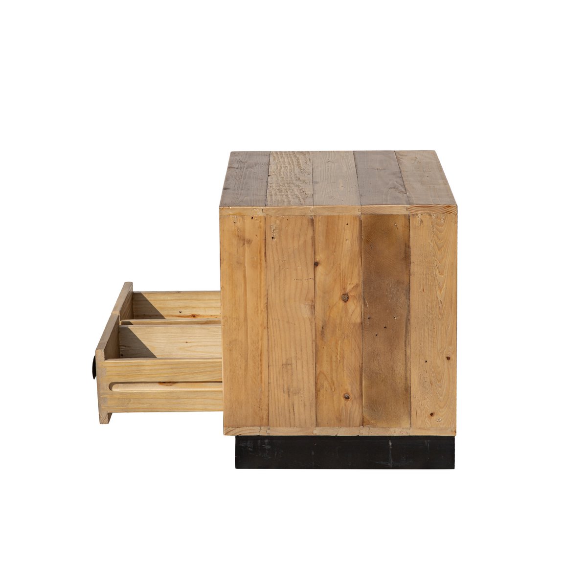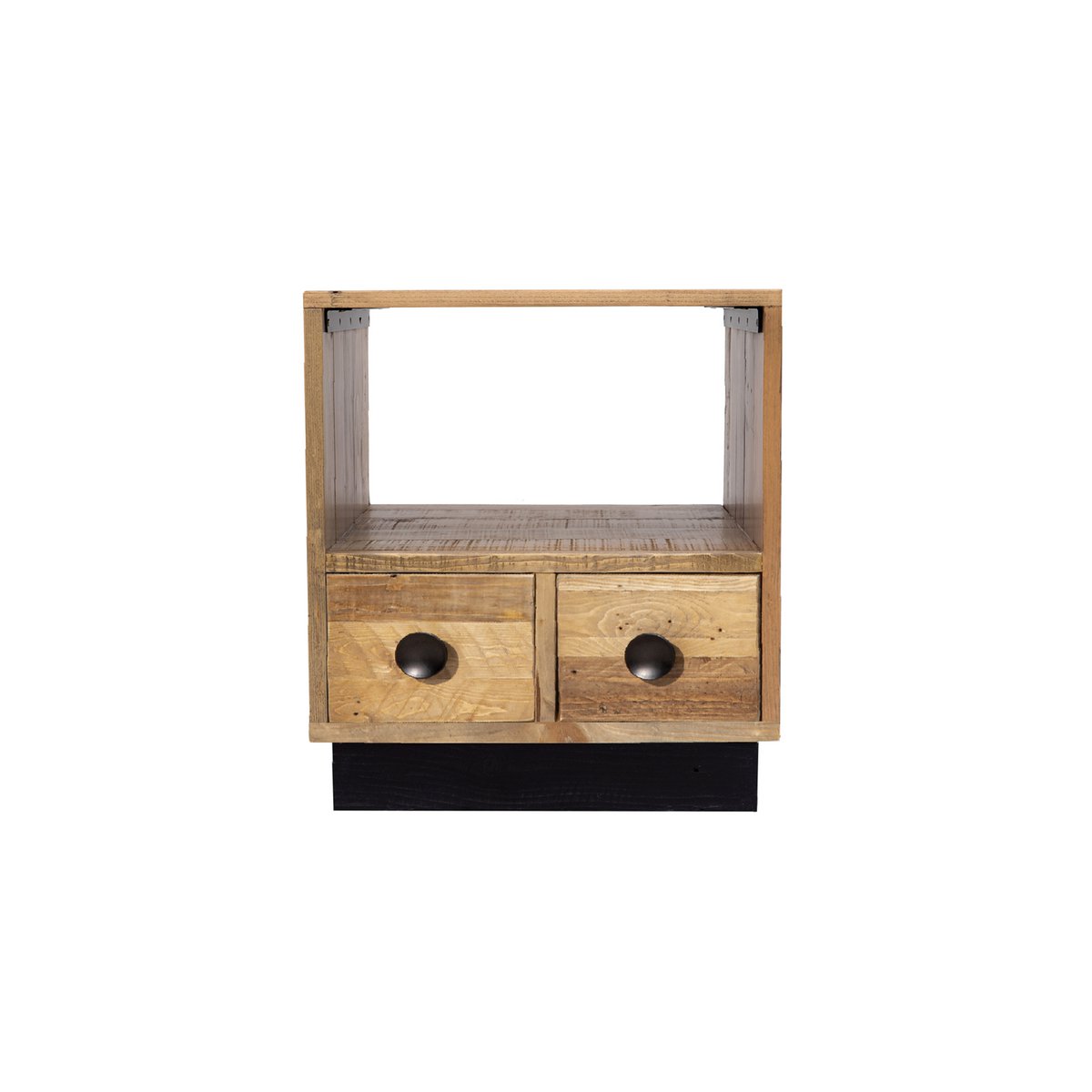 Dit nachtkastje van gerecycled grenenhout is een aantrekkelijke blikvanger in elke woonruimte. Het nachtkastje scoort met een materiaalmix van hout in een warme natuurtint en stevige metalen handgrepen. Dit is erg trendy en zorgt voor interessante contrasten in de look. Naast zijn uiterlijk overtuigt deze ladekast door zijn voelbare structuur. De nachtconsole kan harmonieus in verschillende woonprogramma’s worden geïntegreerd. Twee lades en een open vak zorgen voor extra opbergruimte. Hier kunnen tijdschriften, boeken en dergelijke worden opgeborgen. Ook is er voldoende ruimte voor een bedlampje. Het kastje kan ook gebruikt worden als bijzettafeltje naast een bank. Afmetingen compartiment 41x25x45 cm