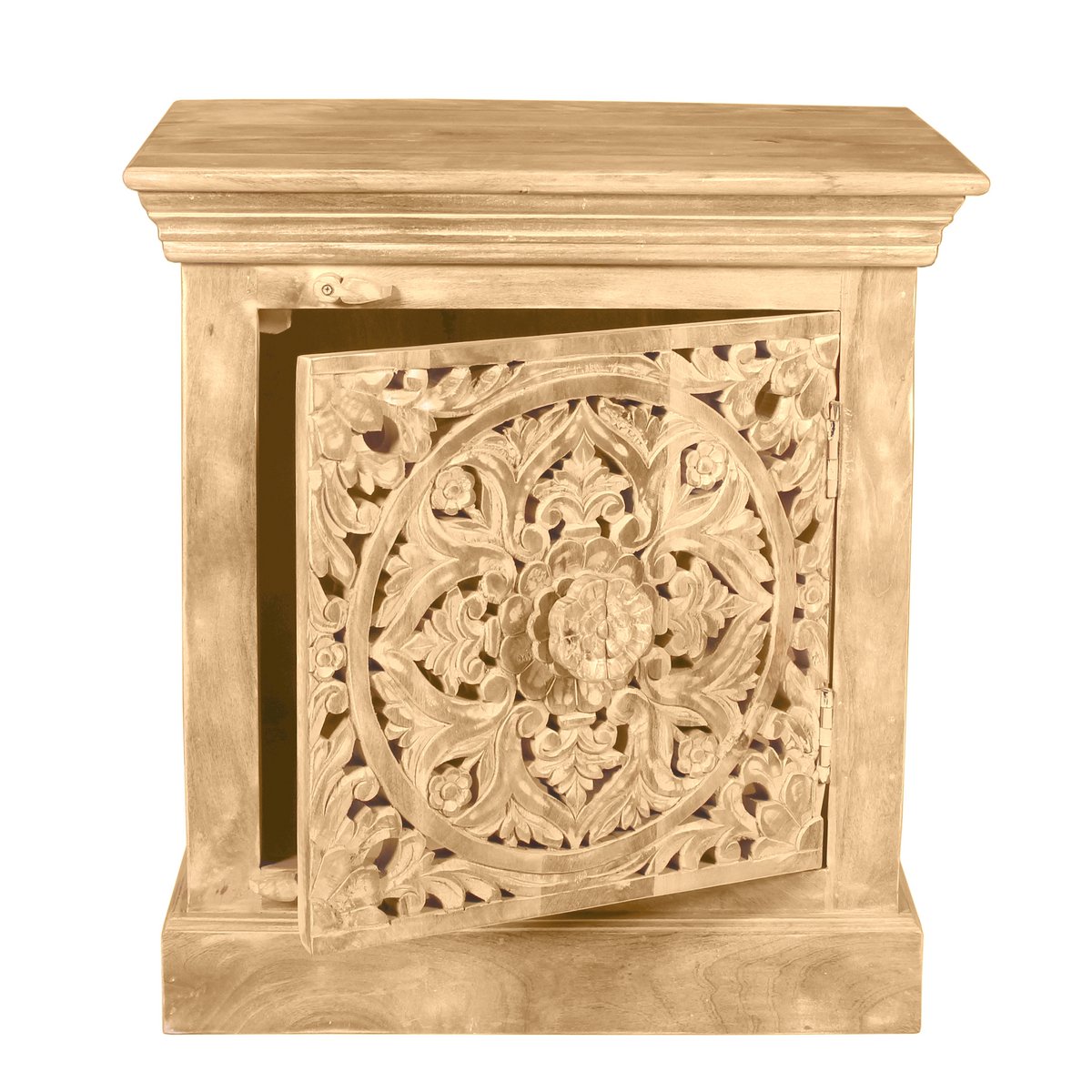 Dit nachtkastje van mangohout in een lichte natuurlijke tint zal uw kamers verfraaien. Achter de deur is voldoende opbergruimte voor allerlei spullen. Bedlampjes, wekkers etc. vinden hun plaats op de afdekplaat. De kleine ladekast kan ook gemakkelijk als één geheel in andere woonkamers worden geplaatst. Het uitgebreide houtsnijwerk aan de voorkant maakt van deze kast een absolute blikvanger waar je vrienden jaloers op zullen zijn. Elk stuk is een uniek stuk waarde.