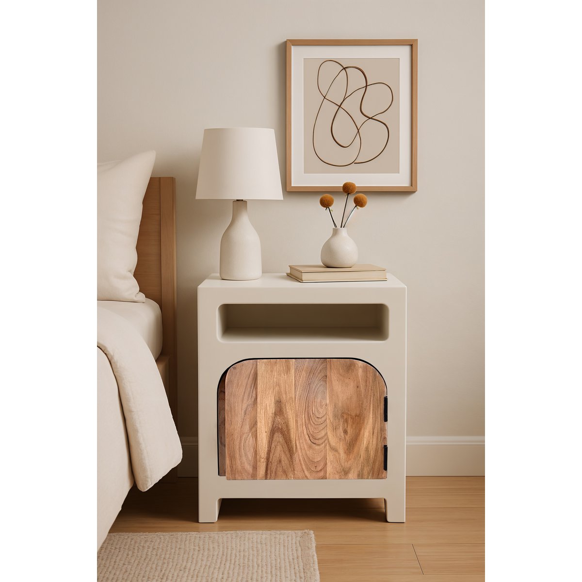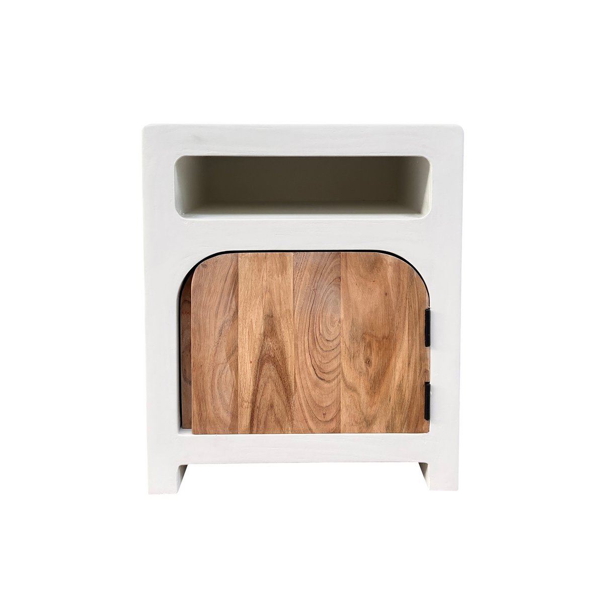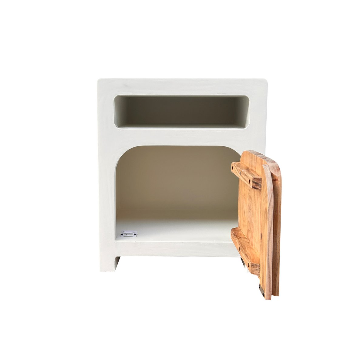 Dit nachtkastje combineert natuurlijke materialen en heldere vormen tot een moderne metgezel in de slaapkamer. Gemaakt van robuust MDF en met een oppervlak van elegant kalkpleister in tijdloos wit, heeft het een matte, zacht gestructureerde look die perfect past bij Scandinavisch design. De deur is gemaakt van massief acaciahout en de kenmerkende nerf zorgt voor een warm, natuurlijk contrast met de lichte behuizing. Achter de deur bevindt zich een open, bodemloos compartiment over de volledige lengte dat flexibele opbergruimte biedt voor boeken of andere persoonlijke spullen. Het ontwerp wordt aangevuld met eenvoudige voeten met een bodemvrijheid van ca. 5 cm, waardoor de ladekast een licht, zwevend effect krijgt. Dit stijlvolle nachtkastje combineert eenvoudige elegantie met natuurlijke accenten en brengt Scandinavische flair in elke slaapkamer. Afmetingen open vak: ca. 40×10 cm, afmetingen deur: ca. 40×30 cm, hoogte van de voeten/bodemvrijheid: ca. 5 cm, breedte van de voeten: ca. 5 cm, deur scharniert rechts.