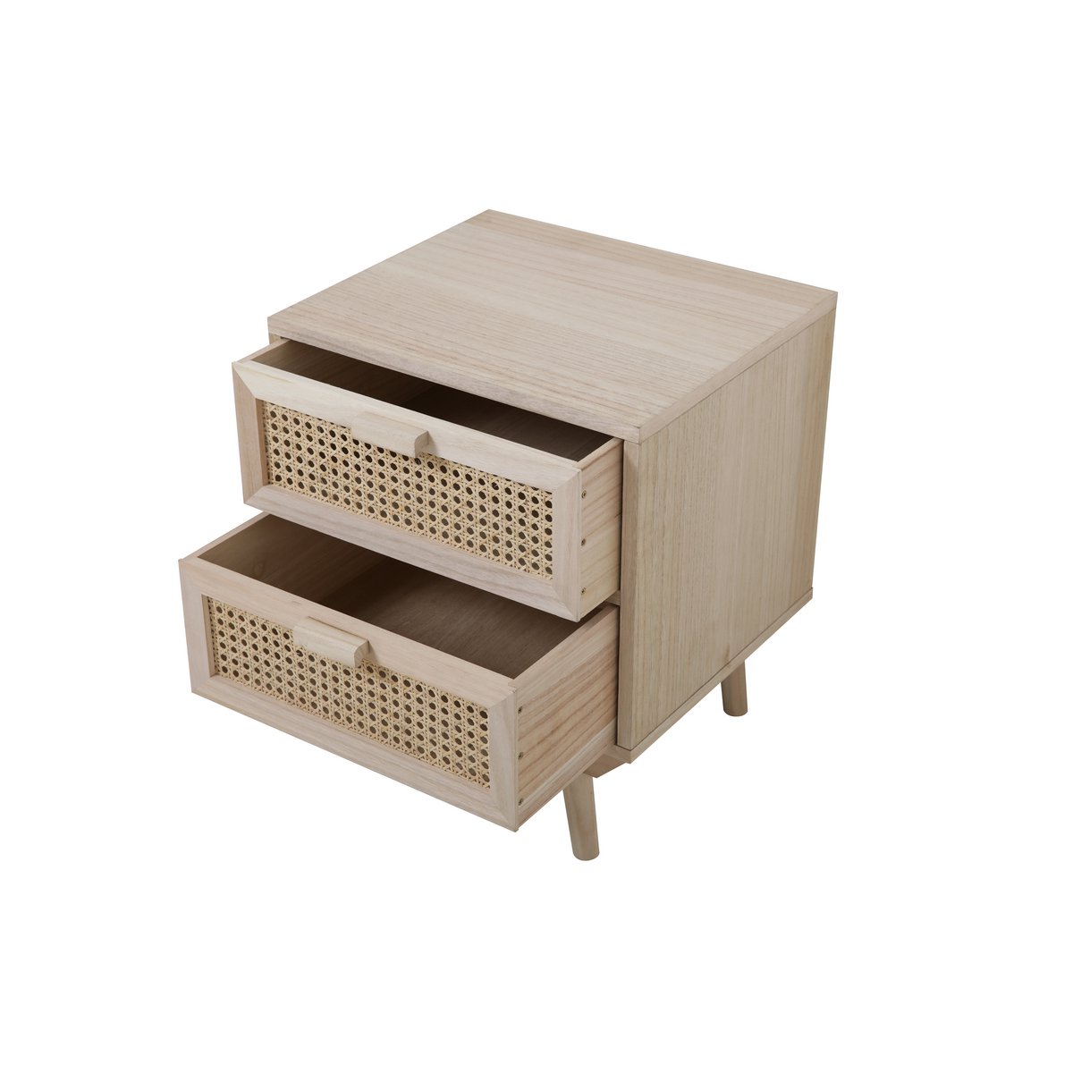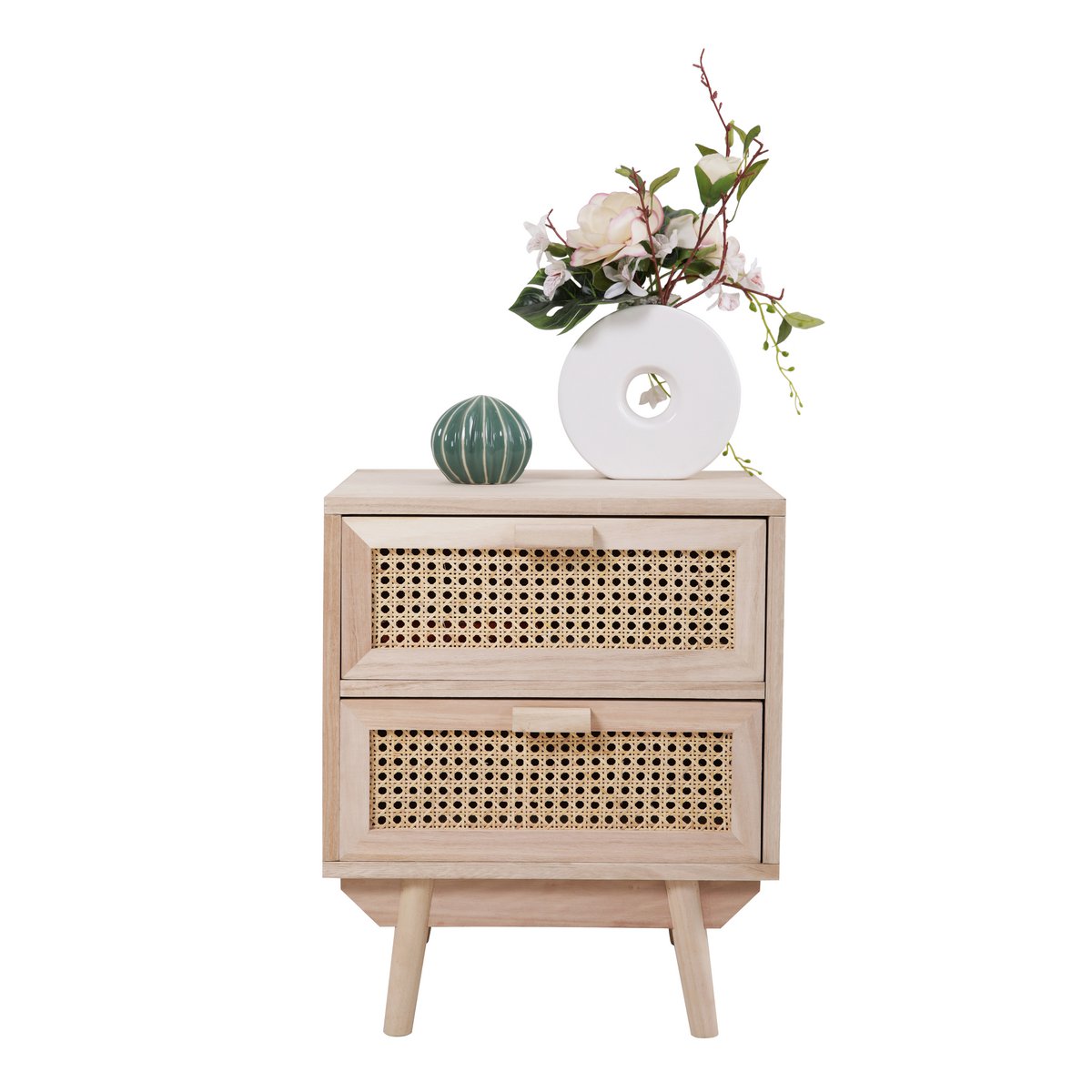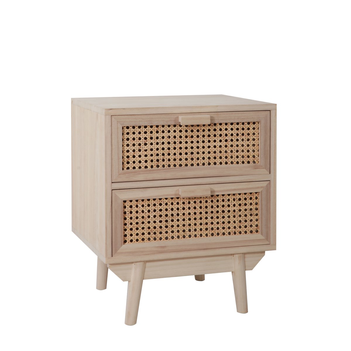 Dit praktische nachtkastje combineert natuurlijke materialen met een rustige en tijdloze uitstraling. De MDF behuizing met paulowniahoutfineer, de houten poten en de rotan ladefronten geven het meubel een warme en sfeervolle look. Daardoor past het nachtkastje moeiteloos in bohemian, Scandinavische en natuurlijke interieurs.
