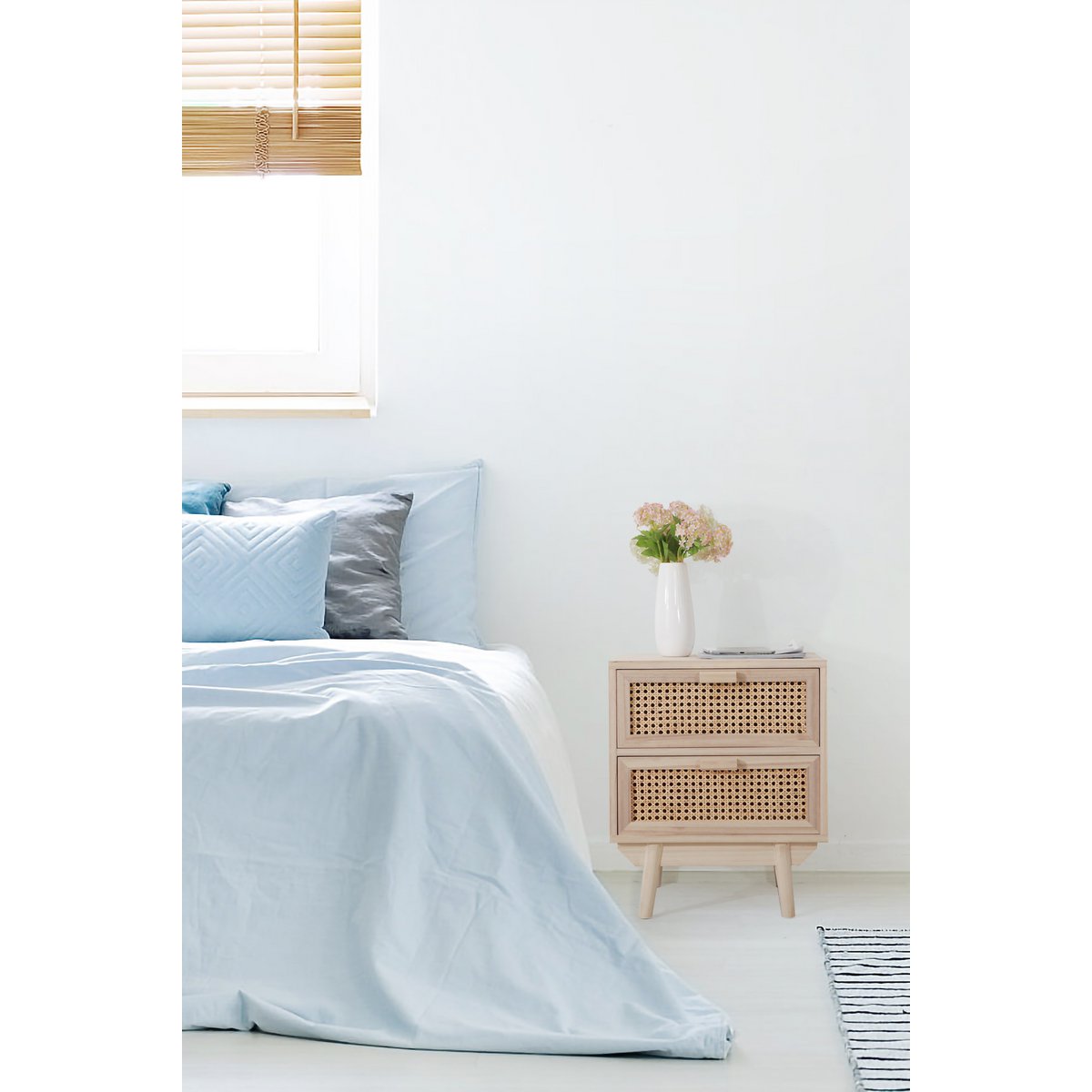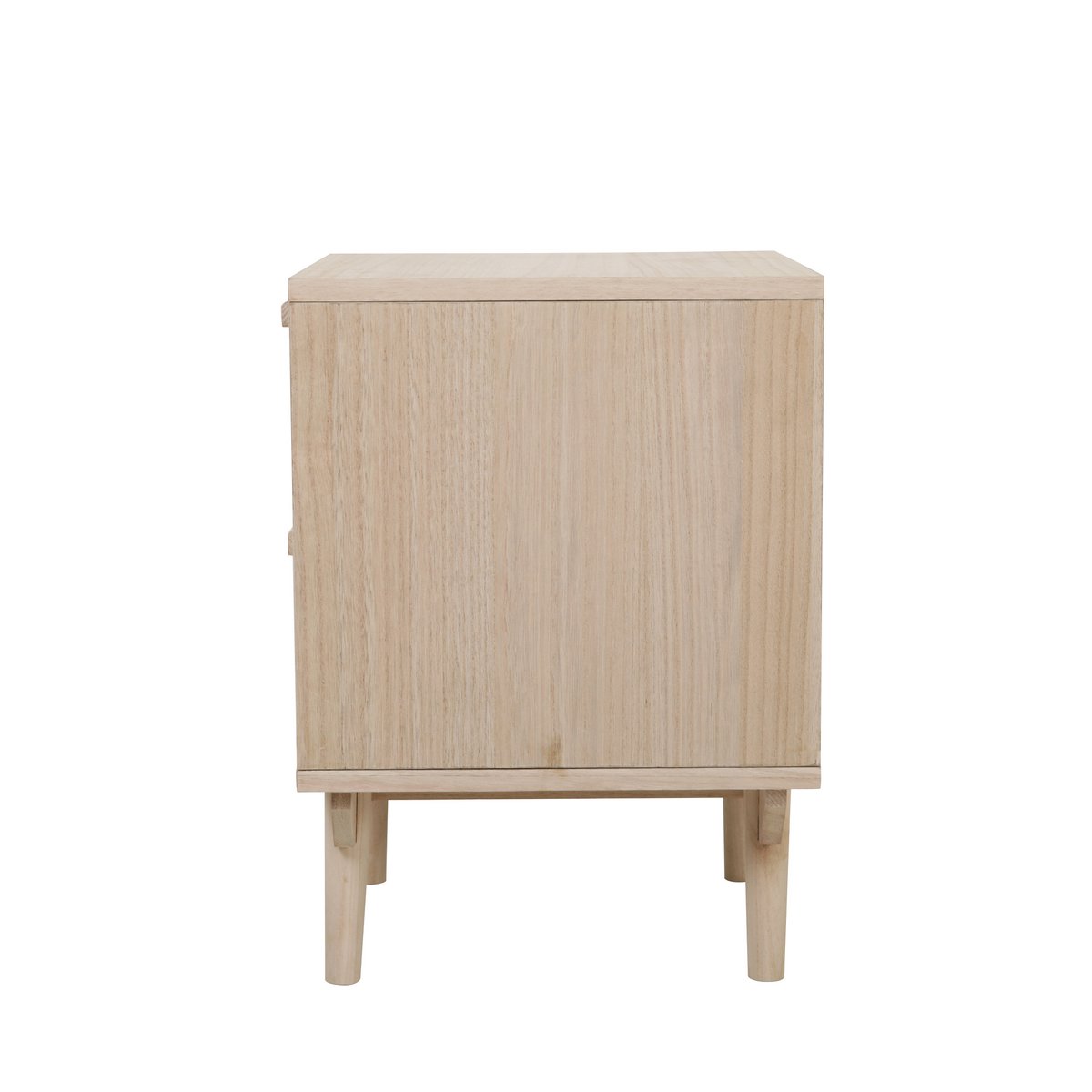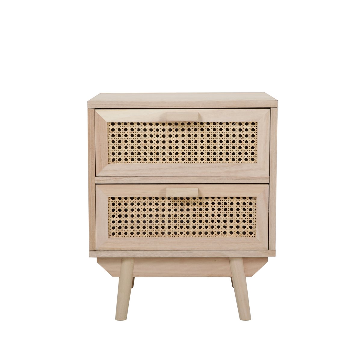 Dit praktische nachtkastje combineert natuurlijke materialen met een rustige en tijdloze uitstraling. De MDF behuizing met paulowniahoutfineer, de houten poten en de rotan ladefronten geven het meubel een warme en sfeervolle look. Daardoor past het nachtkastje moeiteloos in bohemian, Scandinavische en natuurlijke interieurs.