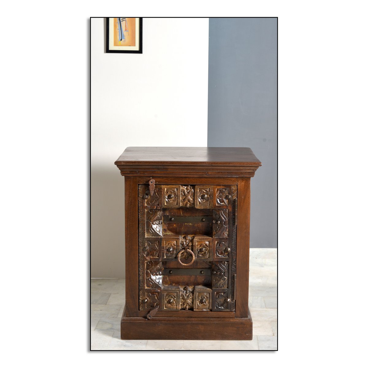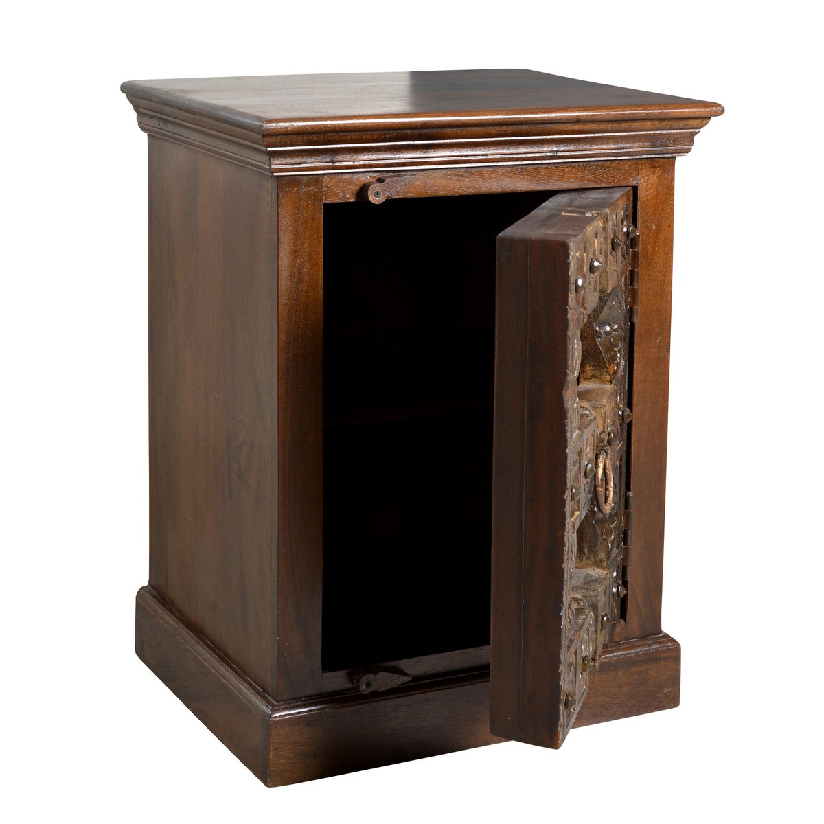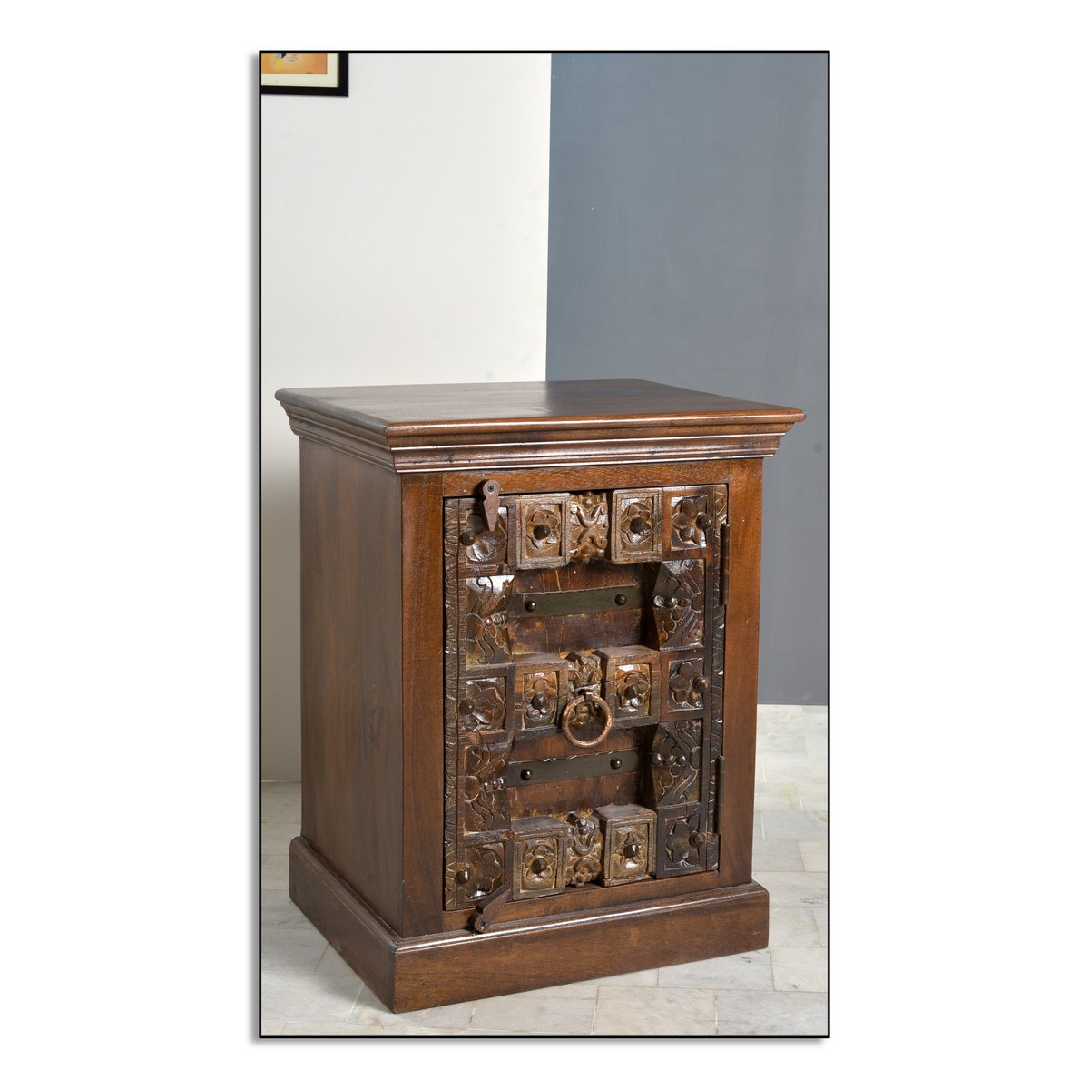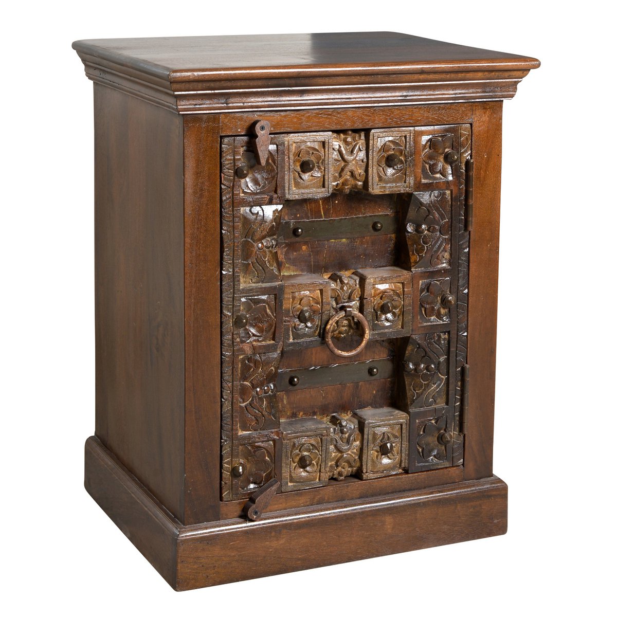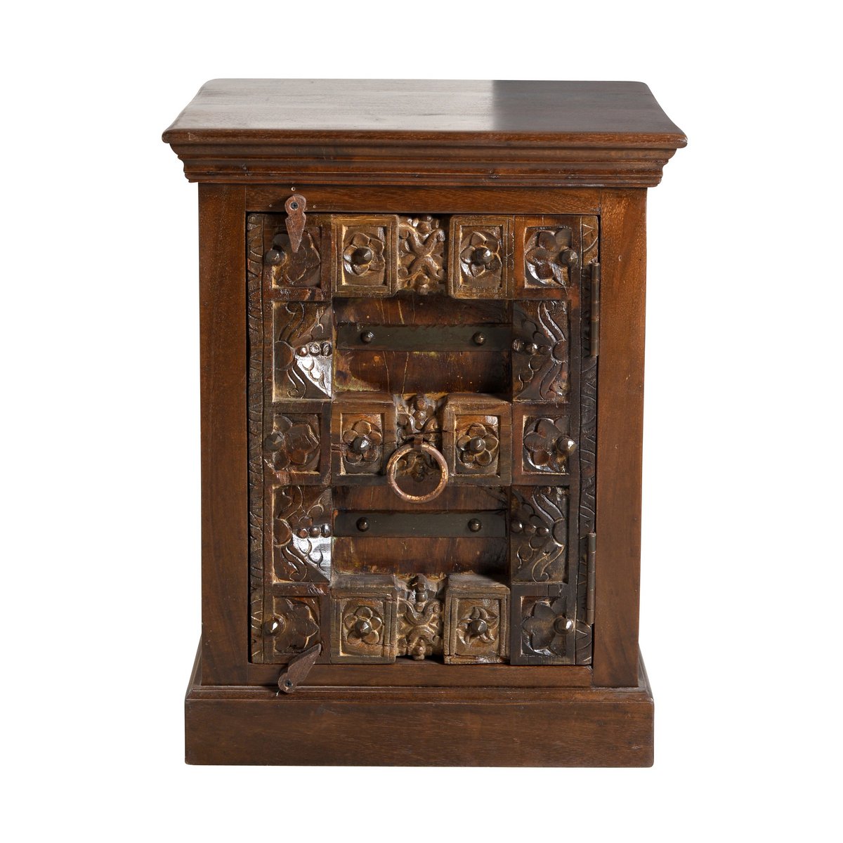 Dit bijzondere nachtkastje brengt direct sfeer en karakter in de slaapkamer. Het uitgebreide snijwerk op gerecycled oud hout en de metalen applicaties geven de voorkant een antieke koloniale uitstraling die kenmerkend is voor India. Daardoor is dit meubel niet alleen praktisch in gebruik, maar ook een decoratieve blikvanger met een warme en authentieke uitstraling.