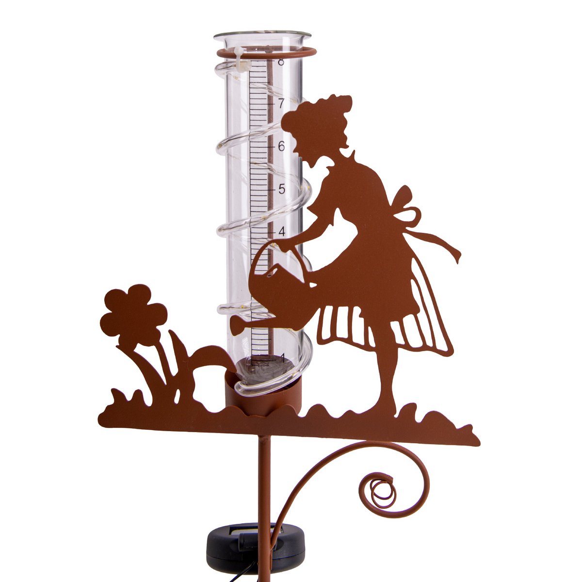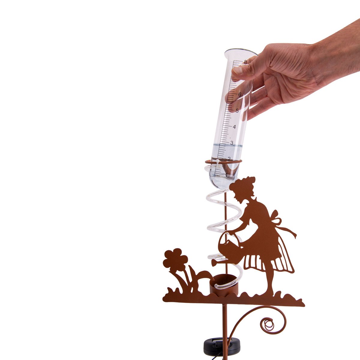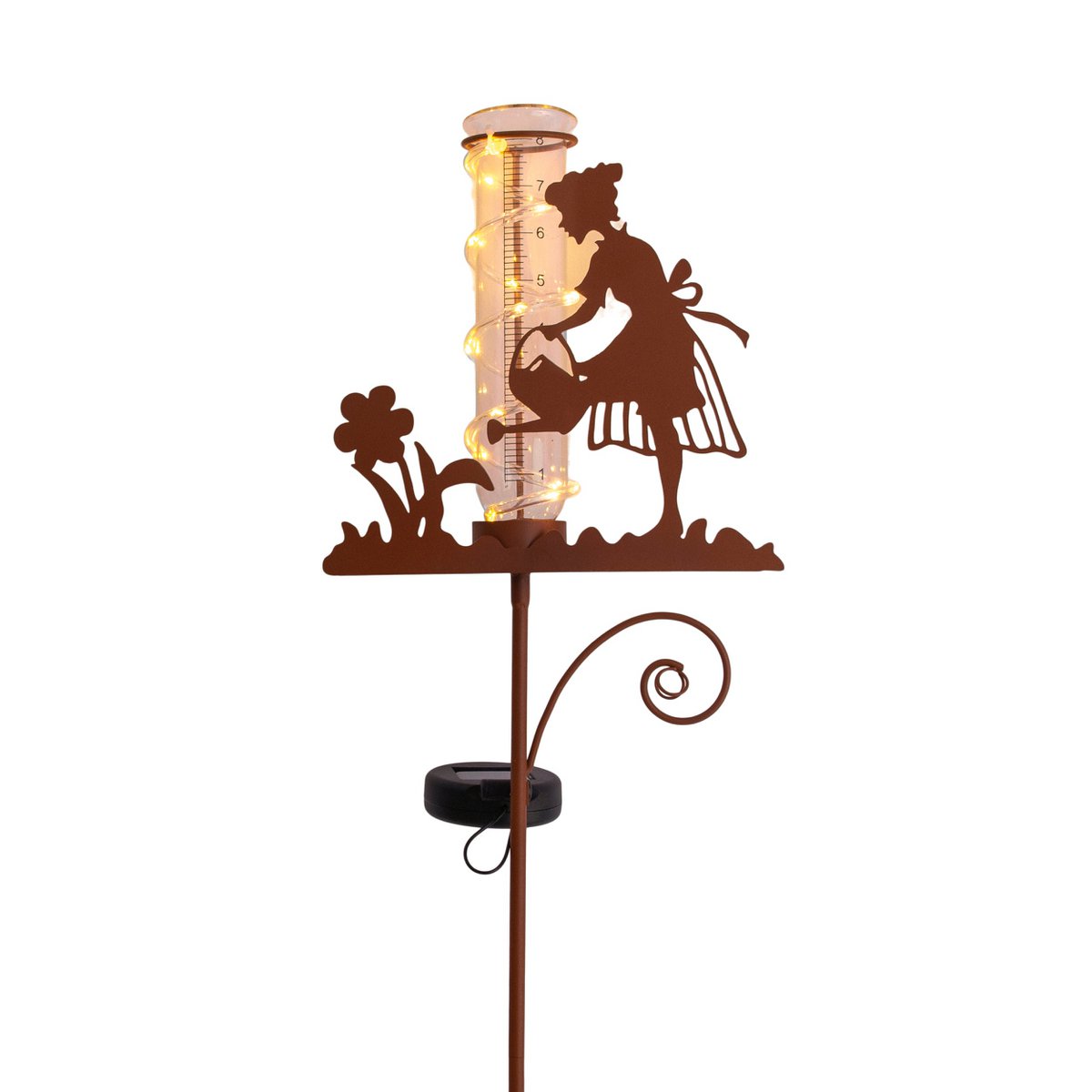 – Decoratieve regenmeter met tuinmotief en sfeervolle verlichte waterzuil