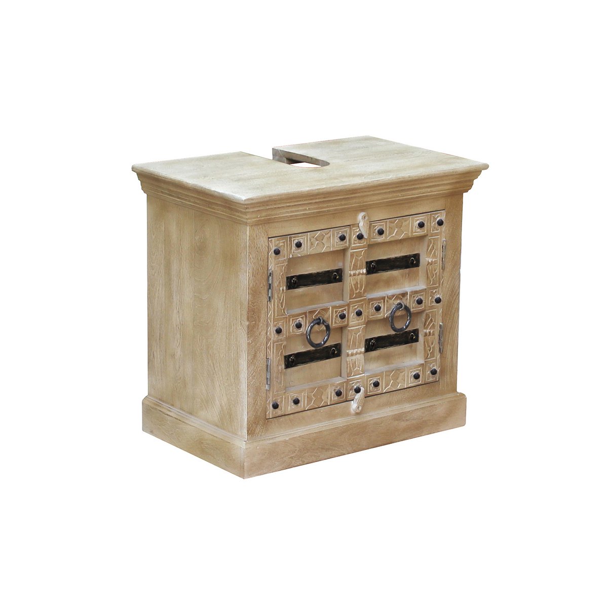 Deze spoelbakonderkast van licht mangohout is een echte eyecatcher. De opbergruimte achter de twee deuren, voorzien van uitgebreide versieringen, biedt voldoende ruimte voor je schoonmaakspullen en bedekt tevens de afvoerbuis. De onderkast siert iedere badkamer en zorgt dankzij zijn koloniale uitstraling al vroeg in de ochtend voor dat vakantiegevoel. Uitgebreide versieringen, met sifonuitsparing 16×6,5 cm.