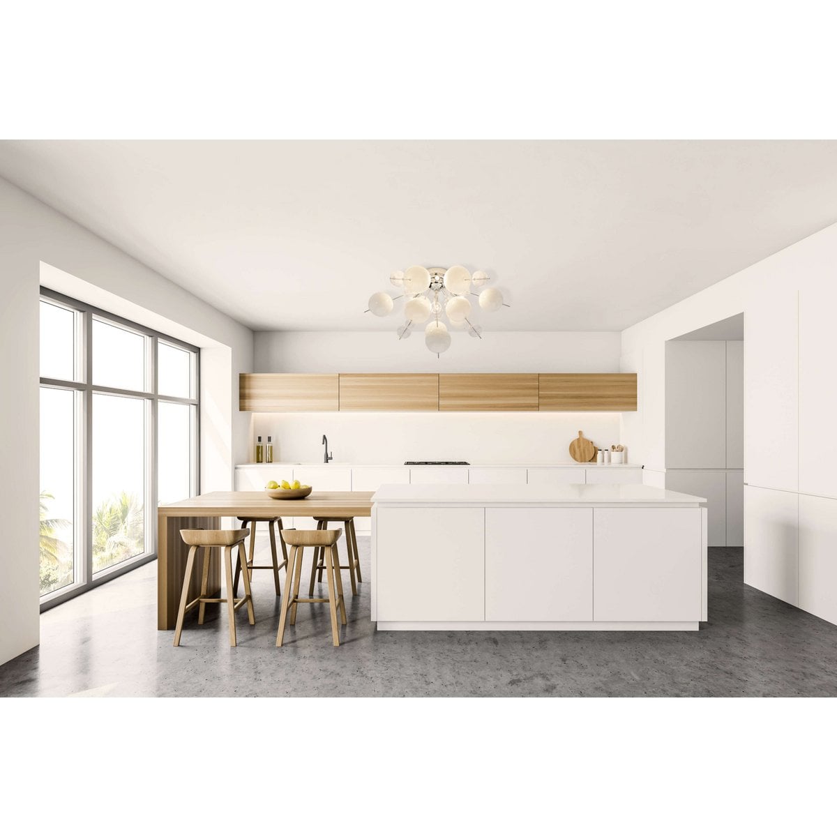 De plafondlamp Explosion is een opvallende en moderne blikvanger die direct sfeer en karakter toevoegt aan uw interieur. De combinatie van witte en heldere glazen bollen zorgt voor een luchtige en elegante uitstraling, terwijl de staven met bollen samenkomen op een glanzende chroomkleurige middenbol. Hierdoor lijkt de lamp bijna in de ruimte te zweven en ontstaat er een speels en dynamisch lichteffect.