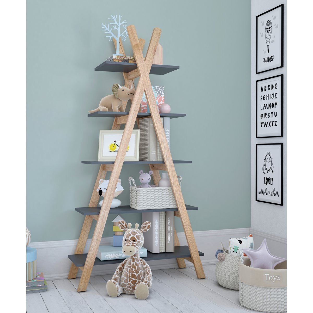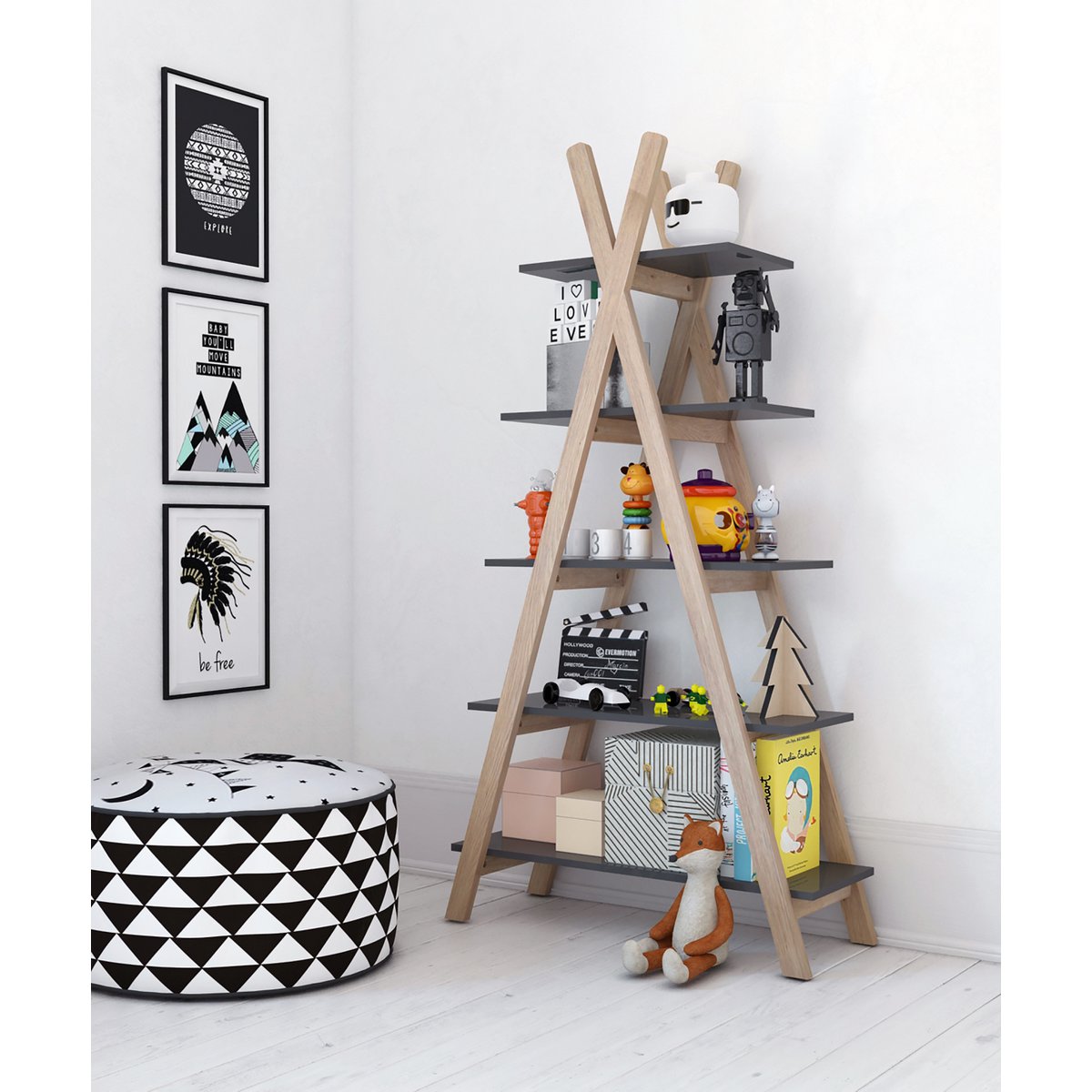 Deze plank in tipi-design is de juiste keuze voor alle slimme Indiërs. Vijf planken van verschillende lengtes bieden veel ruimte voor boeken, speelgoed en decoratieve elementen. De grenenhouten stutten vormen een natuurlijk contrast met de grijs gelakte MDF-vloeren. Het Scandinavisch-moderne ontwerp van de plank past in veel kinderkamers en wordt een blikvanger. Ook wanneer hij vrij in de kamer wordt geplaatst, bijvoorbeeld als scheidingswand, komt de tentvormige plank mooi tot zijn recht. Ofwel perfect afgestemd op de andere meubels uit de collectie of als element in een vrolijke mix & match kinderkamer, de plank integreert harmonieus in veel meubels. U kunt bijvoorbeeld vakkundig de favoriete boeken en knuffels van uw kleintje tentoonstellen.