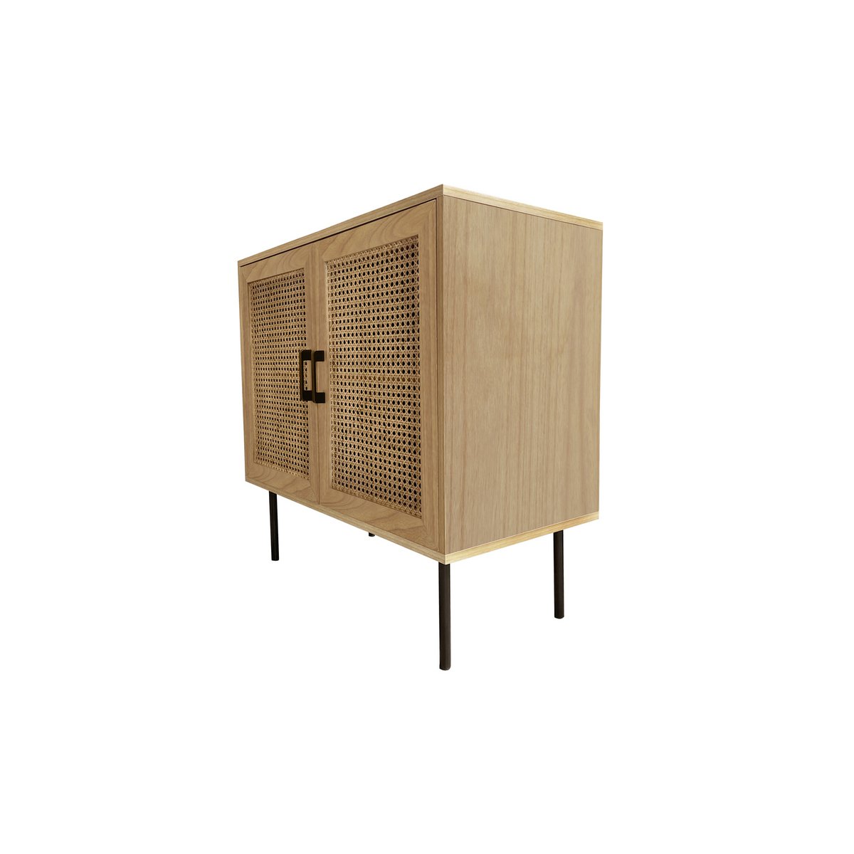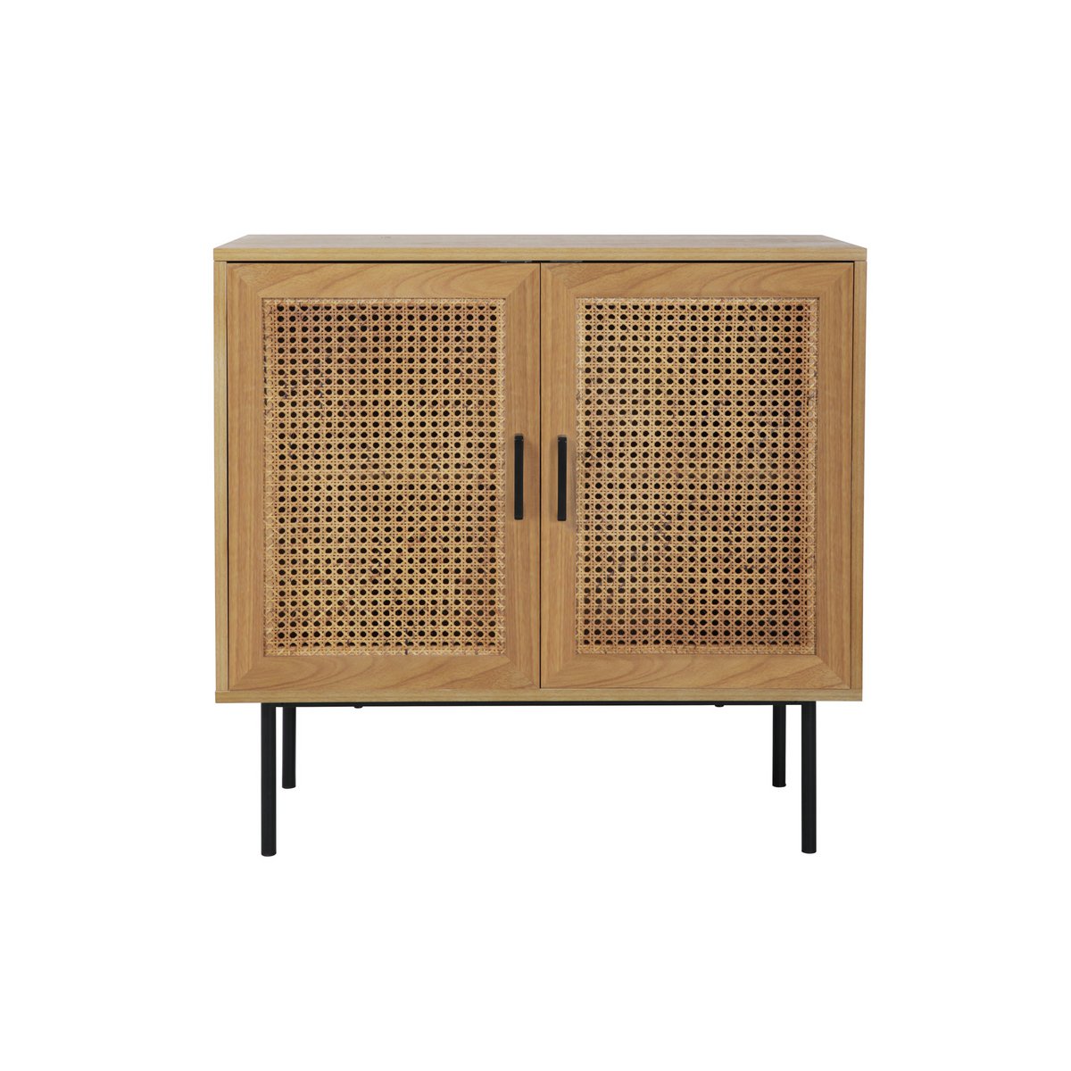 Deze naturelkleurige ladekast met rotanfront brengt een warme retro uitstraling in huis en combineert stijl met praktische opbergruimte. Achter de twee deuren met binnenplank biedt dit meubel volop afgesloten ruimte voor spullen die je netjes uit het zicht wilt bewaren.