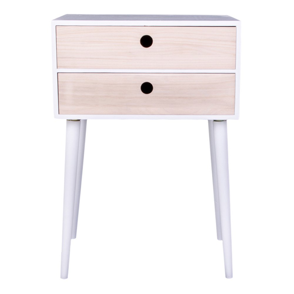 Deze Rimini bijzettafel heeft een strak en eigentijds ontwerp met een wit frame en twee laden van natuurlijk hout. Door het compacte formaat is hij perfect te gebruiken als nachtkastje of als accenttafel in elke woonruimte.