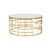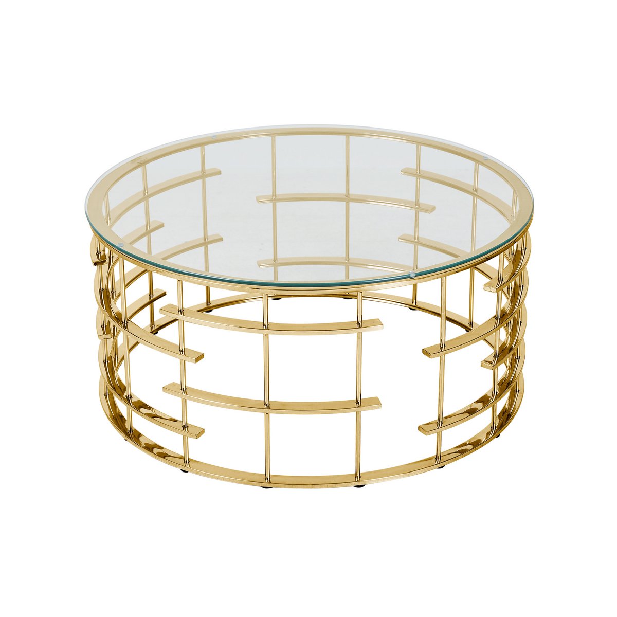 Deze ronde salontafel is een luxe blikvanger voor de woonkamer. Het heldere glazen blad zorgt voor een lichte en elegante uitstraling, terwijl het abstracte goudkleurige frame van roestvrij staal direct een glamoureus accent toevoegt. De ronde vorm combineert mooi met kubusvormige banken en fauteuils en brengt zachtheid in het interieur.