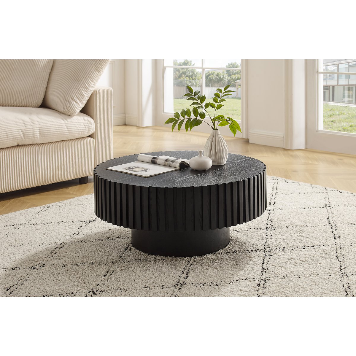 Een bijzonder detail van deze tafel zijn de massieve houten lamellen langs de zijkant van het blad. Deze verticale accenten geven het meubel extra karakter en versterken de verfijnde balans tussen strak design en natuurlijke charme. Dankzij de lage loungehoogte is deze salontafel ideaal te combineren met diepe banken en comfortabele zithoeken. Met een diameter van 80 cm biedt de tafel voldoende ruimte voor drankjes, boeken en decoratie, zonder te overheersen in de ruimte.