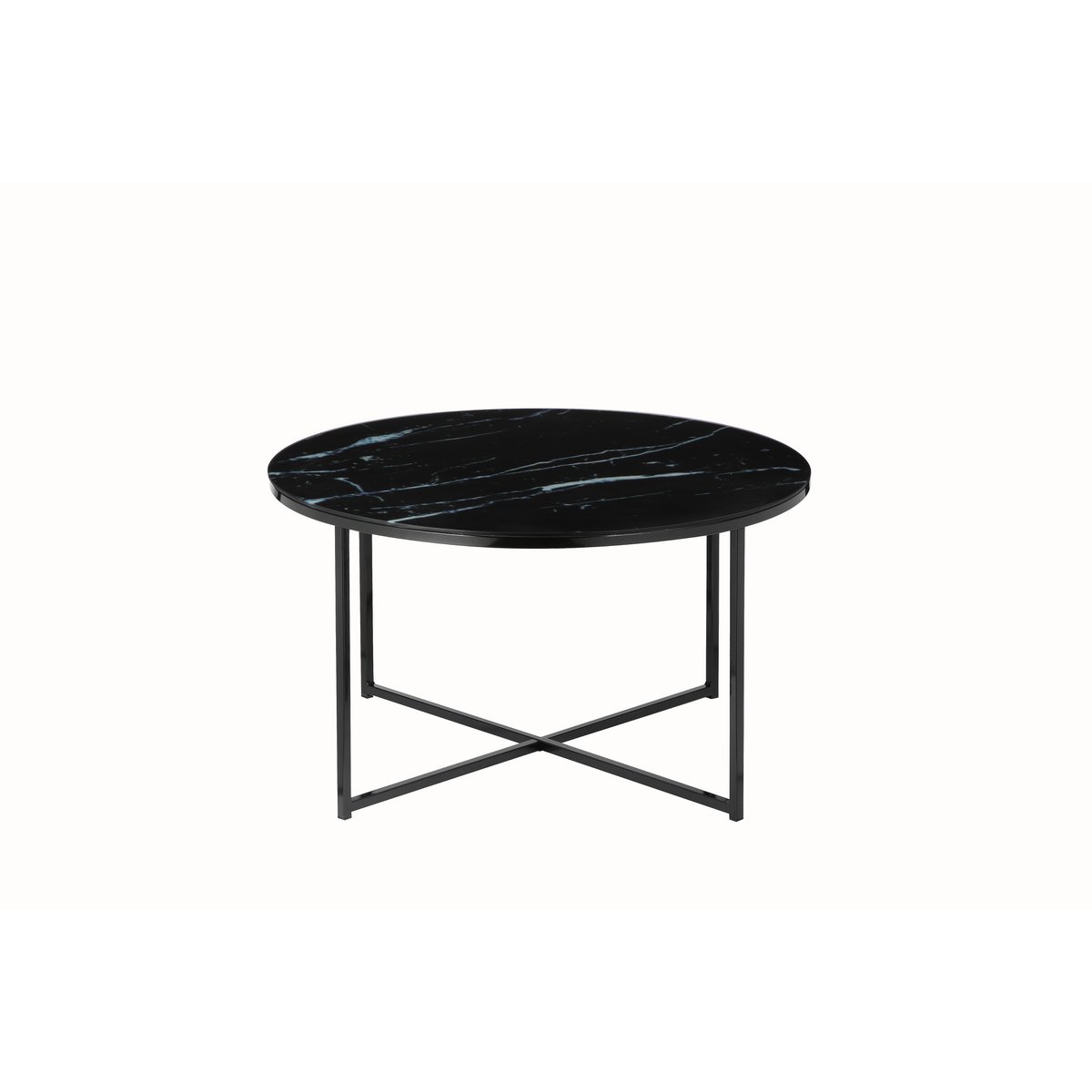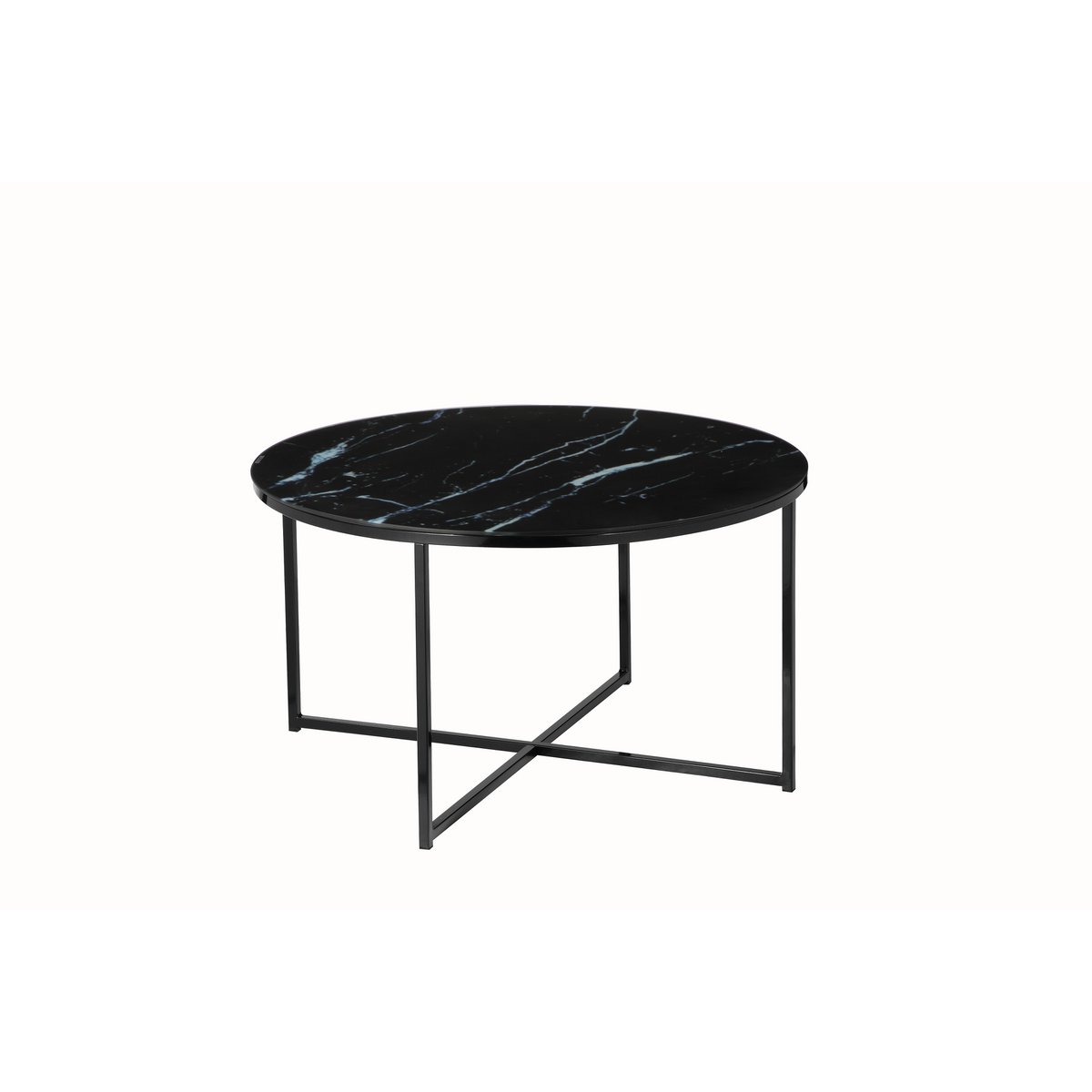 Deze ronde salontafel combineert modern design met een elegante marmerlook. Het glazen blad met daaronder een folie in zwart marmerlook geeft de tafel een luxe uitstraling, terwijl het zwarte metalen frame zorgt voor een stevig en strak contrast. Hierdoor past de tafel goed in zowel moderne als tijdloze interieurs.