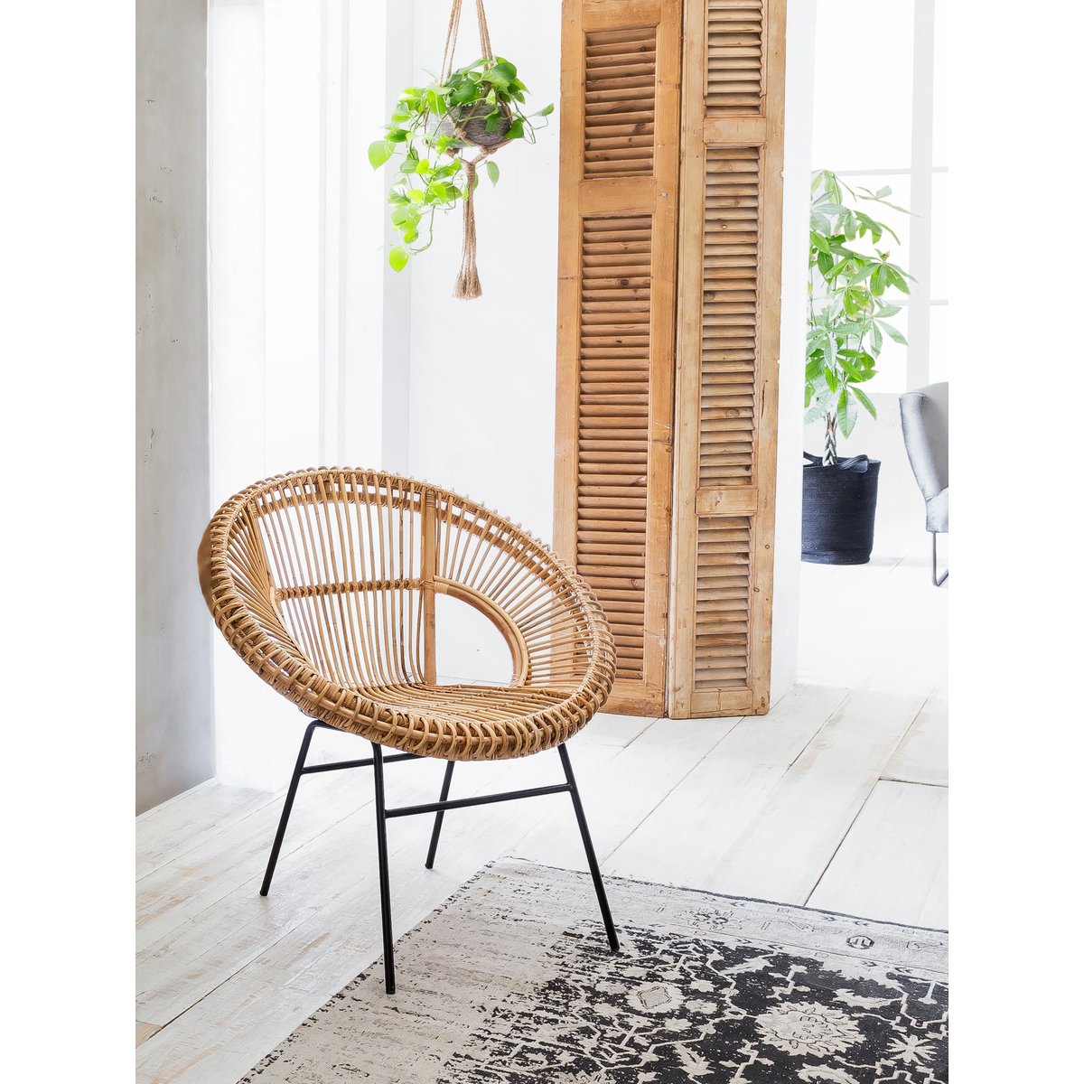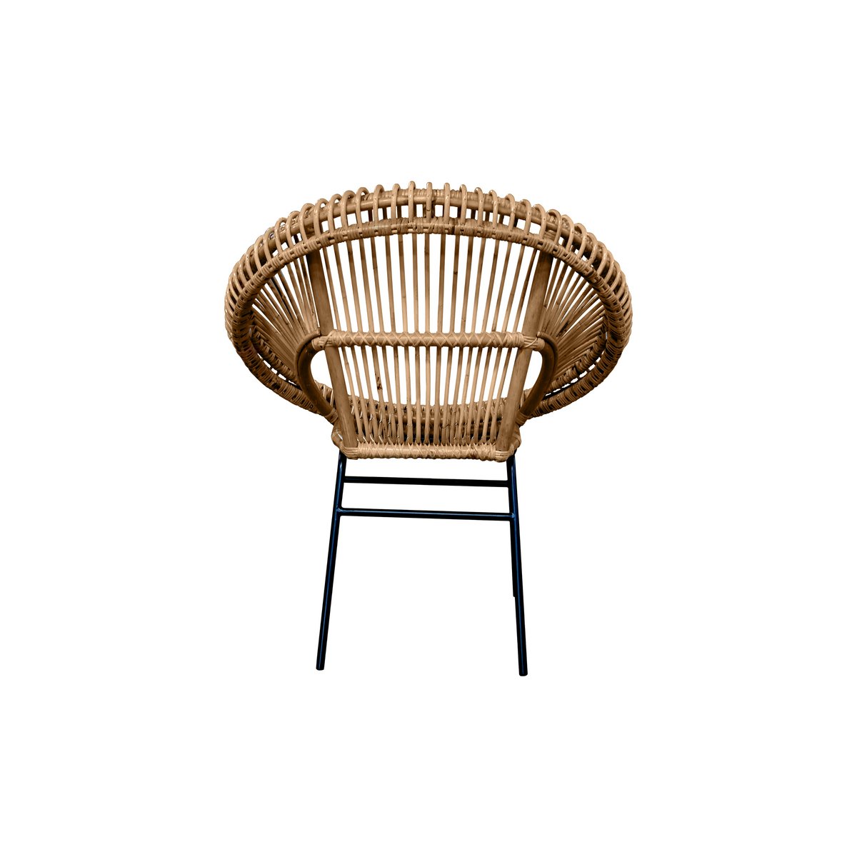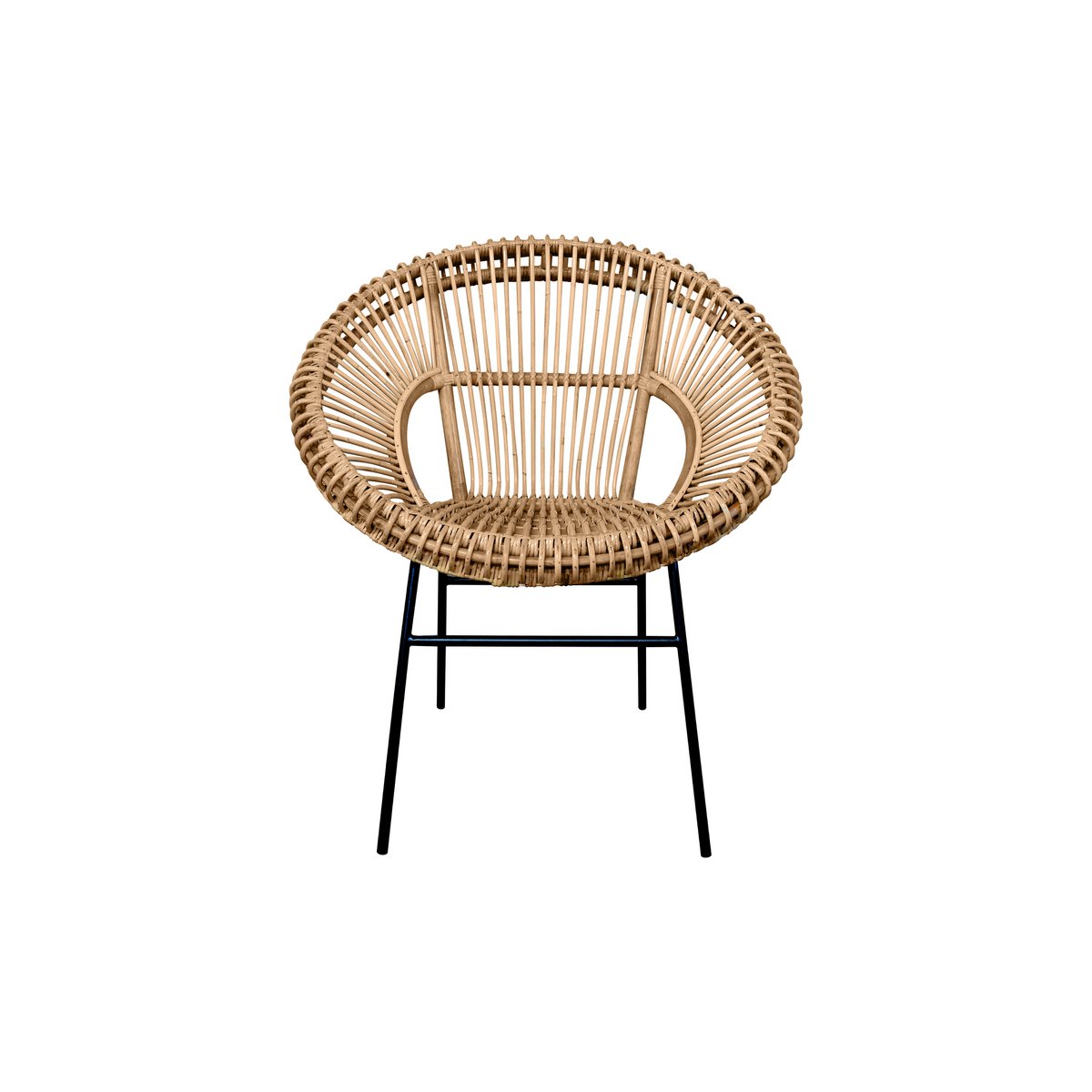 De zwarte metalen poten zorgen voor een stevig en stabiel onderstel en vormen een stijlvol contrast met het naturel rotan. Door de royale vorm en comfortabele zitmaten is deze stoel niet alleen decoratief, maar ook prettig in gebruik als eetkamerstoel of losse accentstoel.
