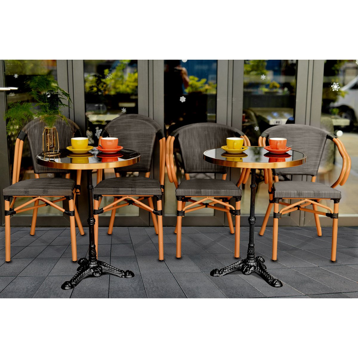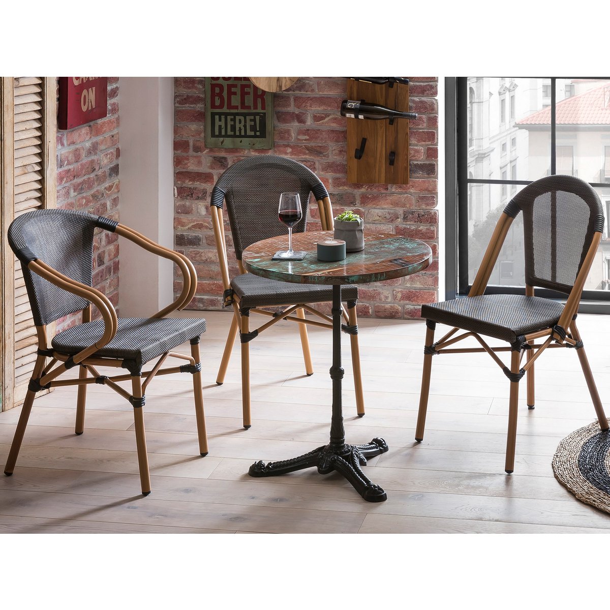 Deze rotanlook stoel combineert een warme, natuurlijke uitstraling met de praktische voordelen van moderne materialen. Het lichtbeige aluminium frame zorgt voor een stevige en stabiele basis, terwijl de rotanlook zitting en rugleuning een sfeervolle uitstraling geven die perfect past in uiteenlopende interieurs. De stoel heeft de charme van een klassieke koffiehuisstoel en laat zich moeiteloos combineren met vintage, rustieke, industriële en horeca-inrichtingen.