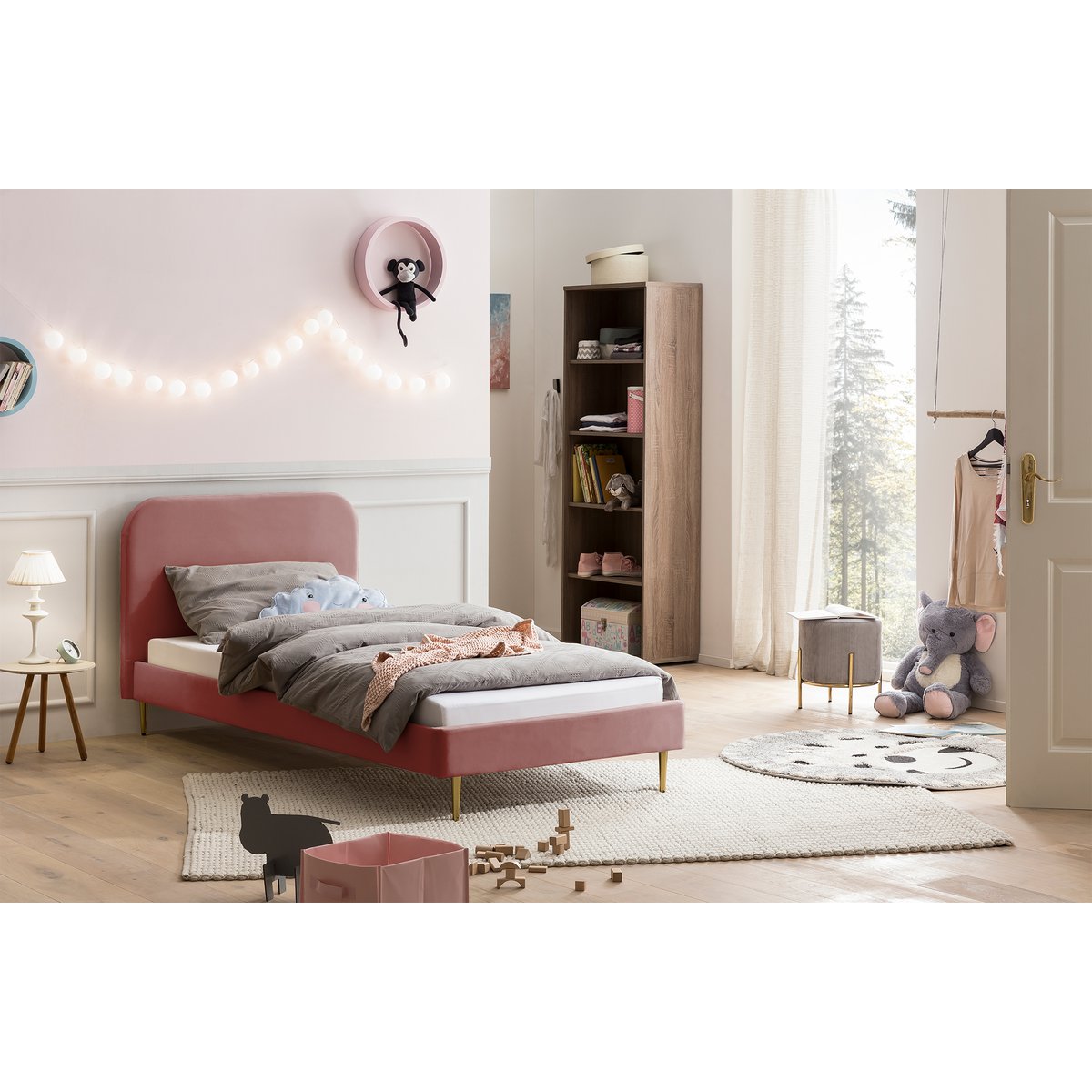 Dit gestoffeerde bed met luxe fluwelen bekleding brengt een elegante en zachte uitstraling naar de slaapkamer. Het eenvoudige ontwerp en de strakke lijnen maken het bed makkelijk te combineren met verschillende woonstijlen, terwijl de goudkleurige poten zorgen voor een modern en chic contrast. Hierdoor ontstaat een sfeervol meubel dat comfort en uitstraling moeiteloos samenbrengt.