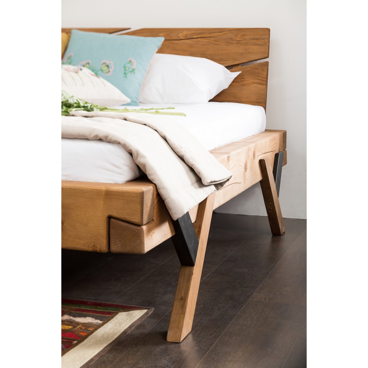 De karakteristieke hoekverbindingen benadrukken het stoere ontwerp en dragen bij aan de stevige constructie. Het frame met Y-poten en zwarte accenten geeft het bed een moderne twist, terwijl het schuin afgewerkte hoofdbord zorgt voor een luchtiger geheel. Dankzij het geoliede oppervlak is het bed onderhoudsvriendelijk en goed beschermd tegen stof en vuil. Dit balkenbed combineert traditionele charme met een eigentijdse uitstraling en is een stijlvolle blikvanger in iedere slaapkamer.