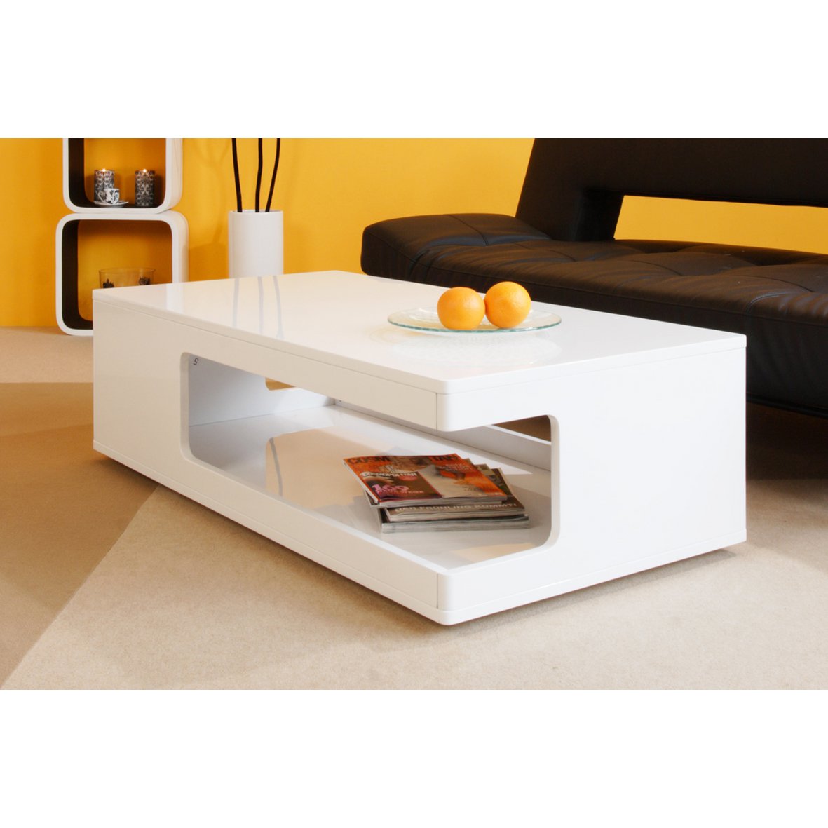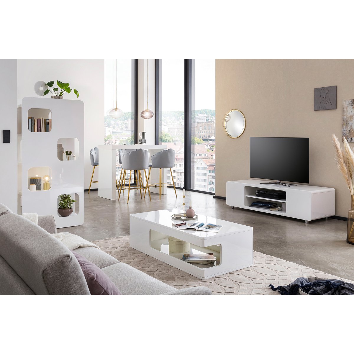 Deze moderne salontafel valt meteen op door zijn elegante accenten. De gehele salontafel is gemaakt van onderhoudsvriendelijk MDF en geschilderd in hoogglans wit. Het open opbergvak onder het tafelblad, toegankelijk via een extravagante uitsparing, zorgt voor veel opbergruimte. Er is voldoende opberg- en opbergruimte voor drankjes, snacks, tijdschriften of dergelijke. Deze woonkamertafel past heel goed in een bestaand interieur. Bijzonder opvallende contrasten kunnen worden gecreëerd met lichte of donkere meubelkleuren, zoals de modieuze zwart-witcontrasten. Met open vak en opbergruimte binnenin, vakhoogte: ca. 18,9 cm.