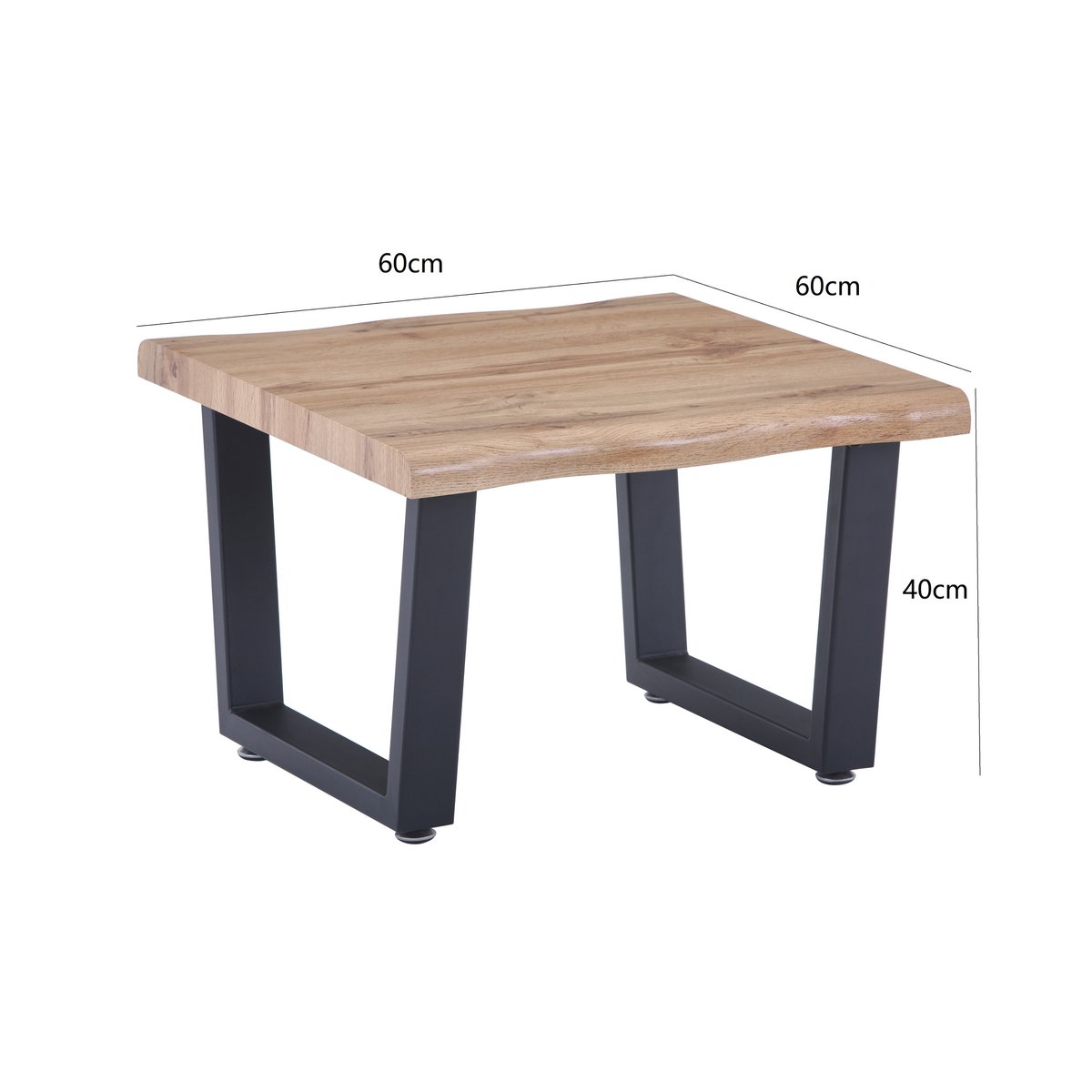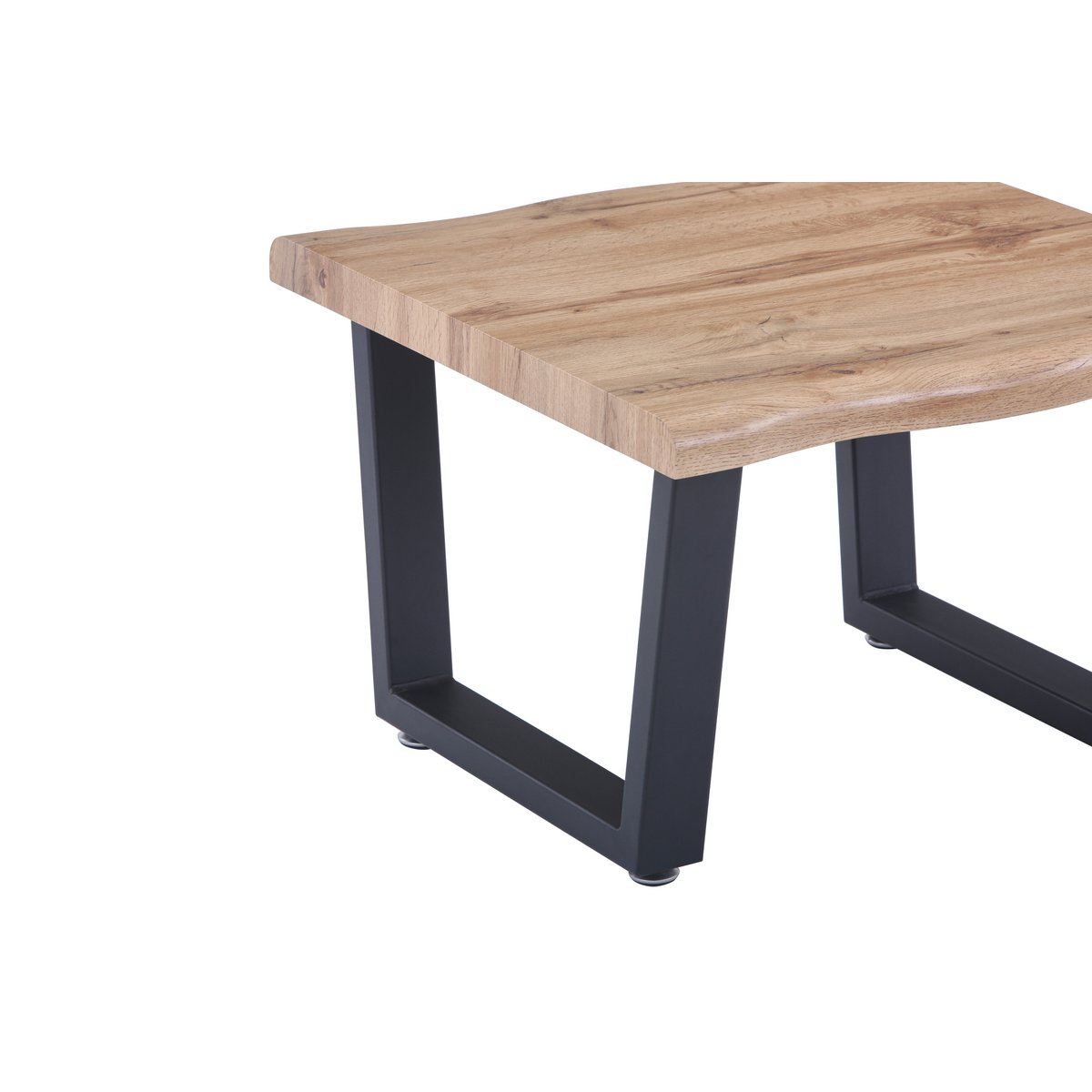 Deze moderne salontafel met een zwart metalen sledeonderstel en een dik tafelblad met wild eiken decoratie en een gesimuleerde boomrand zal een absolute eyecatcher zijn in je woonkamer. De mix van kleuren en materialen in het industriële ontwerp is tijdloos en kan met vele andere meubelstukken worden gecombineerd. Plaatdikte 40 mm, oppervlak bestaat uit een opgeplakte folie van papier met een dunne kunststof coating, gepoedercoat metaal (ijzer).